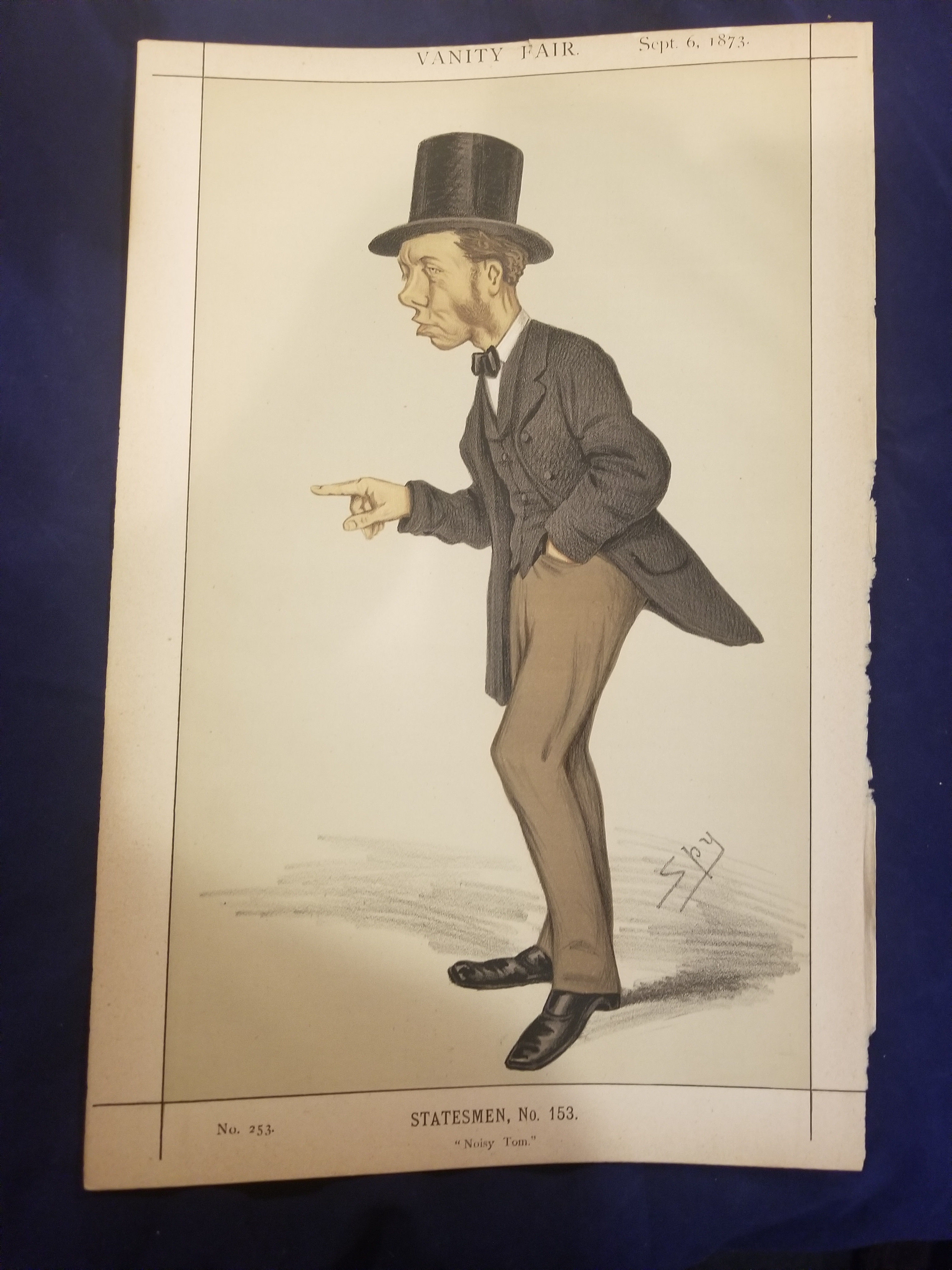 Small folio (13"x 9"), illustration, in color, No 153, Description page included. Normal aging and browning, top margin trimmed a bit, but not affecting image or text, some rough edging; otherwise very good. Vanity Fair was founded by Thomas Gibson Bowles (AKA Jehu Junior) in 1868. The first issue appeared in 1869, and this magazine would continue through 1913. Bowles wrote much of the humorous and racy commentary in the early years. Despite presenting humorous caricatures of people, along with gossip about them, most people seemed to be flattered to be selected to be in Vanity Fair. This illustration is of Thmas Collins (1825-1884) who severved in the House of Commons during the 1870s.