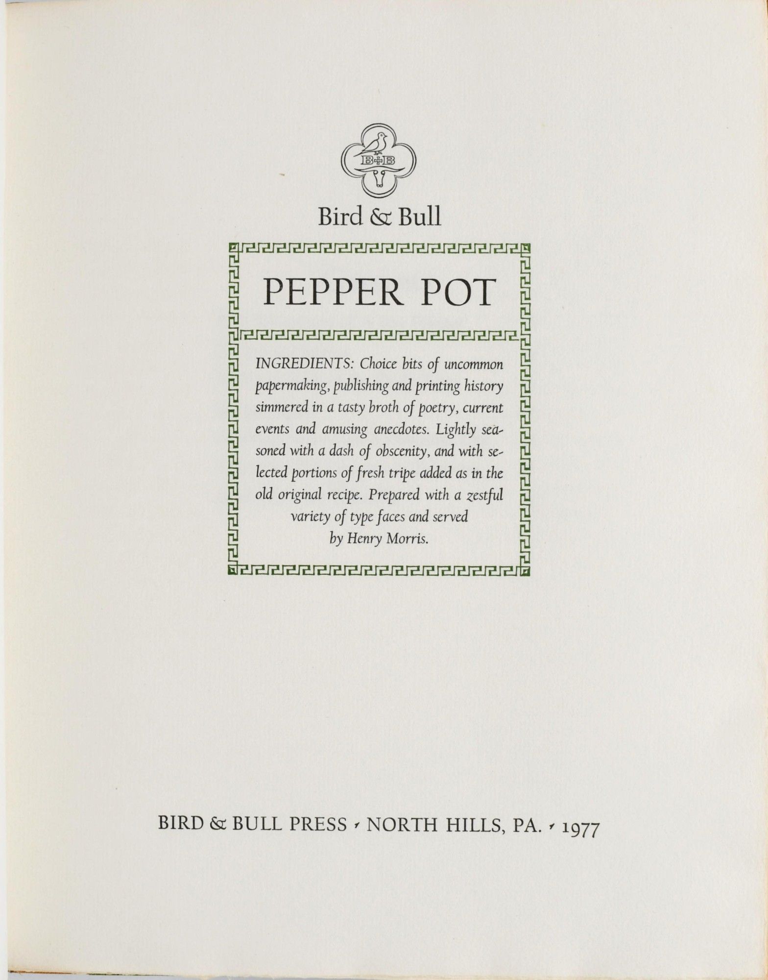 [SPECIAL PRESS] THE BIRD & BULL PEPPER POT. INGREDIENTS: CHOICE BITS OF UNCOMMON | PAPERMAKING, PUBLISHING AND PRINTING HISTORY | SIMMERED IN A TASTY BROTH OF POETRY, CURRENT | EVENTS AND AMUSING ANECDOTES. LIGHTLY SEA- |~SONED WITH A DASH OF OBSCENITY, AND WITH SE- | LECTED PORTIONS OF TRYPE ADDED AS IN THE | OLD ORIGINAL RECIPE. PREPARED WITH A ZESTFUL | VARIETY OF TYPE FACES AND SERVED | BY HENRY MORRIS.~
