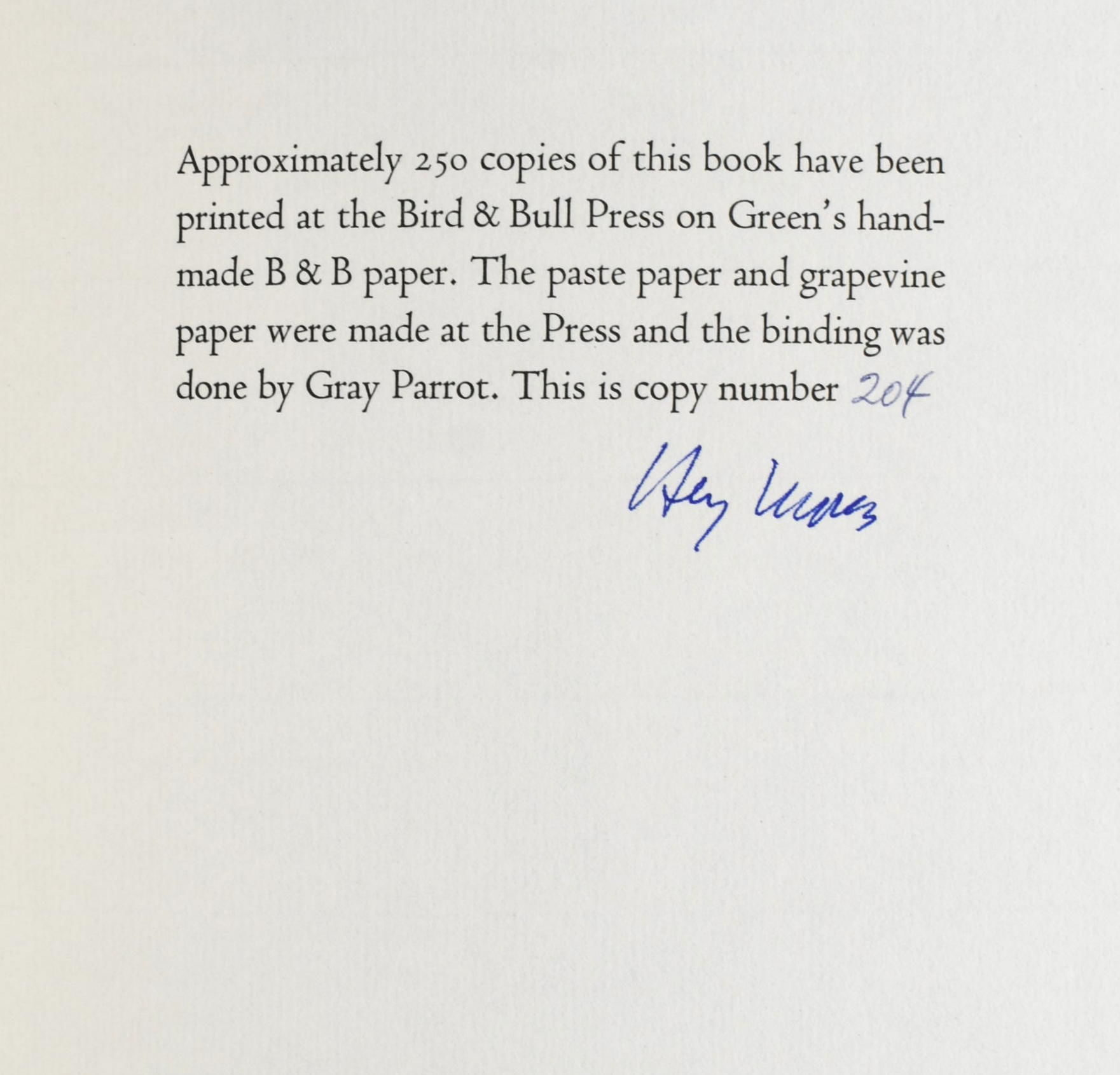 North Hills, PA: Bird & Bull Press, 1977. Limited Edition. Hard Cover. Fine binding. Signed. Quarto; in quarter tan morocco, paste paper over boards; lettered horizontally in gilt on the spine; with morocco corner tips ; [1], half-title; [3], title; [5], Contents; 7, Foreward; 8-86, text (page 23 mispaginated 27); 89, colophon. ; there is ninor loss (insect?) to the top corner of the front pastedown; the edition is limited to "Approximately 250 copies" of which this is #204 signed by Henry Morris.~~In the B&B Press bibliography, Henry Morris notes that this book was "conceived in boredom" but that he thoroughly enjoyed the writing and editing of the book. Note: "The pattern in the cover pastepaper was produced with an automobile floor mat."~~A lovely copy with the typically Morris errata slip between pages 22 and 23. And with Prospectus laid in. (Taylor, A19). Fine binding.