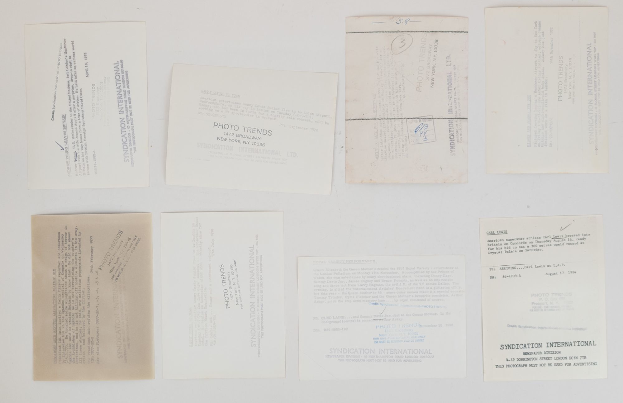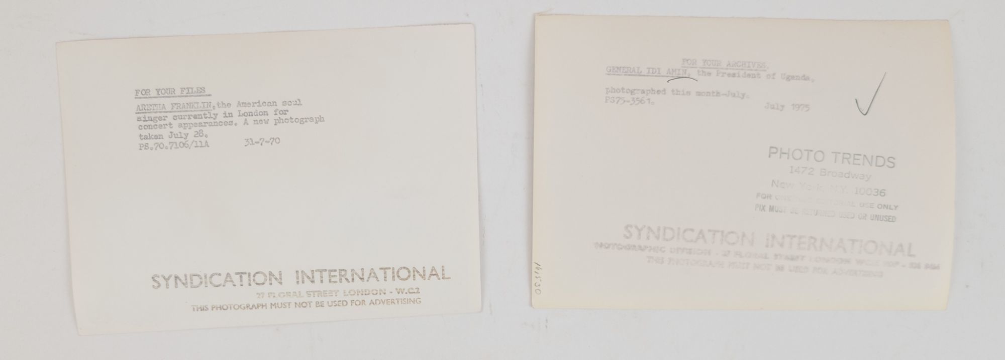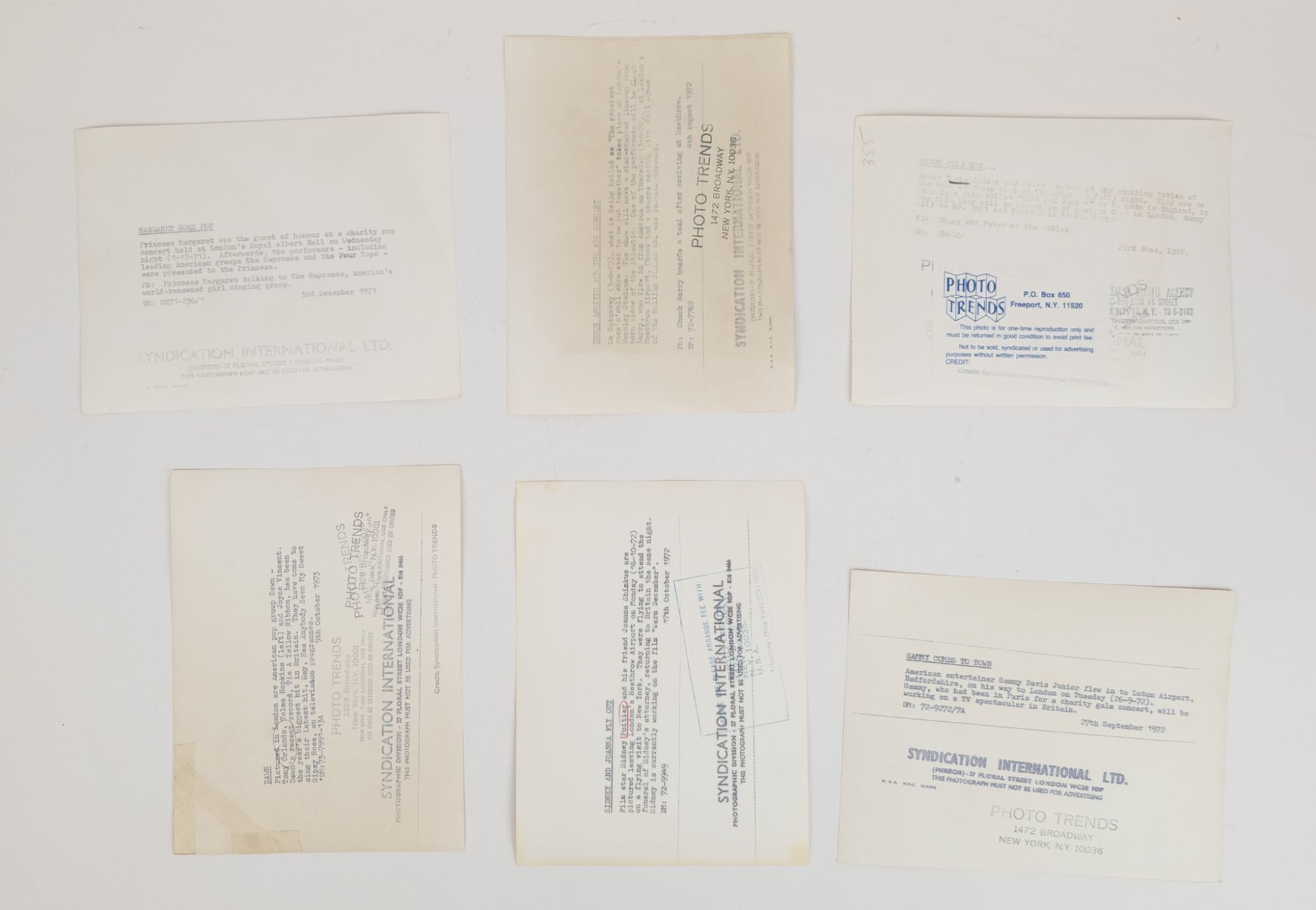New York: Syndication International/Photo Trends, 1970s. Lot of 59 black & white entertainment press photographs. Included in this lot are images of Sidney Poitier, Sammy Davis Jr., The Supremes, Aretha Franklin, Gladys Knight, Sting, Diana Ross and more. 10 Photographs measuring ~ 8" x 10", 24 measuring ~ 6.5" x 8.5", 23 measuring ~ 6" x 8", and 2 measuring ~ 4.5" x 6.5" 9". Stamped on verso with background/publisher information. Overall condition of photographs ranges from Good to Very Good. Light age toning. Light wear to edges and corners. FJ Consignment. Shelved in Rockville. 1379622. Special Collections.