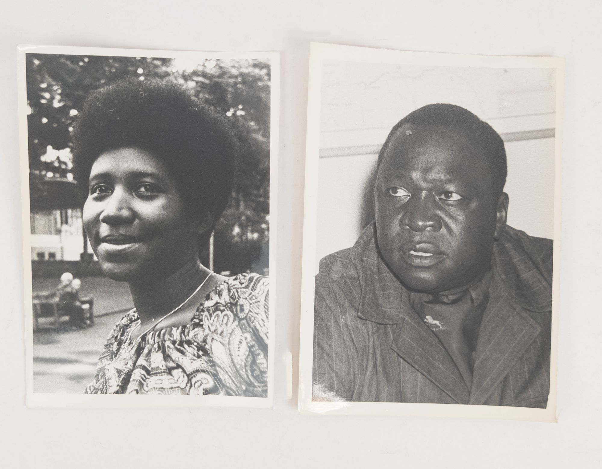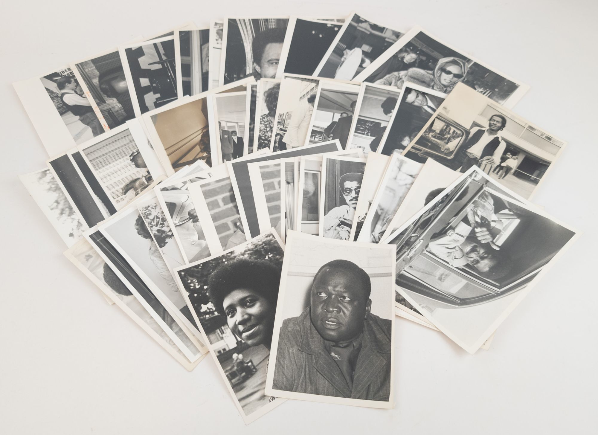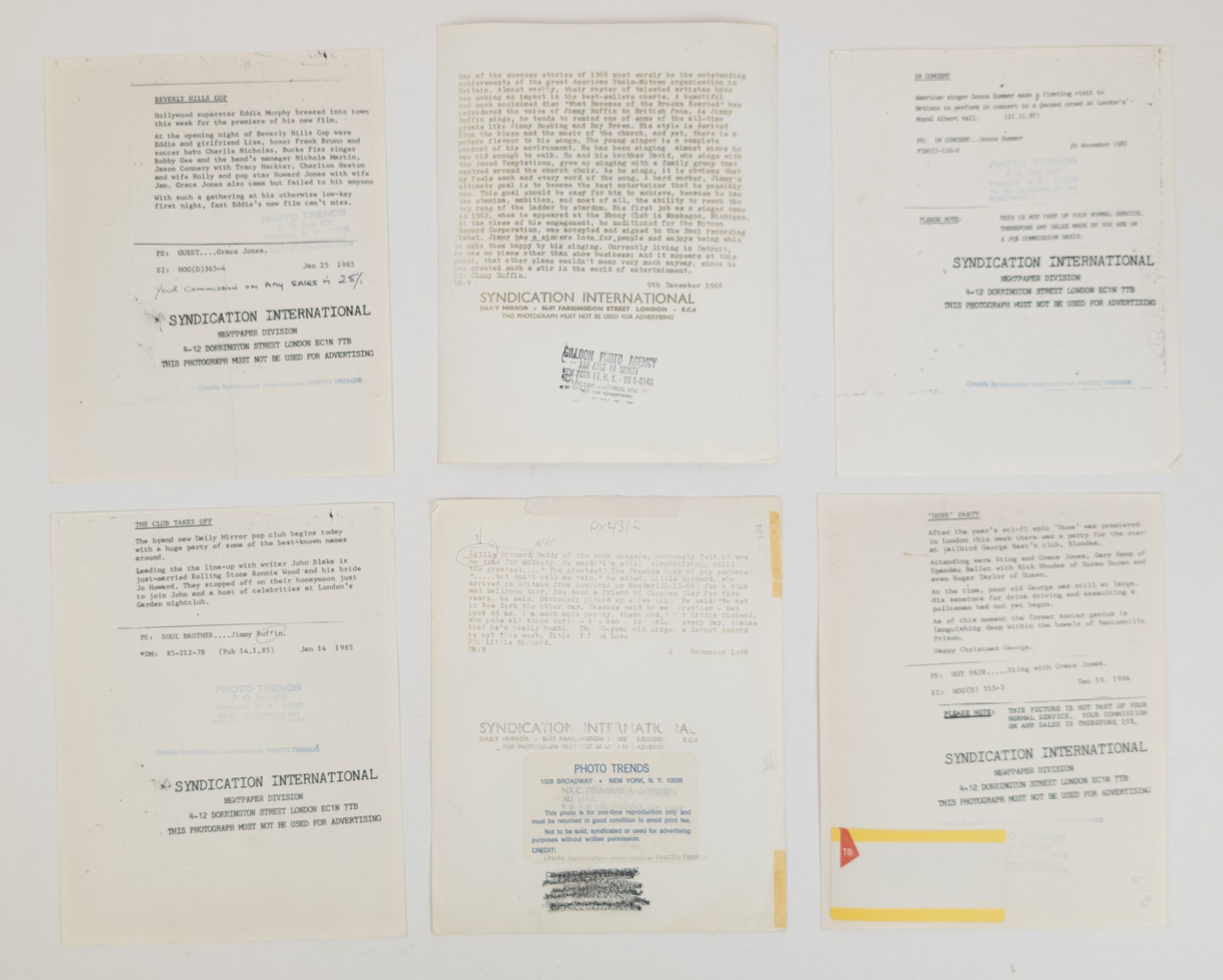 New York: Syndication International/Photo Trends, 1970s. Lot of 59 black & white entertainment press photographs. Included in this lot are images of Sidney Poitier, Sammy Davis Jr., The Supremes, Aretha Franklin, Gladys Knight, Sting, Diana Ross and more. 10 Photographs measuring ~ 8" x 10", 24 measuring ~ 6.5" x 8.5", 23 measuring ~ 6" x 8", and 2 measuring ~ 4.5" x 6.5" 9". Stamped on verso with background/publisher information. Overall condition of photographs ranges from Good to Very Good. Light age toning. Light wear to edges and corners. FJ Consignment. Shelved in Rockville. 1379622. Special Collections.