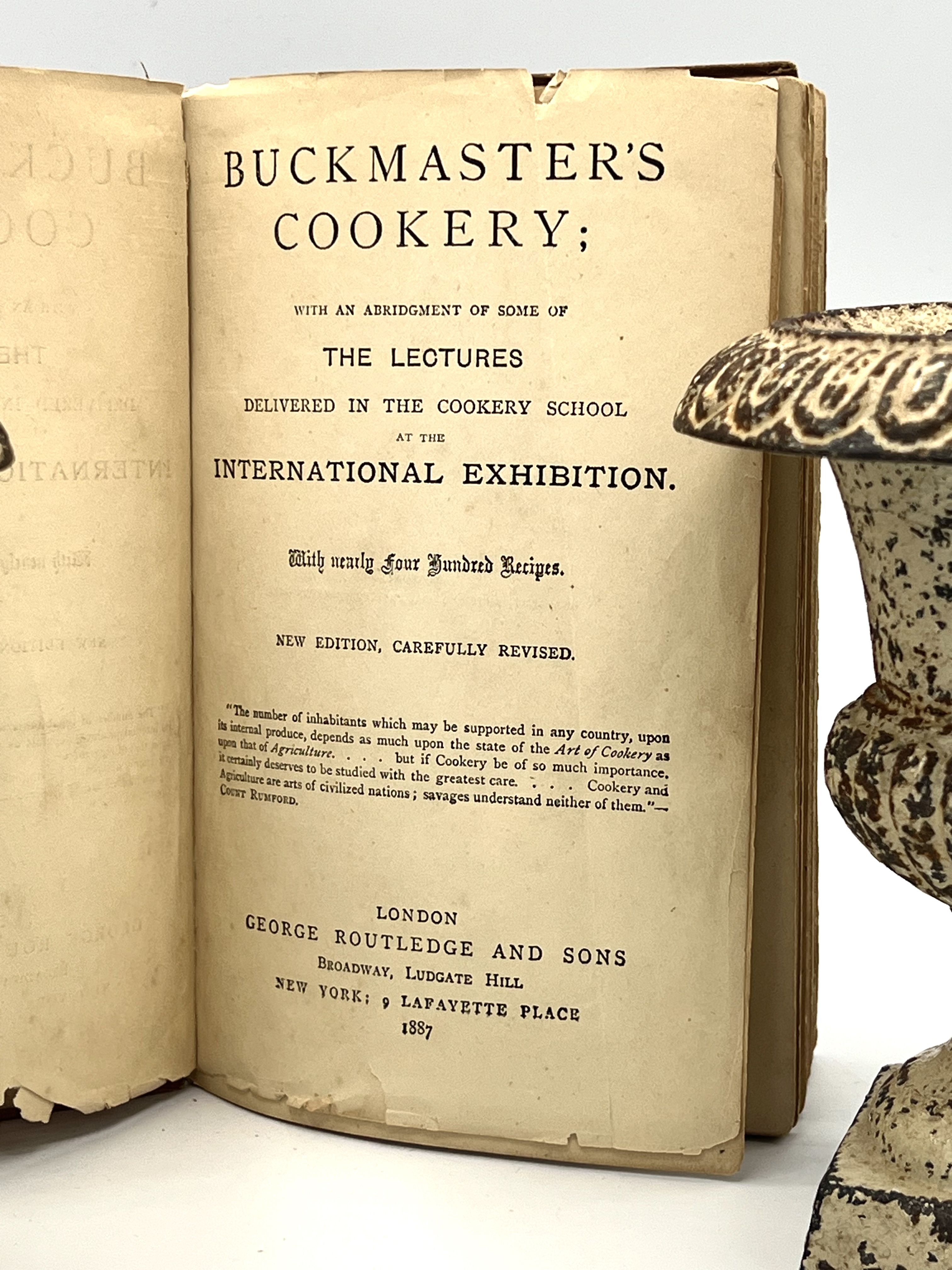 London: George Routledge and Sons, 1887. Hardcover. Brown cloth covered boards. Good. 304 pages. 16.5 x 10.5 cm. Following the success of the Great Exhibition of 1851 there was a demand for lectures and demonstrations especially cookery lectures. This project was so popular and trendsetting that Queen Victoria and Princess Louise insisted on attending (this book is dedicated to the Prices Louise). Included in this edition is a fascinating lecture Buckmaster gave on the history of 'Early English food and cooking'. Also included in this edition is the lecture that the Queen and her daughter attended. Boards heavily rubbed, hinges cracked but holding