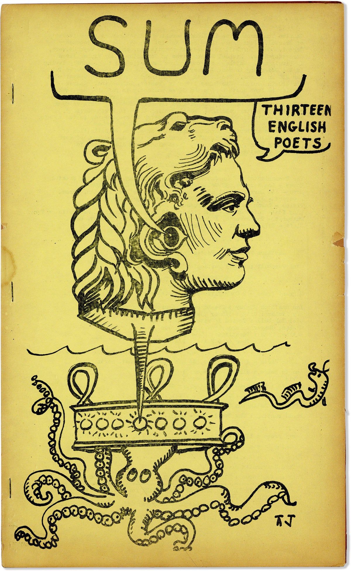 Buffalo: Sum, 1965. First edition. Thin yellow illustrated wraps, stapled; legal-size. Fragile and scarce mimeo magazine begun after the famous Olson, Creeley et. al. poetry seminars of 1963 in Vancouver, BC. This issue with poetry by Basil Bunting, Tom Raworth, Gael Turnbull, Tom Pickard, Roy Fisher, Charles Tomlinson, John James, Michael Shaer, Mathew Mead, Ansem Hollo, Jim Burns, Andrew Crozier, and John Temple. Acidic paper toned as usual, back cover detached else very good. One of seven issues.