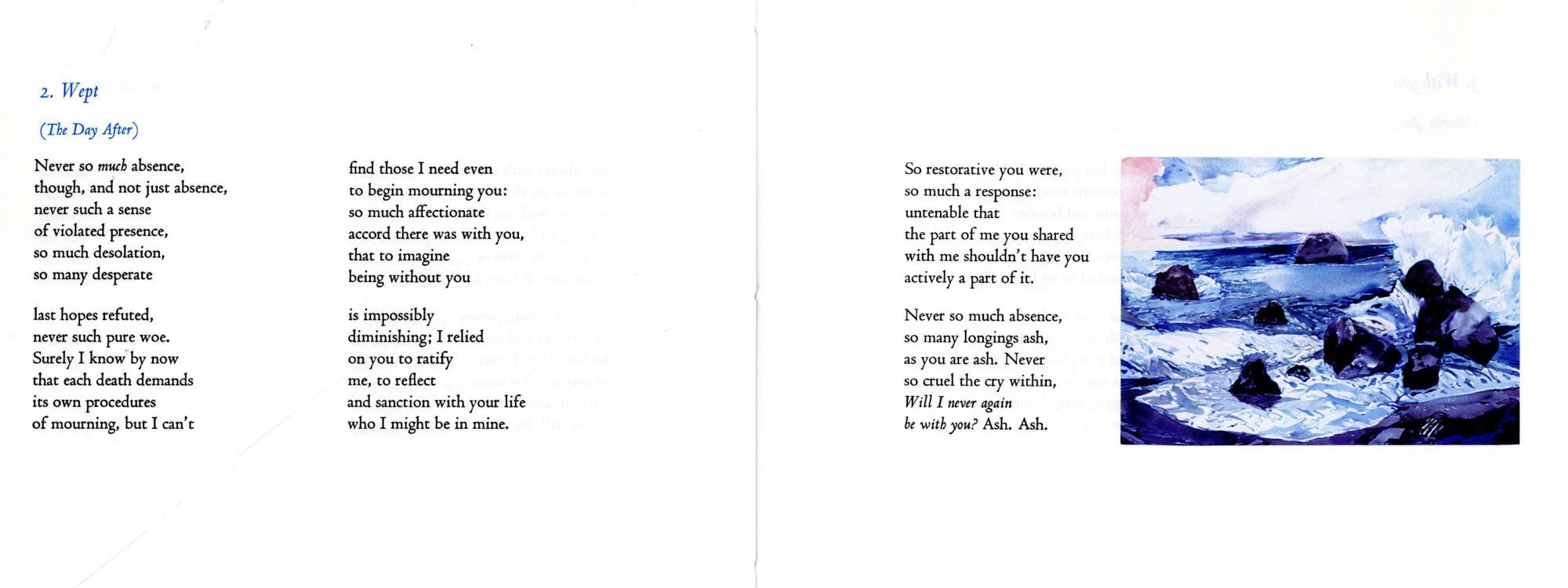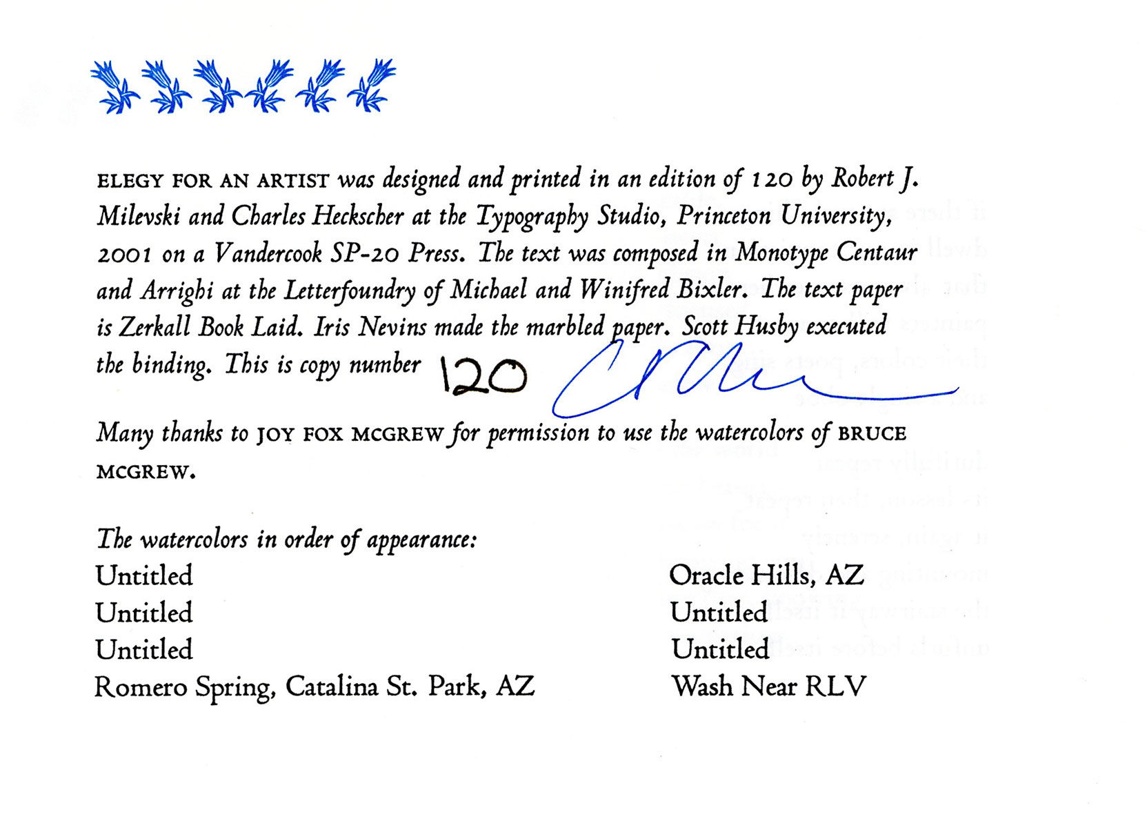 Princeton, NJ: The Typography Studio, 2001. First Edition. Pamphlet of marbled paper card wrappers, printed paper label; large, oblong 8vo, 8 watercolor illustrations by Bruce McGrew tipped in. First edition of this suite of poems for artist Bruce McGrew (1937-1999). One of 120 numbered copies signed by Williams. First printing of the poem, later in Threepenny Review. Lovely production and a Fine copy.