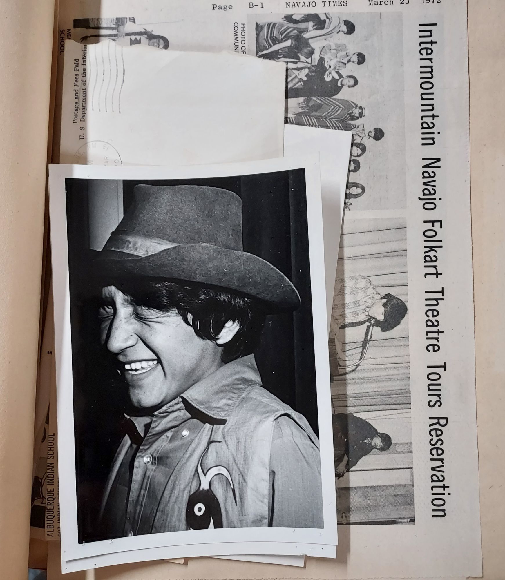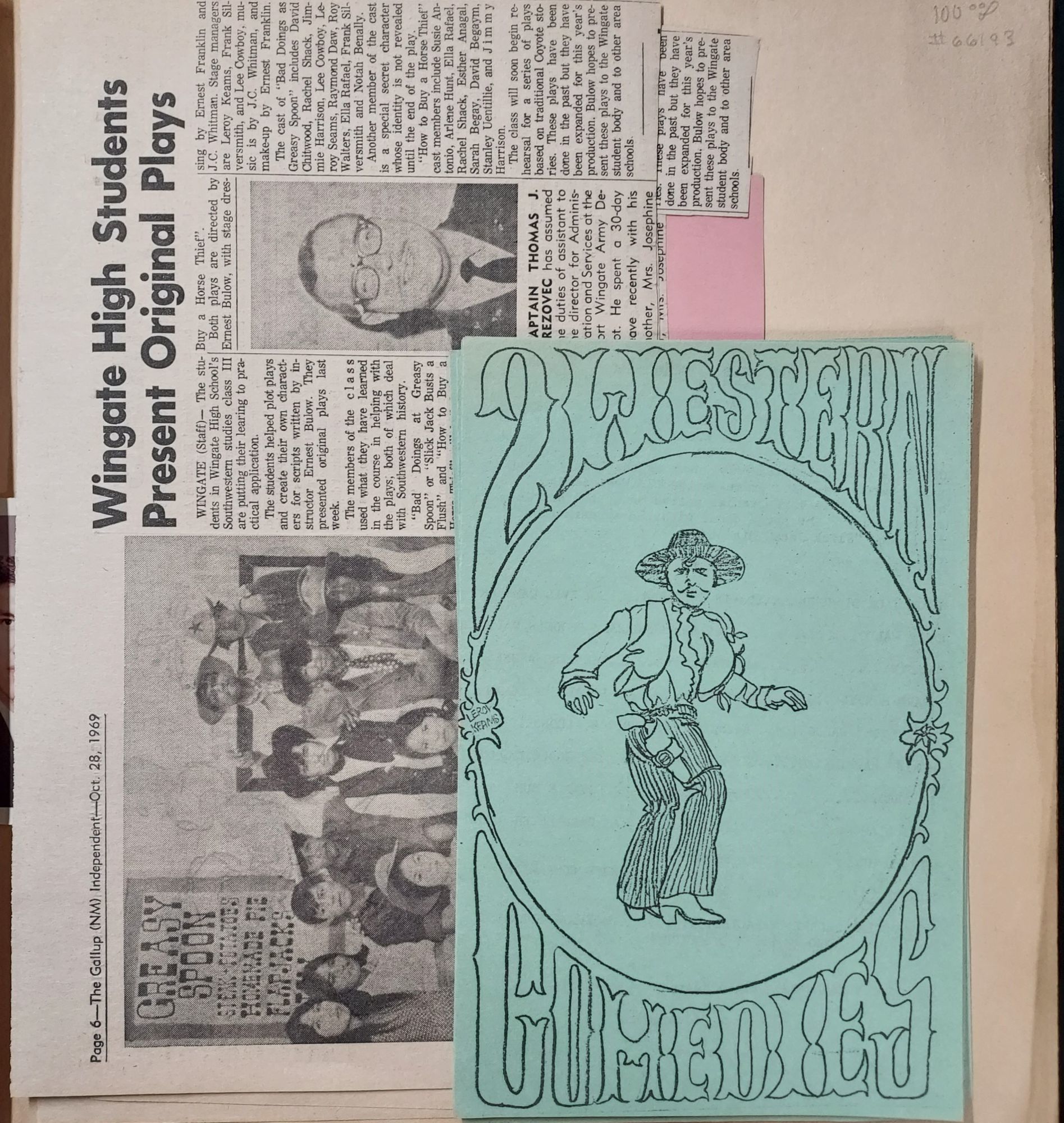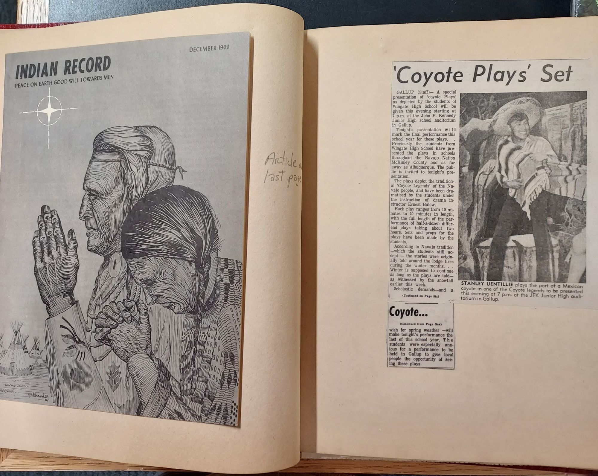 1970. Quarto [32 cm] Red boards with a string tie binding. Includes newspaper clippings, programs for high school theatrical performances, correspondence regarding the productions, and articles such as "Wingate youths present Indian lore in drama" published in "Indian Community Action" and "Navajo Legends Increase English Proficiency" published in "Indian Record December 1969." Most is loosely laid in. An early scrap book belonging to bookman and publisher Ernie Bulow documenting his theatrical experiences as cultural arts instructor / script writer at Wingate High School in Fort Wingate, New Mexico.