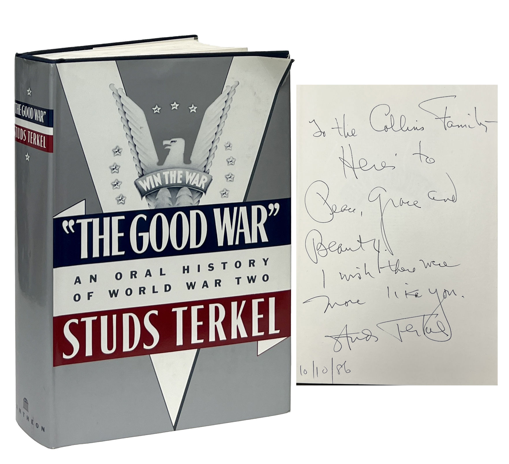 New York: Pantheon Books, 1984. First Edition. Hardcover. Near Fine/Very Good. Inscribed by Terkel on the front endpaper. Near Fine in a Very Good jacket, unclipped ($19.95), a closed tear at the top edge. Blue cloth with white ink lettering on the spine. Square and firmly bound, remaindered at the top edge, clean internally. Terkel's Pulitzer Prize-winning history of World War II.