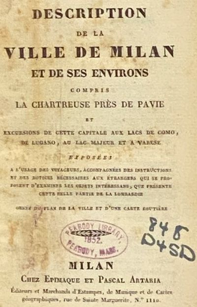 Milan: Chez Epimaque et Pascal Artaria, 1834. Hard Cover. Very Good/No Jacket. Nicely rebound - red cloth spine, paper over boards, gilt titles. Small stamp of Peabody Library appears twice inside, with their number on title page, owner bookplate on front endpaper, ink initials on half-title page. 1834 Hard Cover. 264, viii pp. 12mo. 5 3/4 x 3 7/8. French text. Includes two fold-out maps and a fold-out engraving of the Duomo di Milano. A 19th century guide to Milan focusing on local architecture and other picturesque site-seeing opportunities.