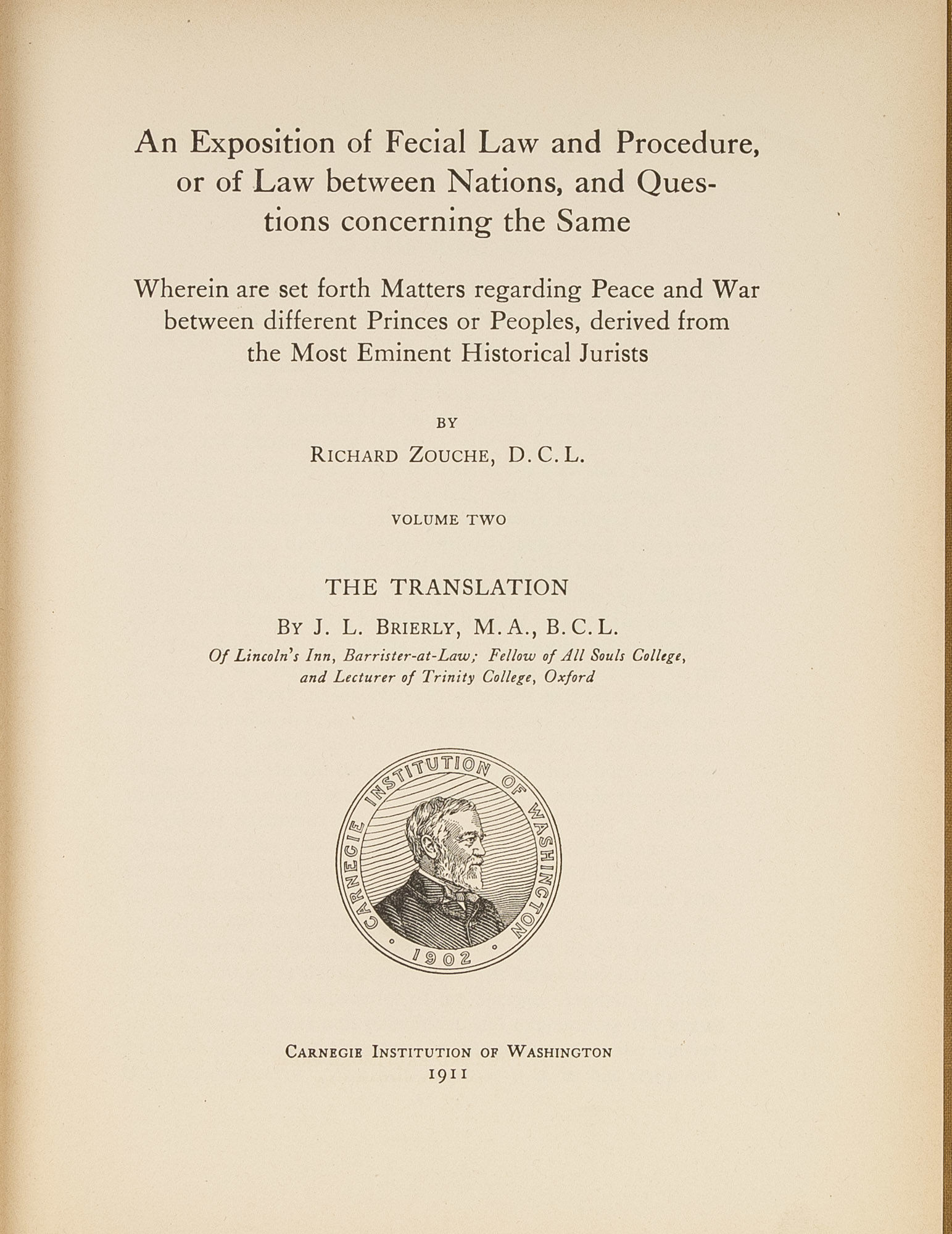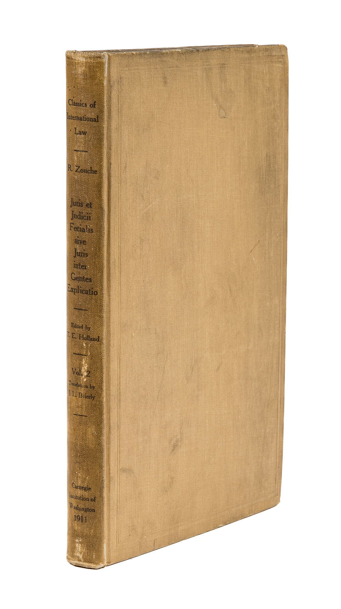 1911. Zouche, Richard [1590-1661]. An Exposition of Fecial Law and Procedure, or of Law Between Nations and Questions Concerning the Same. Translated by J.L. Brierly. Washington: Carnegie Institution, 1911. xvii, 186 pp. The complete English translation. Ex-library with publisher's cloth, lightly rubbed and soiled, ink shelf location label to front pastedown, property stamp to front free endpaper, otherwise internally clean. $85. * A title in the Carnegie Classics of International Law series.