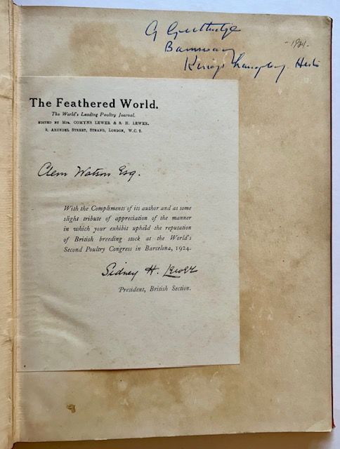 London: The Feathered World, 1924. Boards. Very Good. The wonderful 1924 "souvenir and handbook of the British section of the World's Poultry Congress (the 2nd such Congress ever held), in Barcelona and Madrid". Published by the trade journal "The Feathered World" of London. Solid and VG in its red boards, with bright gilt-titling along the front panel. Light bumping at the upper tips, very mild soiling to the panels, small, neat former owner name at the front free edpaper. Includes "14 coloured and 135 other illustrations" throughout. Also includes a tipped-in letter from "Feathered World", signed by its author (Sidney Lewer) to the former owner of this copy (Clem Watson), one of the exhibitors of "the World's Second Poultry Congress in Barcelona, 1924