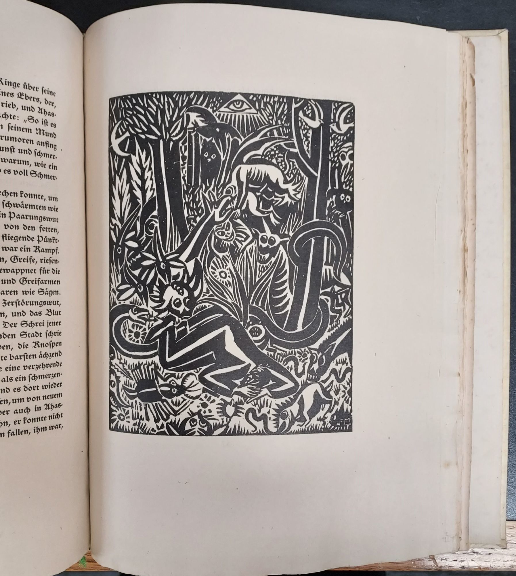 Leipzig: Insel-Verlag, 1921. Limited Edition. Very Good. 94pp. Octavo [25.5 cm] Hand tied original full vellum with Masereel vignette on the front panel. Titles printed in black on the backstrip and front panel. The boards show minor age toning and a bit of warping, which is often the case with vellum boards. Gentle foxing to endsheets. Includes twelve woodcuts by Frans Masereel (eight are full page). This edition was limited to two hundred numbered copies, this is copy 27. Translated from Flemish to German by Anton Kippenberg.