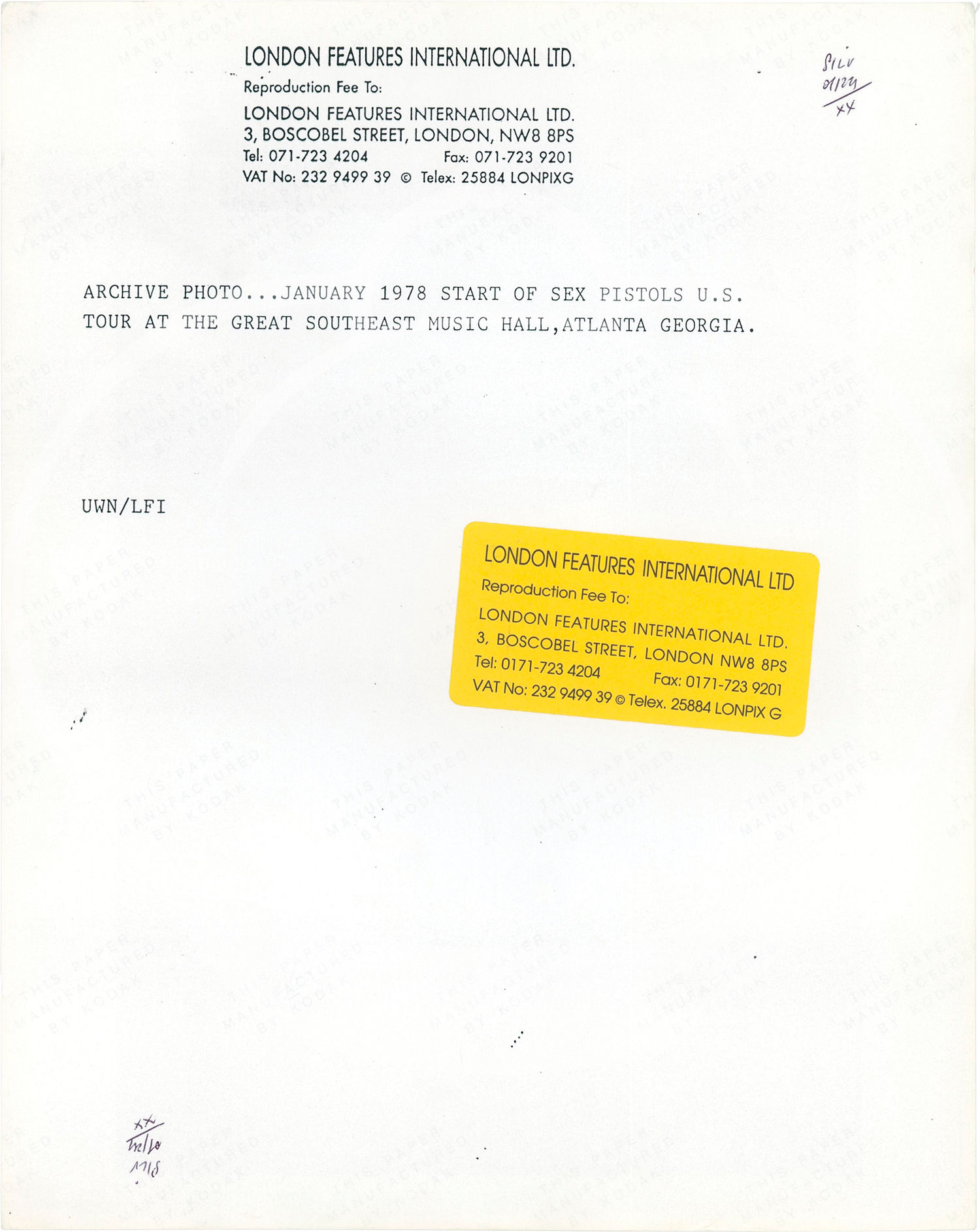 London: London Features International, 1978. Vintage photograph of the Sex Pistols during the first performance of their 1978 US tour, at the Great Southeast Music Hall in Atlanta, on January 5, 1978. Mimeo snipe and the label of London Features International on the verso.