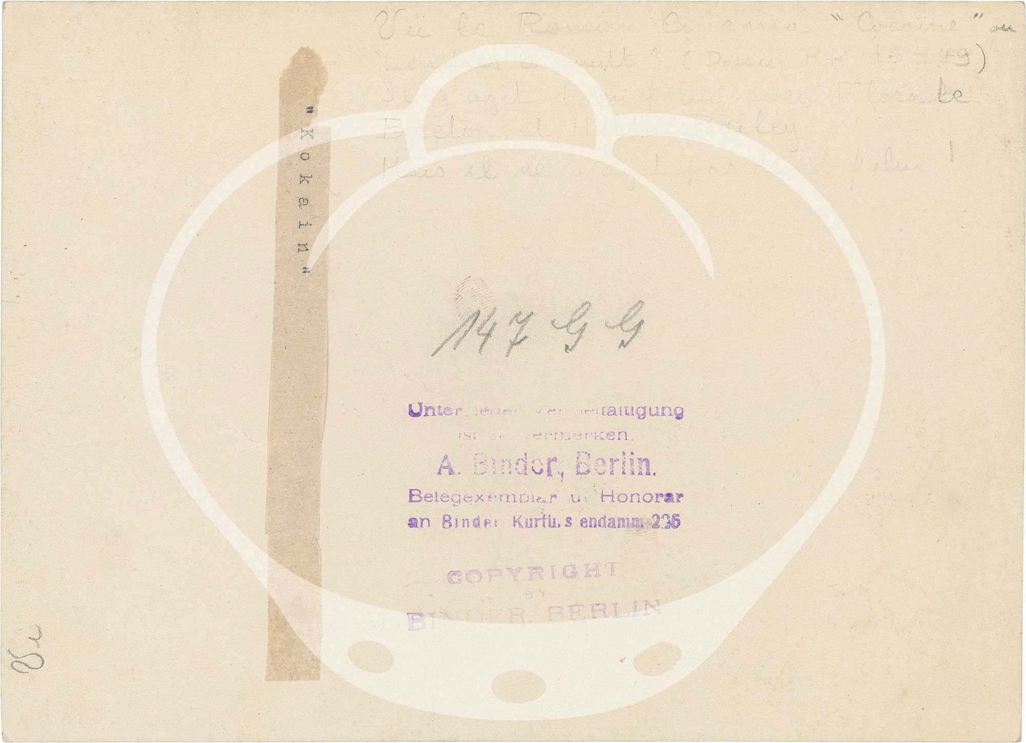 Insignia of photographer Alexander Binder from the negative at the bottom right corner the recto, with Binder's stamp and a printed mimeo snipe on the verso.