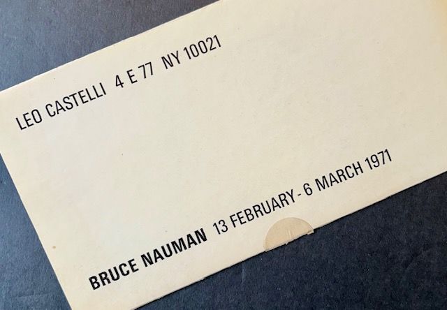 New York: Leo Castelli, 1971. Single sheet. Very Good +. The untitled, single sheet exhibition poster/mailer (on card stock) for the February 13th--March 6th 1971 Bruce Nauman exhibition at Leo Castelli in New York. Neatly folded in thirds, just a touch of light soiling at the middle panel. The poster is unaddressed and unmailed. On the rear what looks like a triptych of 3 encircled nipples, 1 per panel.