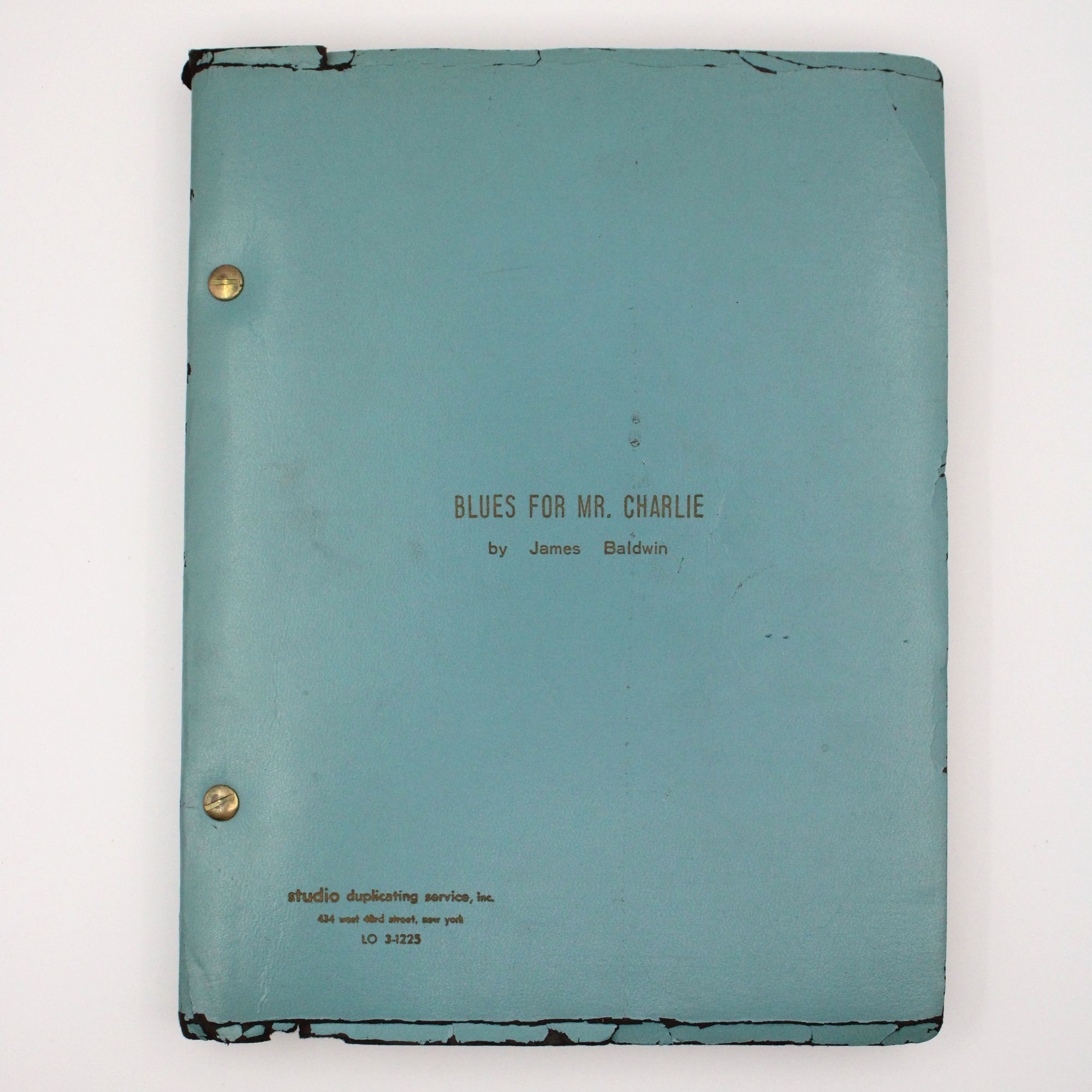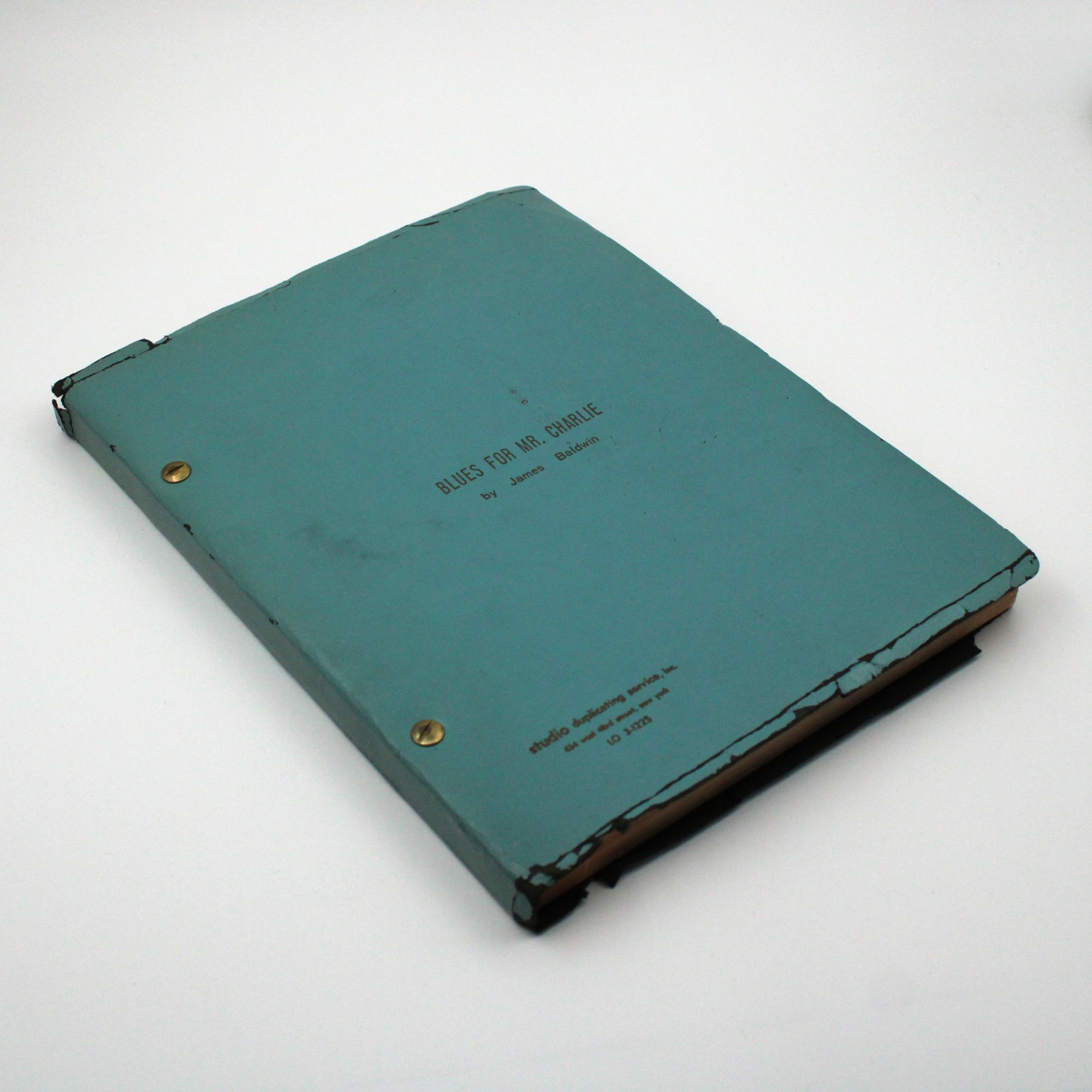 New York: Studio Duplicating Service, 1964. Mimeograph, rectos only; 173 pp. Blue card stock wrappers, title stamped on front, bolt bound. Shelf wear to top and bottom edges; head of spine chipped. Mimeograph, rectos only; 173 pp. James Baldwin's second play is dedicated to "the memory of Medgar Evers, his widow and his children, and to the memory of the dead children of Birmingham"; both Evers' assassination and the killing of four young girls in the 16th Street Baptist Church bombing had occurred in 1963, while Baldwin was writing the drama. That ongoing work was mentioned in "Notes About the Author" in the 1963 Dial Press reissue of Notes of a Native Son, which was edited by James Silberman, from whose collection this script was derived.