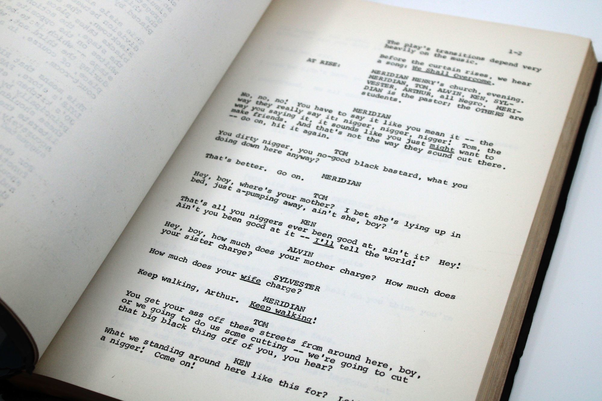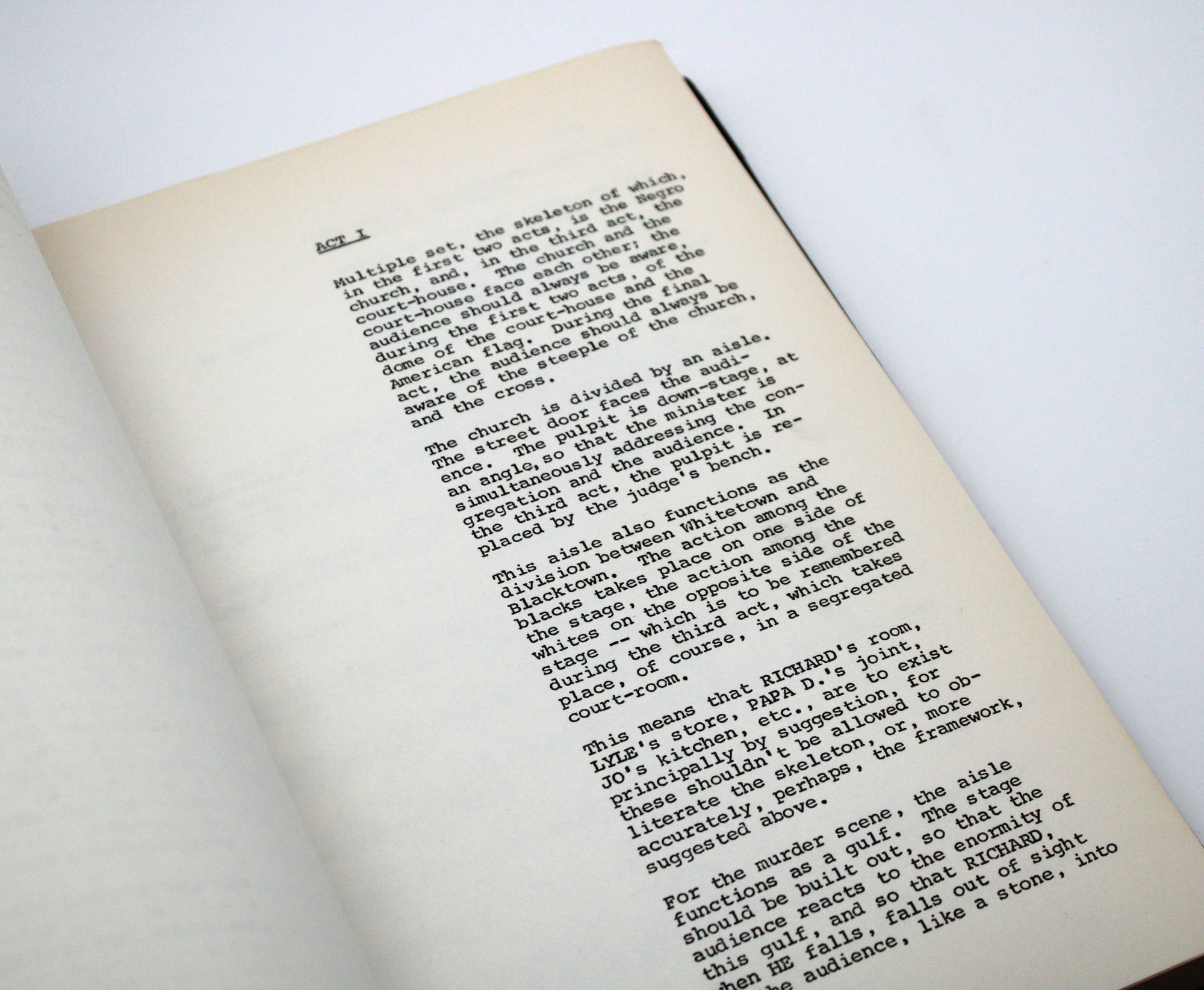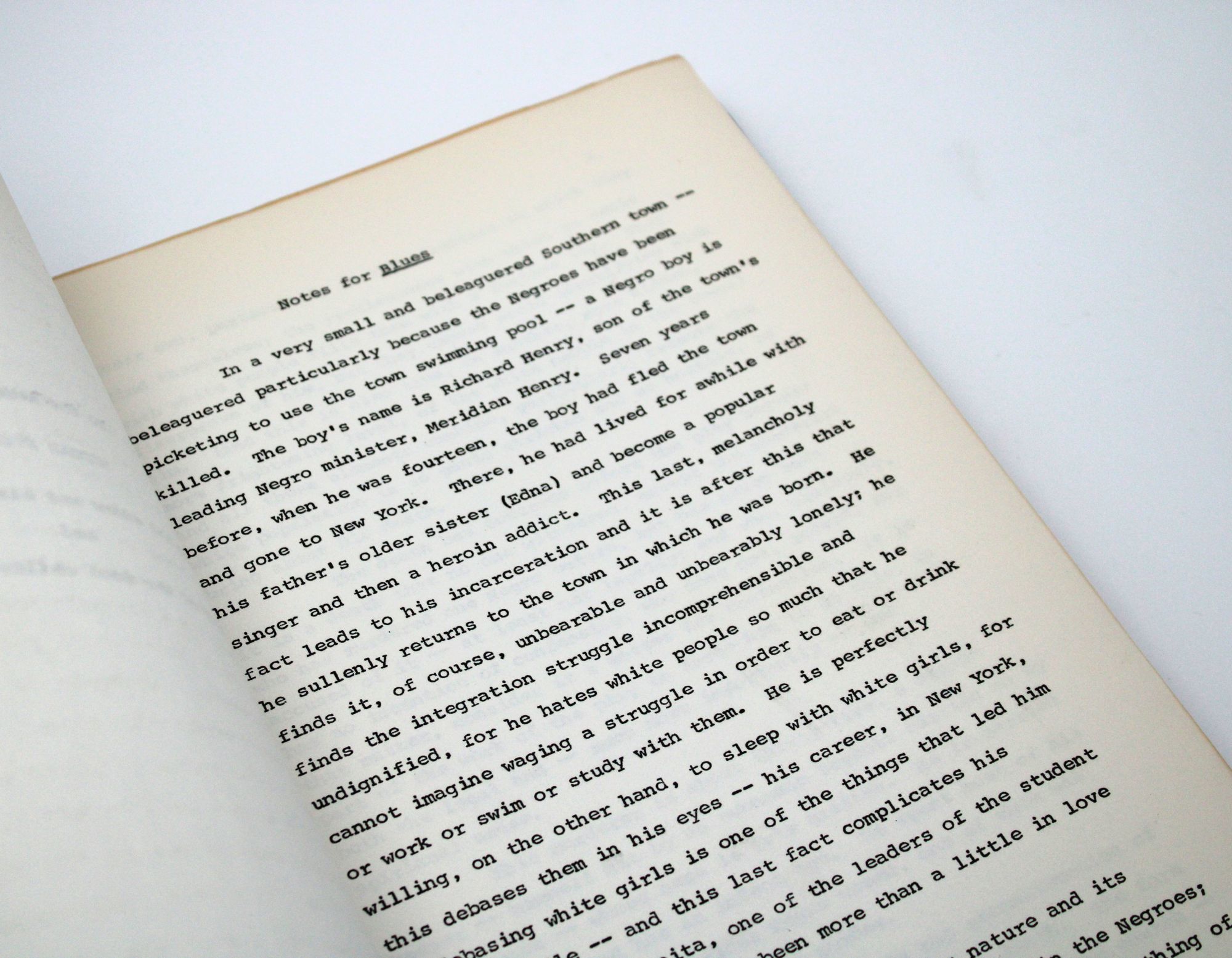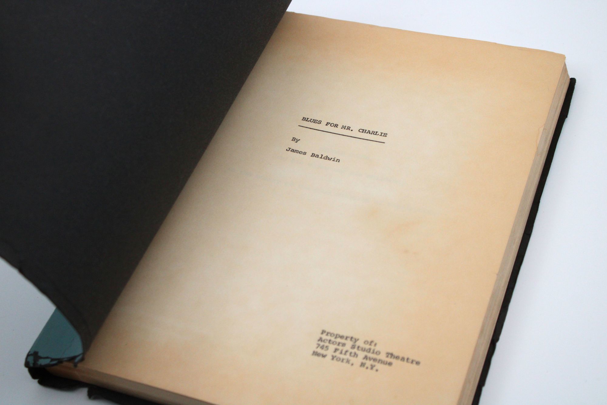 The title page states that the mimeograph was the property of the Actor's Studio Theatre, which staged the critically praised initial production, directed by Burgess Meredith, in 1964. The play ran from April 23 until August 29, with a cast that included Al Freeman, Jr., Rip Torn, Pat Hingle, and Ralph Waite, and later transferred to London. At front are six pages of Baldwin's prefatory "Notes for Blues