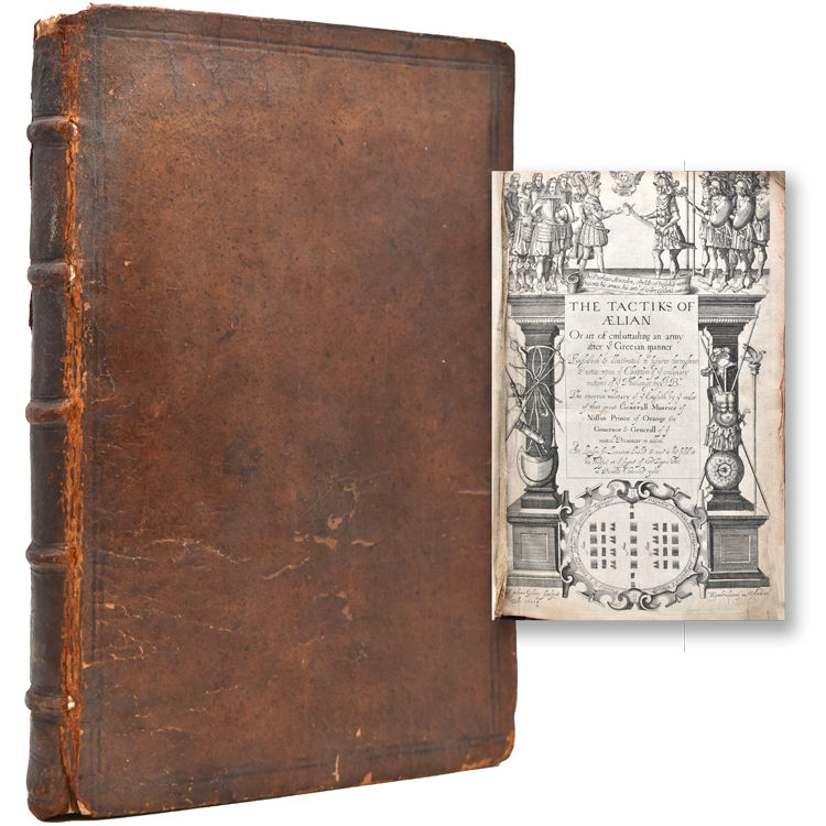 London: The Tactiks of Aelian or Art of Embattailing an Arm, 1616. First Edition in English, In this Earliest state the contents begin on p. 5. Engraved title, 50 engraved plates. (Title shaved at upper margin with a little loss.). The title page is engraved and signed: Egidius Gelius sculpsit A 1616 Woudrichemij in Hollandia. (with repair) [6], 7, [1], 7-159, [9] p. Folio. Contemporary speckled calf, tooled and blocked in gilt. Provenance: Walter Steuart (early inscriptions). First Edition in English, In this Earliest state the contents begin on p. 5. Engraved title, 50 engraved plates. (Title shaved at upper margin with a little loss.). The title page is engraved and signed: Egidius Gelius sculpsit A 1616 Woudrichemij in Hollandia. (with repair) [6], 7, [1], 7-159, [9] p. Folio. The Tactiks of Aelian is a handbook of Greek, i.e. Macedonian, drill and tactics as practiced by the Hellenistic successors of Alexander the Great. ESTC S106791; STC (2nd ed.), 161