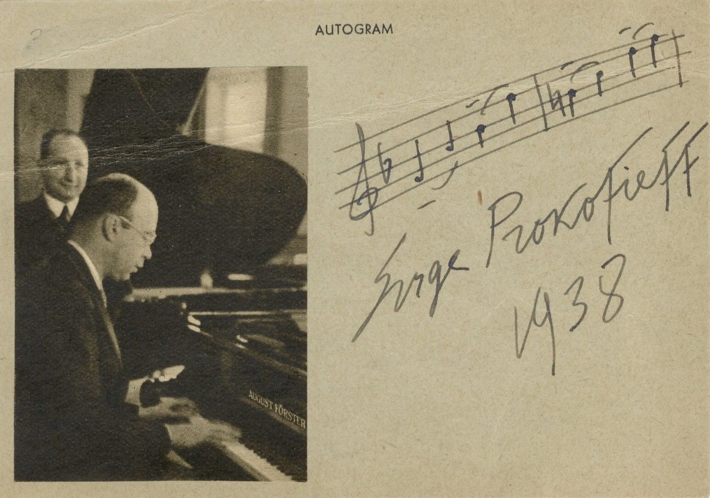 2 measures from the second theme of the 3rd movement of the suite. Notated in black ink on light gray paper and dated 1938. With "Autogram" printed at head and photographic reproduction of Prokofiev at the piano laid down to left.