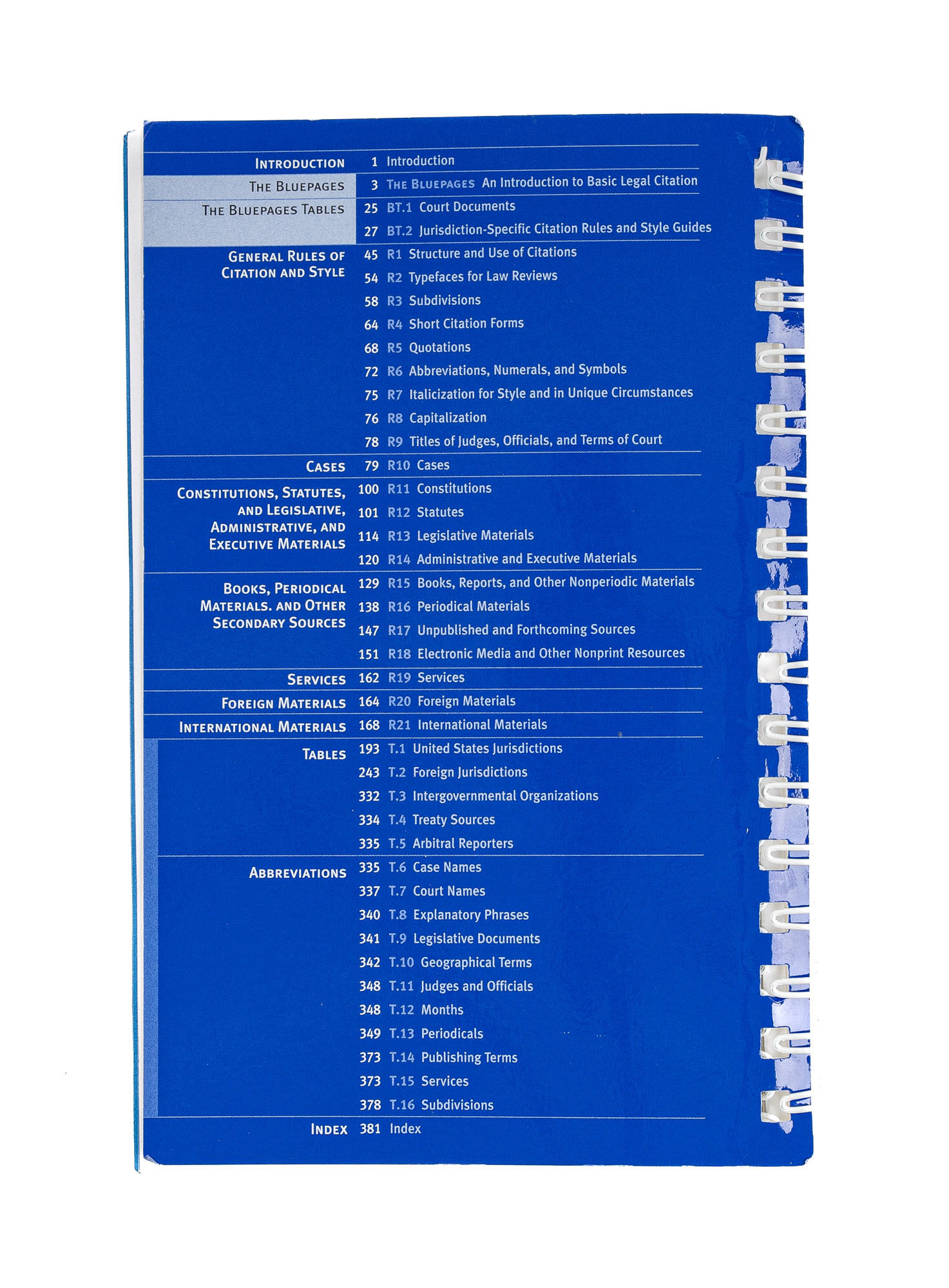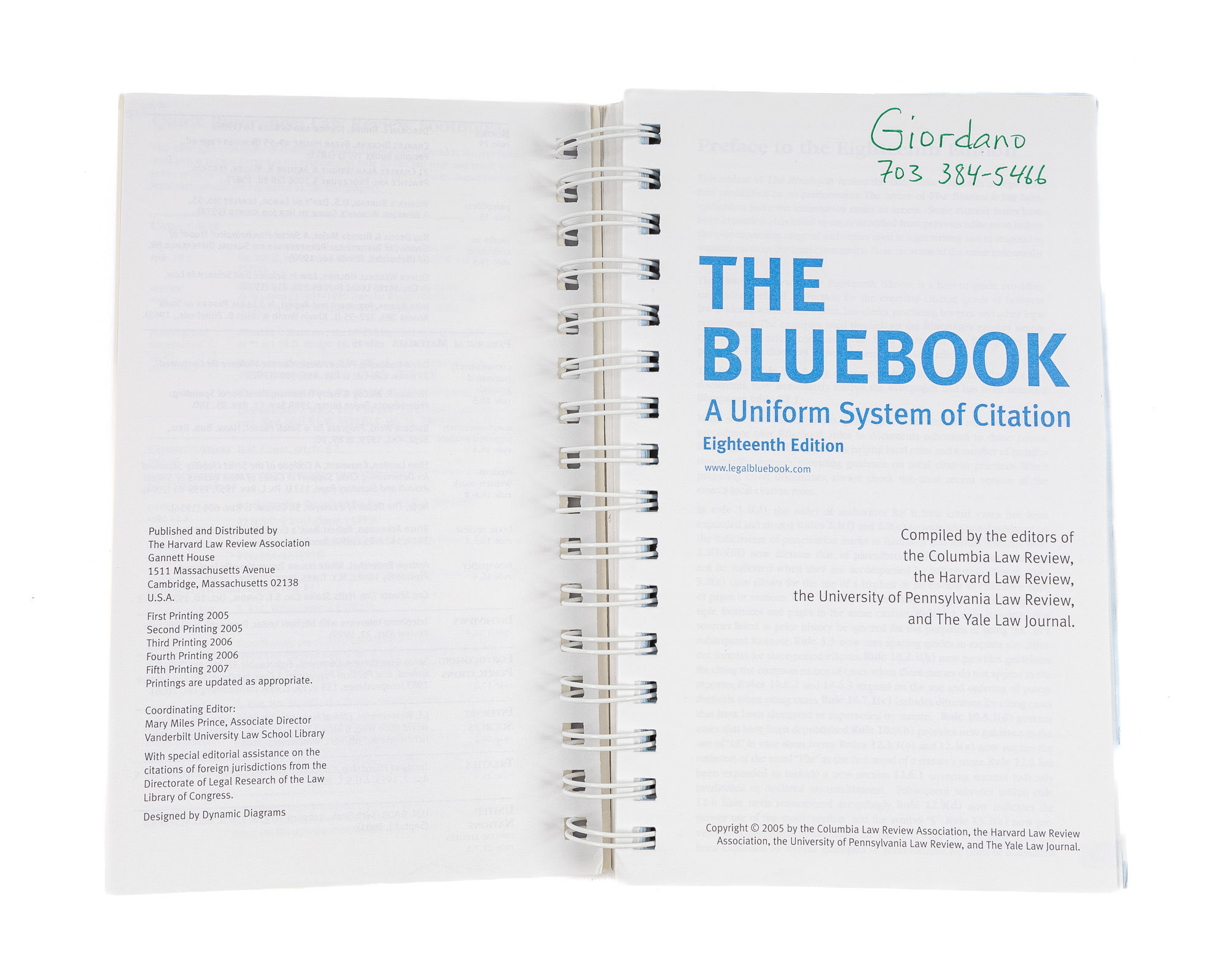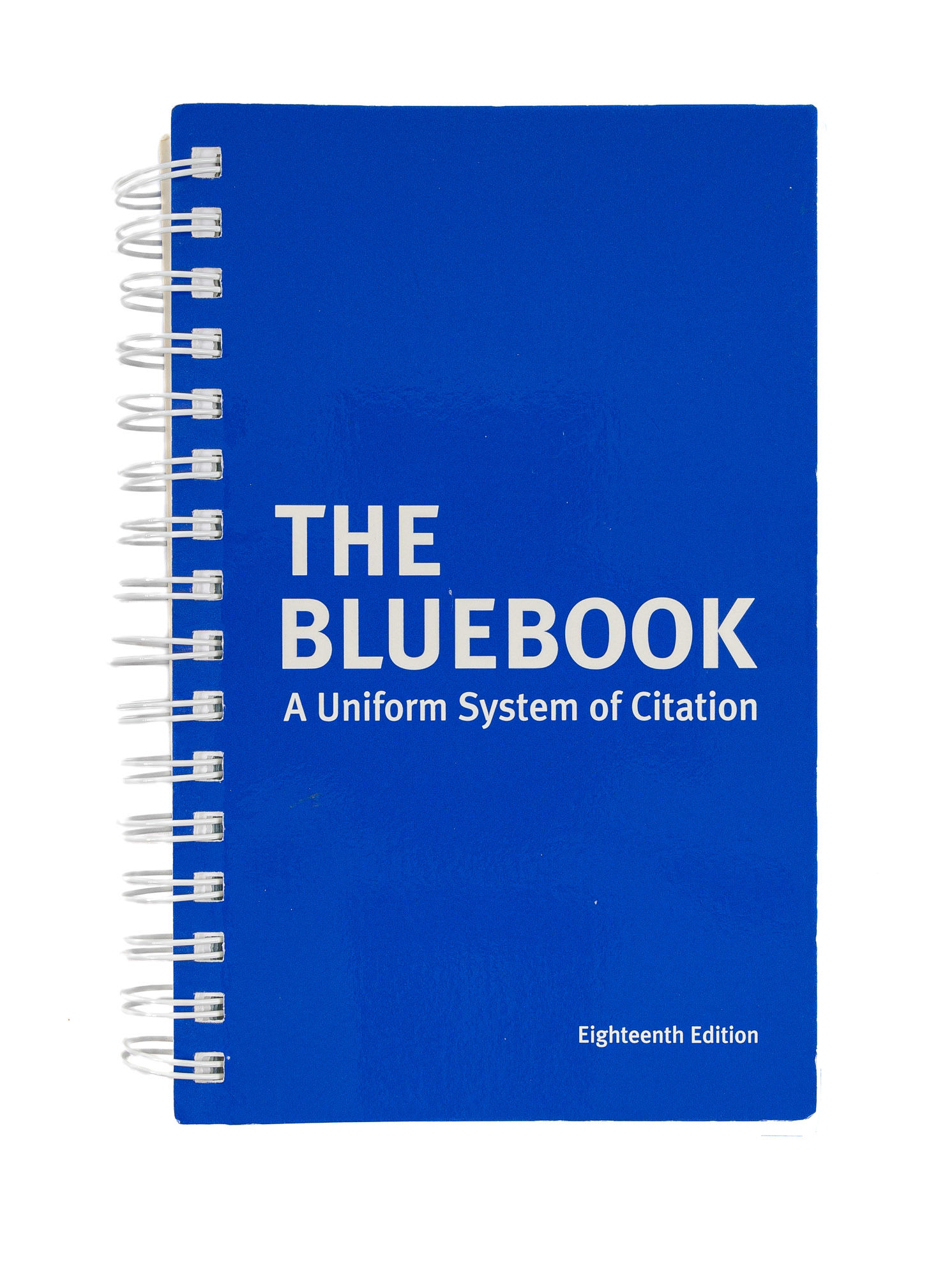 2005. Eighteenth Edition, 2005. Comb binding blue wraps. Eighteenth Edition, 2005. Comb binding blue wraps. [Harvard Law Review Association]. A Uniform System of Citation. Eighteenth Edition. [Cambridge, Mass.: Harvard Law Review Association], 2005, Fifth Printing 2007. xiv, 415 pp. 8-1/2" x 5-1/2". 21.5 cm x 14 cm. Blue covers with white lettering, metal comb binding, lightly worn, previous owner's signature to title page. $25. * Eighteenth edition of "The Bluebook.