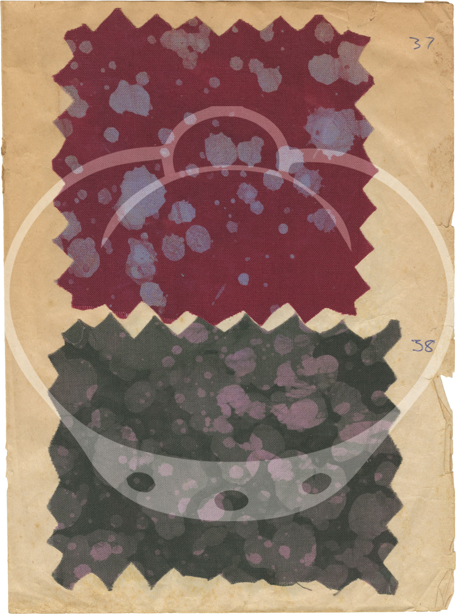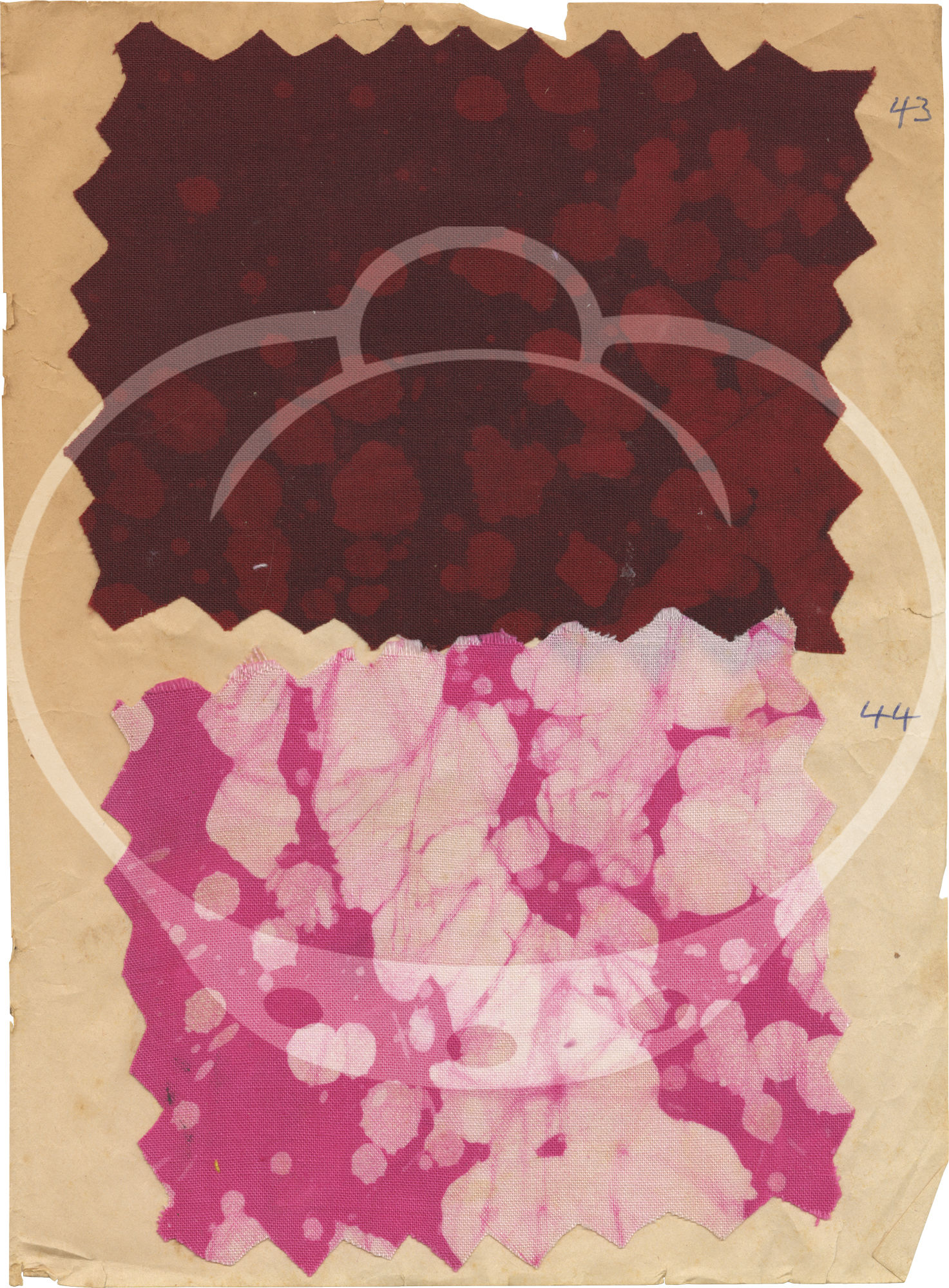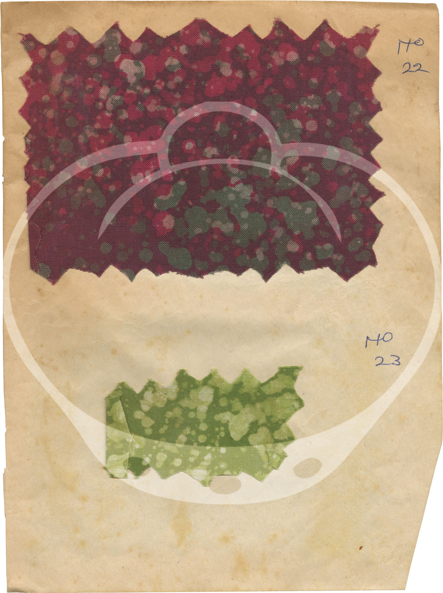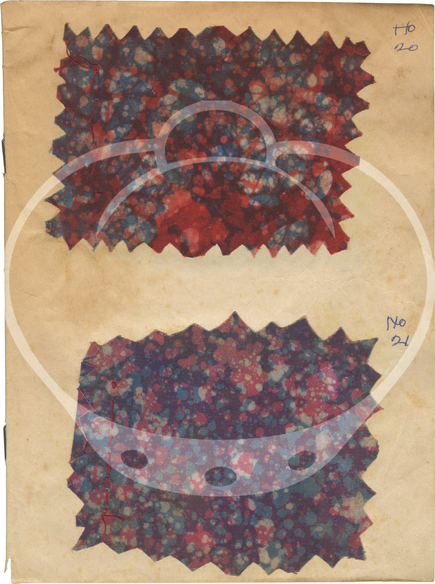 The 43 samples found in the archive are all affixed, usually two to a page, to the rectos of the jotter's leaves by stitch and/or glue on 23 of the 24 leaves. Each sample is accompanied by an ink annotation numbering the samples 1-41, lacking samples and numbers 9 and 28, and a sample in the place of an unnumbered 31. All leaves however appear to be present.
