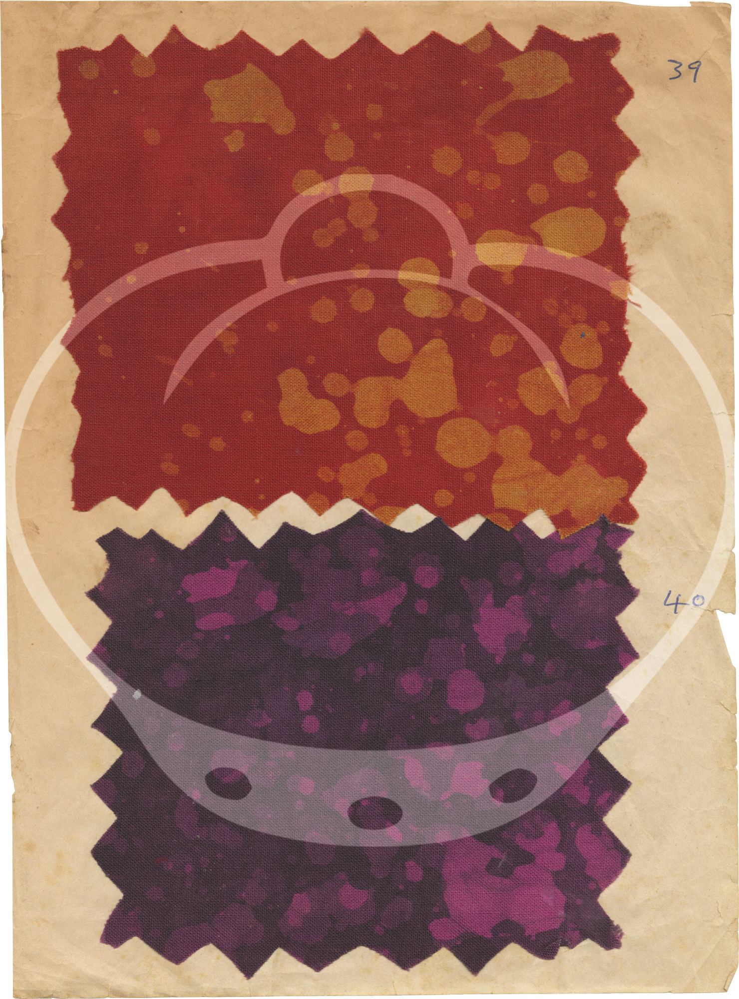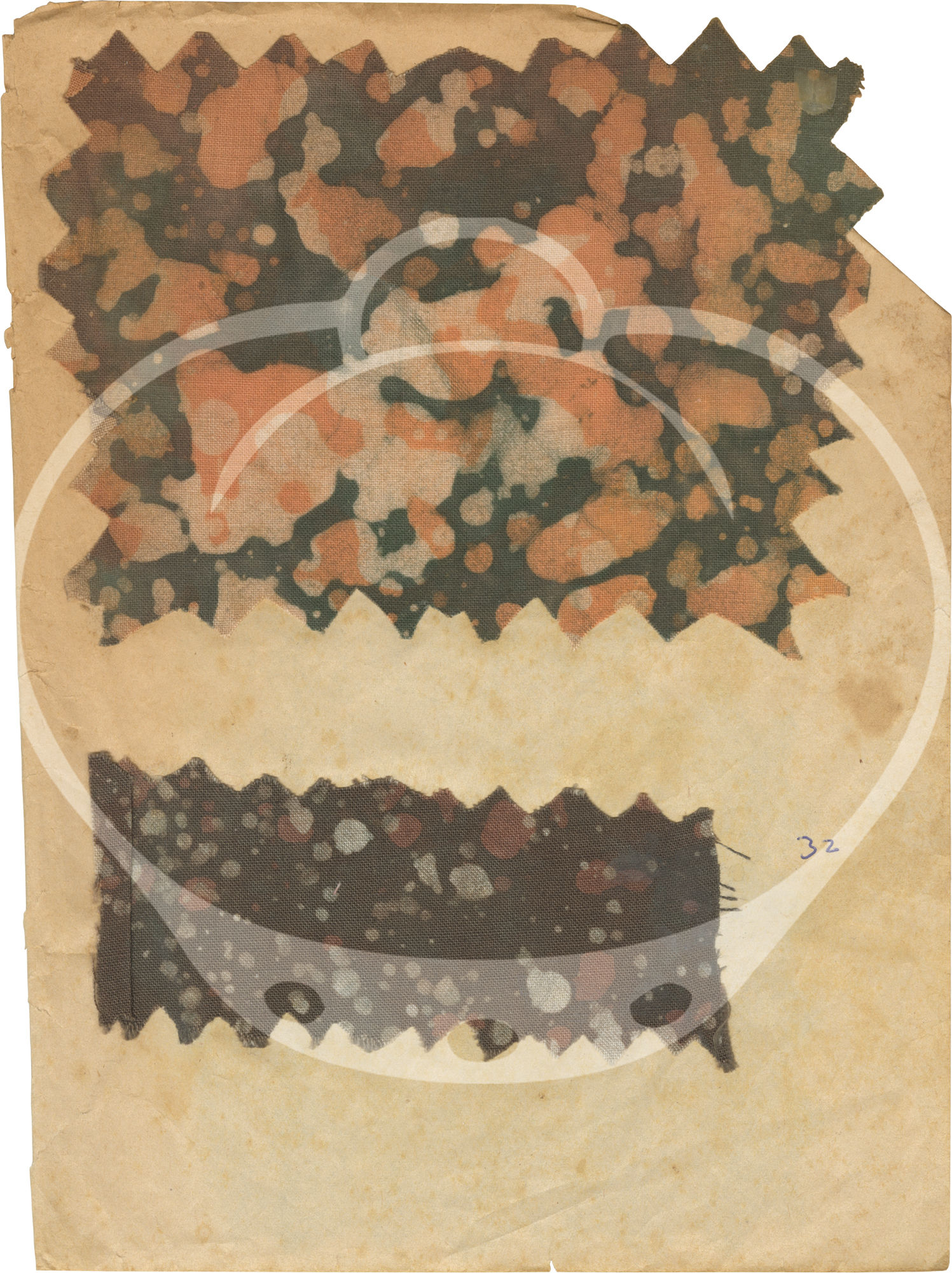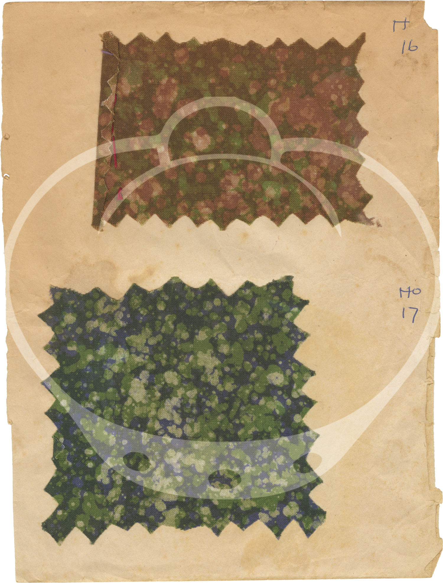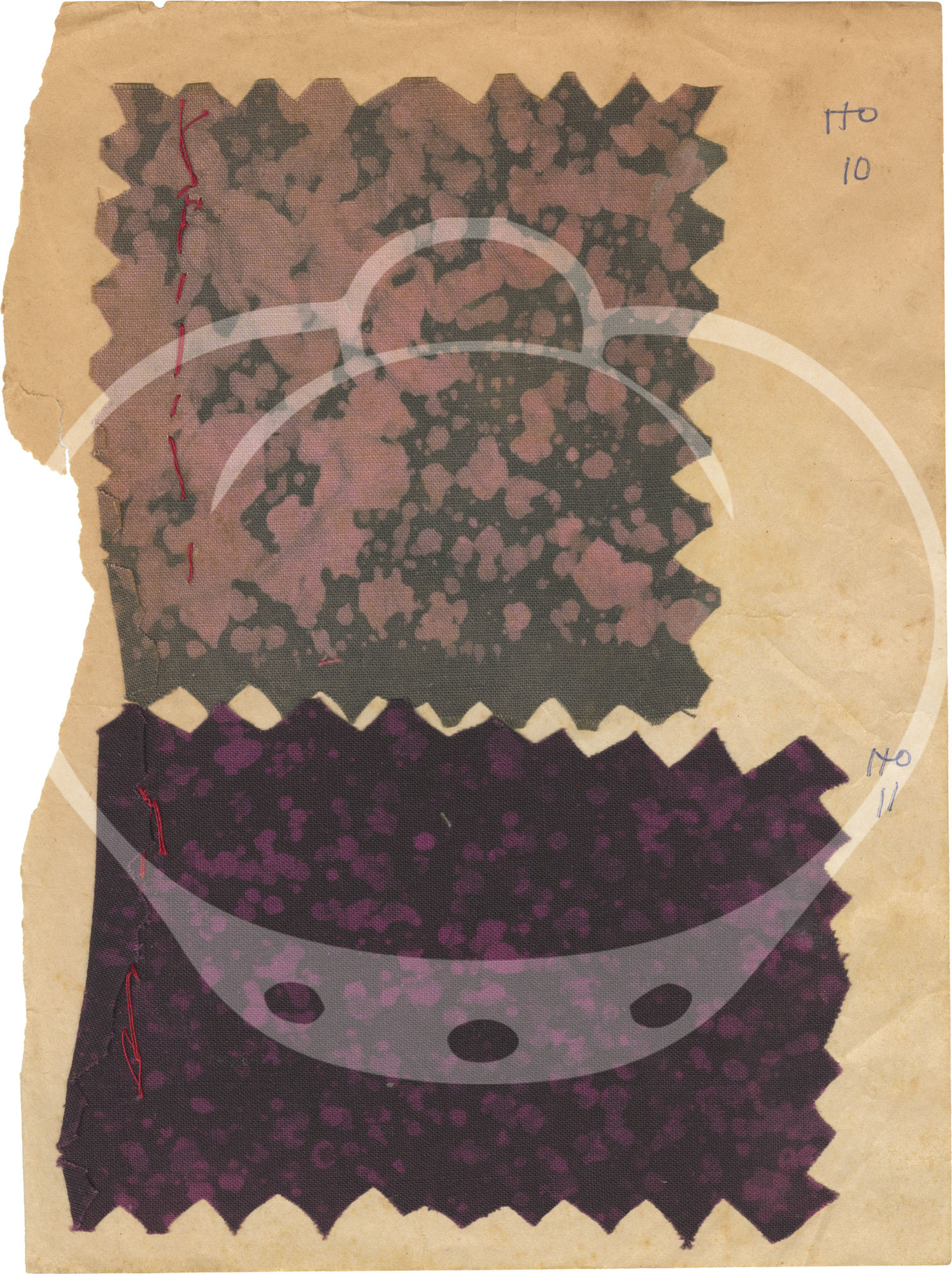 The 43 samples found in the archive are all affixed, usually two to a page, to the rectos of the jotter's leaves by stitch and/or glue on 23 of the 24 leaves. Each sample is accompanied by an ink annotation numbering the samples 1-41, lacking samples and numbers 9 and 28, and a sample in the place of an unnumbered 31. All leaves however appear to be present.