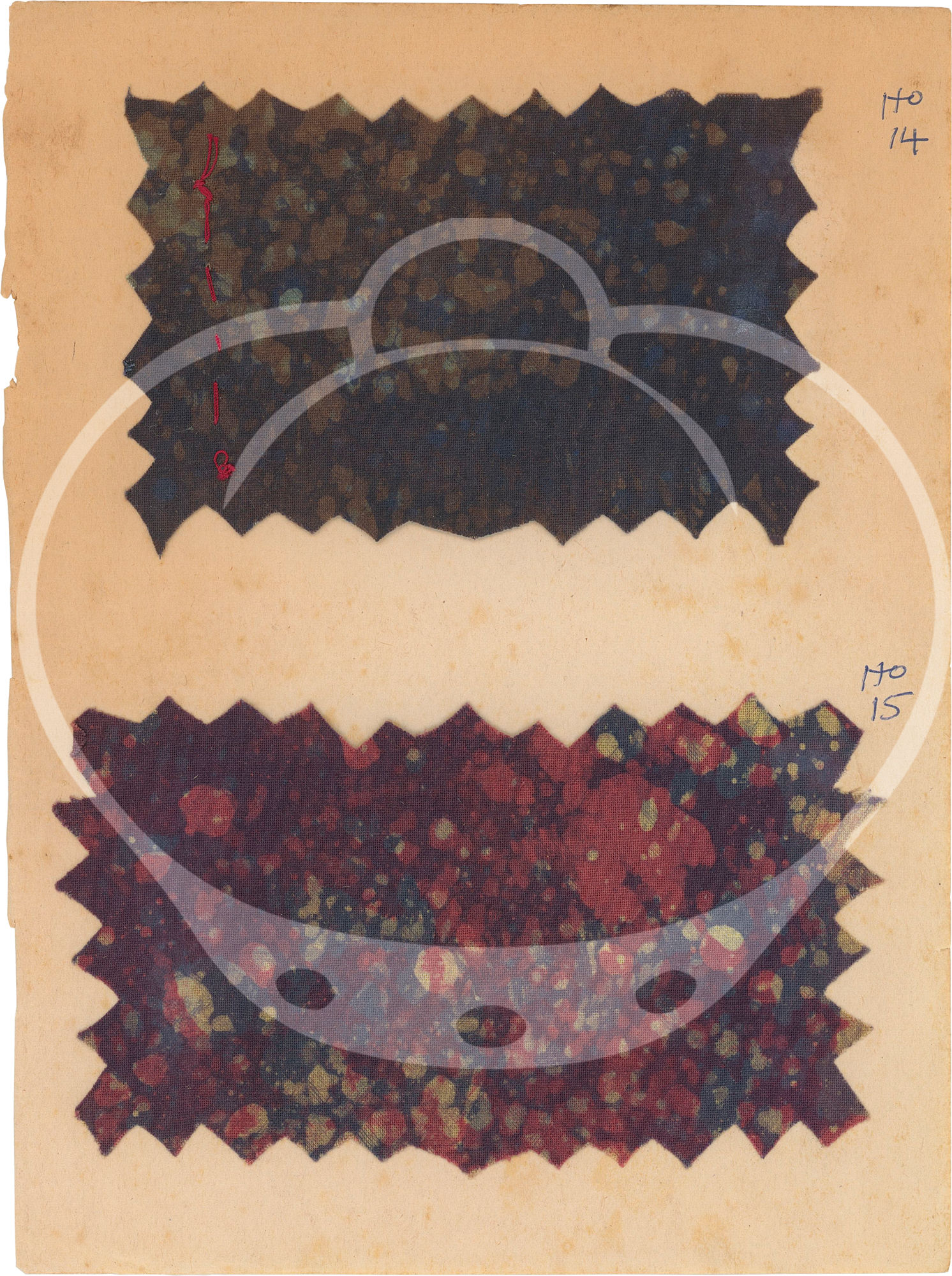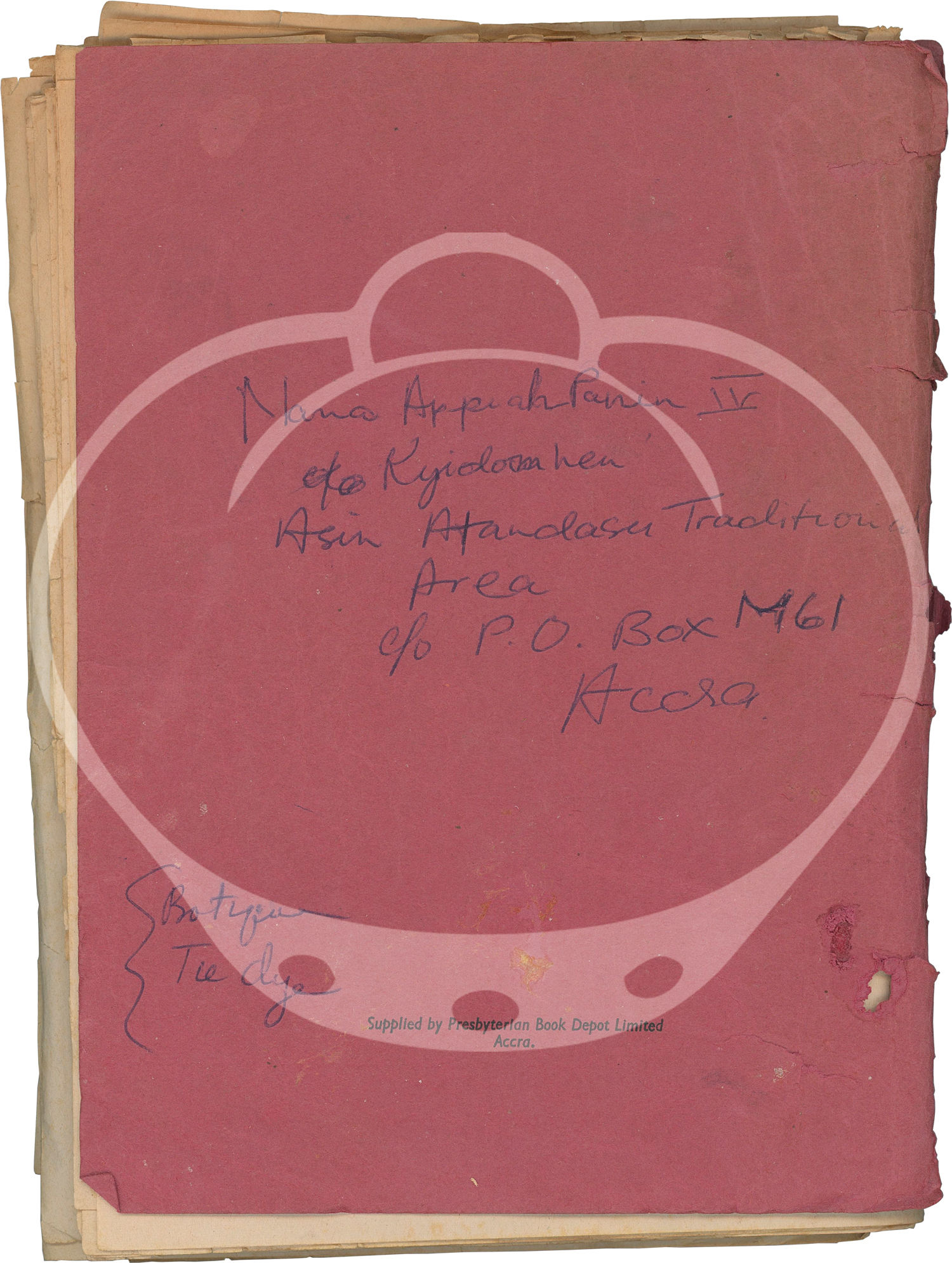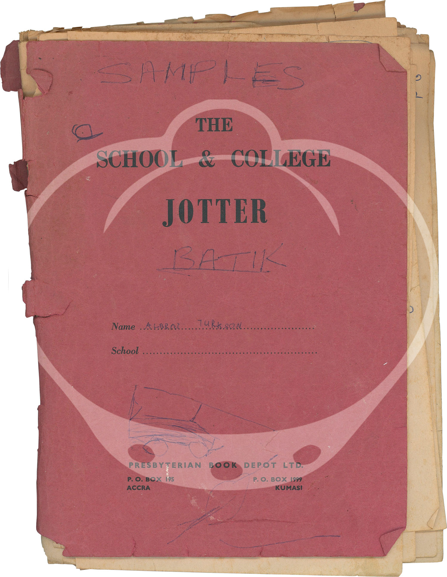 Accra, Ghana: N.p., 1960. A small archive of 43 batik fabric samples, housed in a "School and College Jotter," compiled by a student in Accra, Ghana, circa 1960s, with ink annotations of "Samples / Batik" and the name "Albert Turkson" on the front wrapper and an Accra address on the rear wrapper. The jotter was manufactured by the Presbyterian Book Depot Ltd with P.O. Boxes in Accra and Kumasi, Ghana.