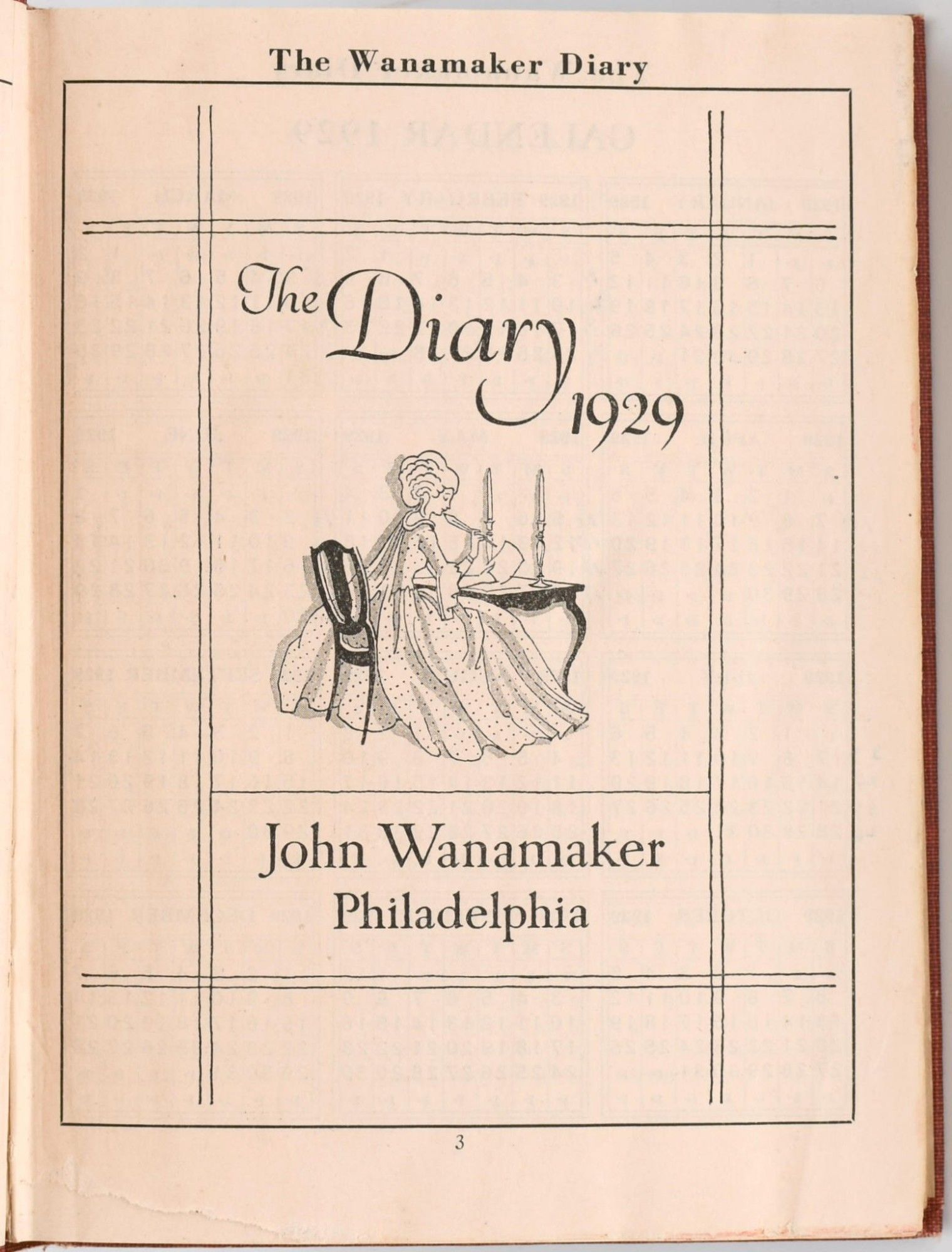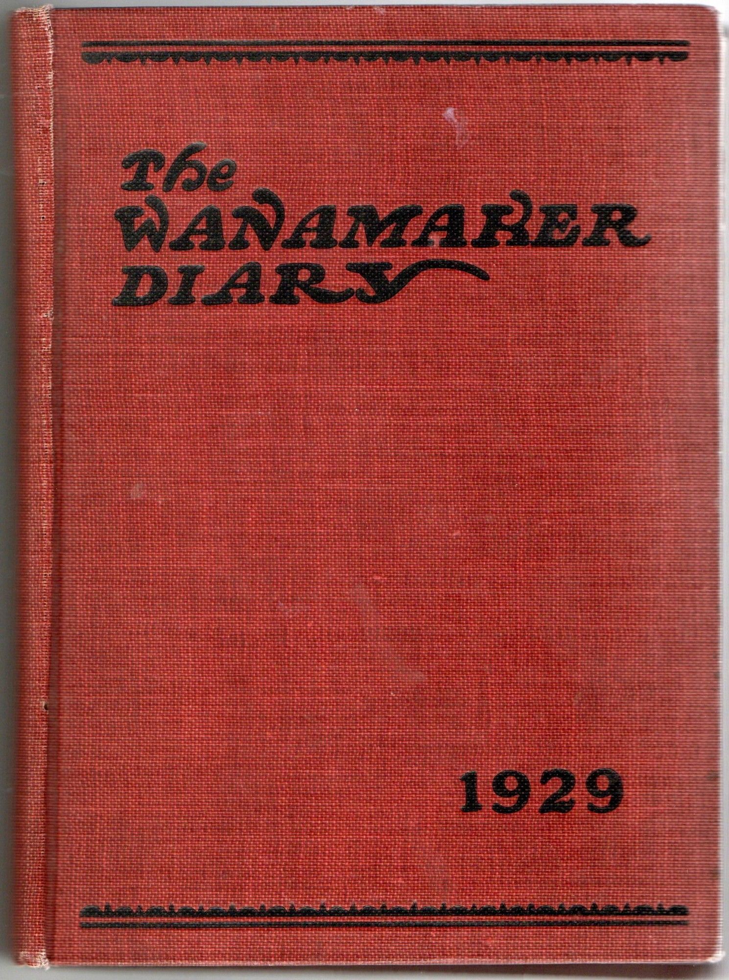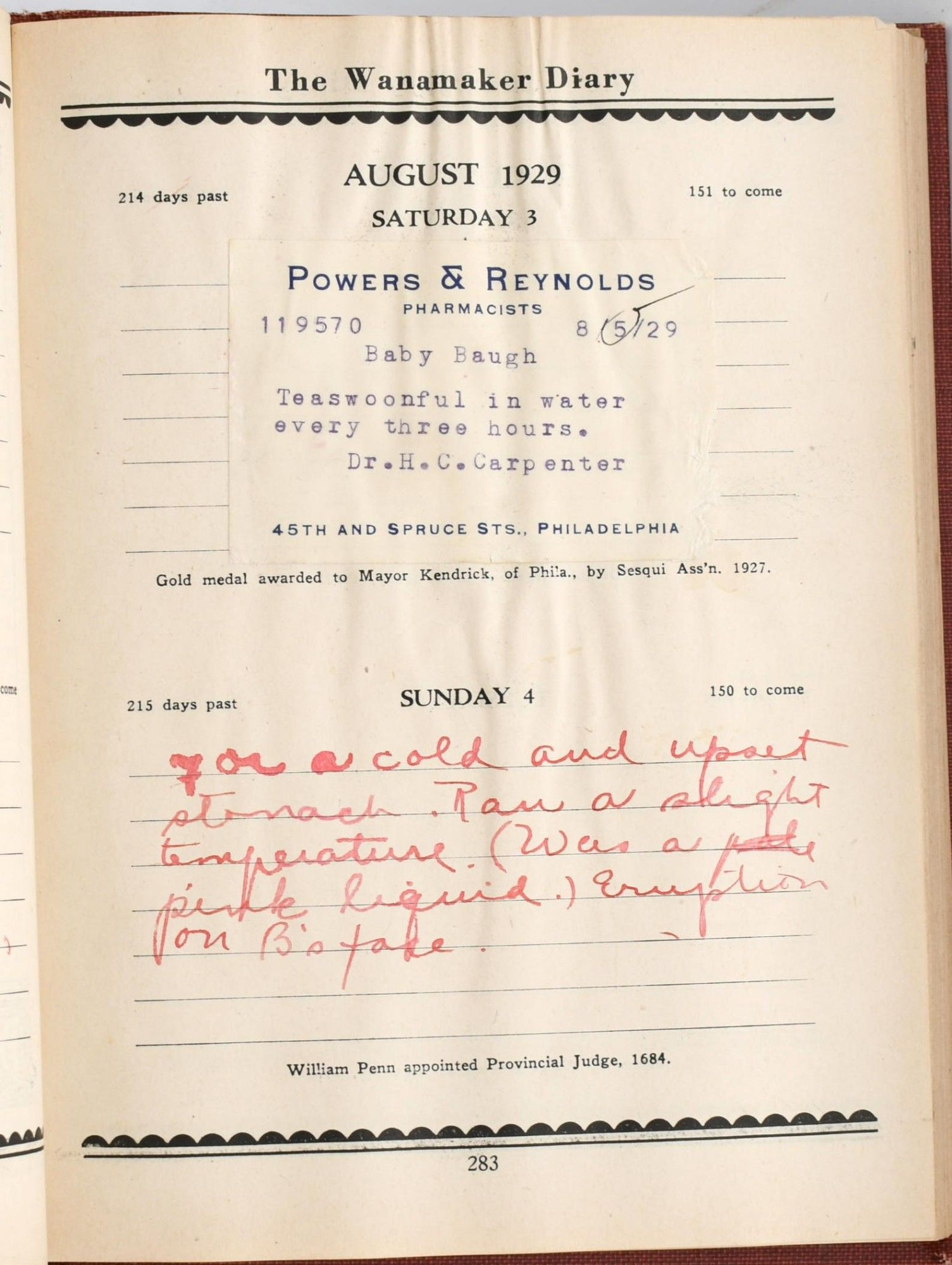 Philadelphia, PA: Wanamaker’s, 1929. Red leatherbound hardcover diary with black decorative edges and titling on spine and front cover, “The WANAMAKER DIARY 1929”; numbered pages and insert contains a map of Philadelphia with routes to Wanamaker’s Department Store. The diary is bookended by ads, almanacs, and recipes. Illustrations preface each month. ~~This book is an interesting snapshot of early/mid century pediatric practices and daily life in 1929. William S. Baugh was the first child of Albert, a medieval scholar, and Anita Baugh who kept the diary. She filled it with typical first child anecdotes, such as when she was bathing him and “he tried walking along the floor of the tub, digging his little pink toes in and pushing himself along.” Nita is concerned with his low birth weight, and most of the entries pertain to his health issues. Numerous original prescriptions are pasted into the book. ~~While this baby book is relatable to modern parents, it also contains advice and practices no longer recommended. Nita’s entries reflect the trend towards a more disciplinarian approach to infant care during the 1920s and 30s, such as when she stopped his night-time feeds at just one month old, started him on orange juice diluted in water at that age, and “[gave] him the soap stick every day” – a suppository meant to promote early toilet training.~ ~Billy grew up to be interested in music and travel, graduate from the University of Pennsylvania in 1951, join the Navy, marryd Pauline Smith Brown in 1963, and die in 1981. ~.