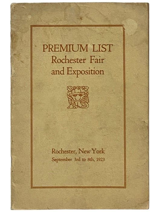 Rochester, New York: Rochester Exposition Association, 1923. Stapled Binding. Good. Sticker ghost on front wrapper, wrappers soiled, wrappers and pages creased. 1923 Stapled Binding. 46 pp. Original wrappers. Rochester advertisements throughout (most notably a rather blunt two-page centerfold ad for a 'Travel and Pedestrian Accident Policy' enumerating coverage amounts 'if killed while riding or driving'; for 'loss of both hands - both feet - both eyes'; etc.). Includes photograph of Monroe County Farm Bureau exhibit. Lists of fair exhibition categories and prizes awarded for first and second place.
