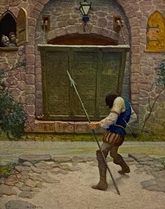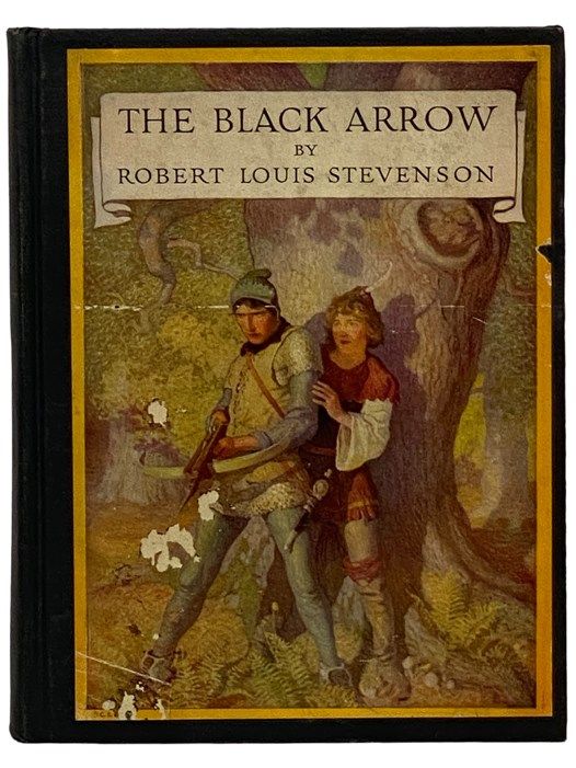 New York: Charles Scribner's Sons, 1941. Reissue. Hard Cover. Very Good/No Jacket. 0x0x0. Wyeth, N.C. [Newell Convers]. 1941 reissue. Surface tears on front board and top edge of rear endpapers, spine titles faded. ix, 328 pp. Black cloth, color label mounted on front board, color illustrated title page, color plates, and illustrated endpapers by N.C. Wyeth. "Set in England during the fifteenth-century Wars of the Roses, this swashbuckling historical novel by the author of 'Treasure Island' and 'Kidnapped' tells the story of young Dick Shelton. Betrayed by his treacherous and brutal guardian, Sir Daniel Brackley, Dick seeks the help of John Amend-All, leader of the mysterious fellowship of the Black Arrow - and Brackley's sworn enemy. Pitted against fierce fighters, a treacherous priest, and Sir Daniel, Dick seeks to become a knight and rescue his true love. Brimming with adventure, suspense, and romance, this thrilling tale presents a classic portrait of England during one of its most tumultuous eras, as Dick is pulled by his loyalties to the houses of both York and Lancaster. He must make a crucial choice, for his fate and the fate of England hang in the balance.