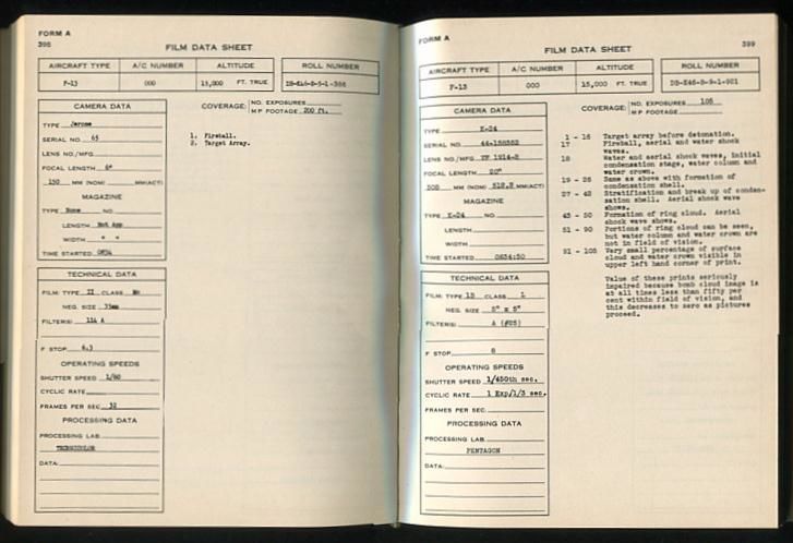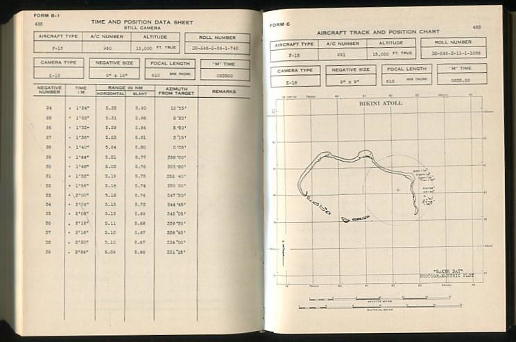 [Washington DC]: United States Army Air Forces. Very Good+. [ca.1947]. First Edition. Hardcover. (no dust jacket, probably as issued) [light external soiling, a little darkening to the spine]. (charts, maps) A massive catalog of all (and I do mean all) the photo-technical data related to the photography (both still and motion picture, both black & white and color) of "Operation Crossroads," the first two post-World War II nuclear bomb tests, conducted at Bikini Atoll in the South Pacific in July 1946. The first test took place on July 1, and was nicknamed "Able Day"; the second, on July 25, was "Baker Day." (The names were directly taken from the first two letters of the Joint Army/Navy Phonetic Alphabet.) The stated purpose of the tests was to assess the level of damage that the massive explosions would inflict on naval vessels of various kinds that were stationed in the vicinity; all humans were evacuated from the ships, although a large number of small animals were placed on board (thousands of rats; hundreds of goats, pigs, and mice; and even a few dozen guinea pigs) in order to measure the effects on them of the radiation emitting from the blasts. (Short version: not good.) The two tests were designed to measure the effects of two different kinds of explosions: the Able bomb was an "air burst," detonated 520 above the surface; the Baker bomb was suspended beneath a landing craft and detonated 80 feet underwater. The stated purpose of this catalog was "to provide a systematically-combined record of photography available from [the two operations] for study, measurement, and analysis purposes." The bulk of its 756 pages is devoted to reproductions of the three data sheets that documented each roll of film that was shot: (1) the "Film Data Sheet," giving the technical specs of the camera and a summary of its coverage; (2) the "Time and Position Data Sheet," with detailed data on each individual exposure; and (3) the "Aircraft Track and Position Chart," a map of Bikini Atoll with the positions of each camera-carrying aircraft plotted thereon. (Those aircraft, by the way, were essentially drones, operated by radio remote control, and the cameras were automatic, so that no humans needed to be too close to the blasts.) There are also, at the beginning of both the Able and Baker sections, abstracts of the contents of each roll of film. (Example: "This roll shows phenomena from fireball through development of mushroom cloud in a series of exposures made in rapid succession (3 per second).") Although the volume itself was apparently not classified, neither was it a U.S. Government Printing Office issue intended for wide circulation; it's stated in a couple of places that "a limited number of additional copies of this publication are available," and informs the reader where to procure them. Its obvious purpose was to facilitate the users' ability to locate the film footage or still photography needed for purposes of their own analysis, and it's likely that a certain level of security clearance was required. (There is, however, this note among the introductory matter: "All data and sheets pertaining to Able Day Sortie H and bomb carrying aircraft have been deleted from this catalog and will be found in a classified addendum." Keeping wraps on info about the plane that actually dropped the Able bomb I can understand, but I wonder what the deal was with "Sortie H"?) A small amount of the film footage documented here was incorporated into the official U.S. Government documentary film of the events, called "Operation Crossroads: Able and Baker Day Tests, Bikini Atoll, Summer 1946," released in 1949. One would hope that all this photography has been preserved in the National Archives -- maybe even the stuff from the mysterious "Sortie H." The present volume is quite rare, with OCLC recording just three copies: at the Smithsonian Institution in Washington DC; the Air University Library at Maxwell AFB in Montgomery, Alabama; and at the Phillips Research Site Technical Library, which was merged in 1997 into the Air Force Research Laboratory at Wright-Patterson AFB in Ohio (the OCLC link, however, is dead) -- the latter two of which, I suspect, are not readily (if at all) accessible by the public. NOTE, by the way, that there is no actual photography reproduced in this book: it's strictly a non-visual catalog. .