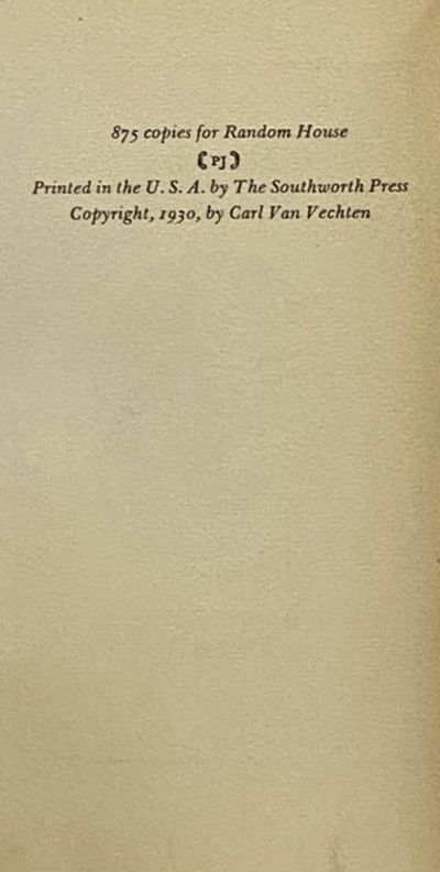 New York: Random House, 1930. Soft Cover. Near Fine. 0x0x0. An excellent copy. 1930 Soft Cover. 22 pp. One of 875 copies. Carl Van Vechten (June 17, 1880 – December 21, 1964) was an American writer and artistic photographer who was a patron of the Harlem Renaissance and the literary executor of Gertrude Stein.[1] He gained fame as a writer, and notoriety as well, for his 1926 novel Nigger Heaven. In his later years, he took up photography and took many portraits of notable people. Although he was married to women for most of his adult years, Van Vechten engaged in numerous homosexual affairs over his lifetime.