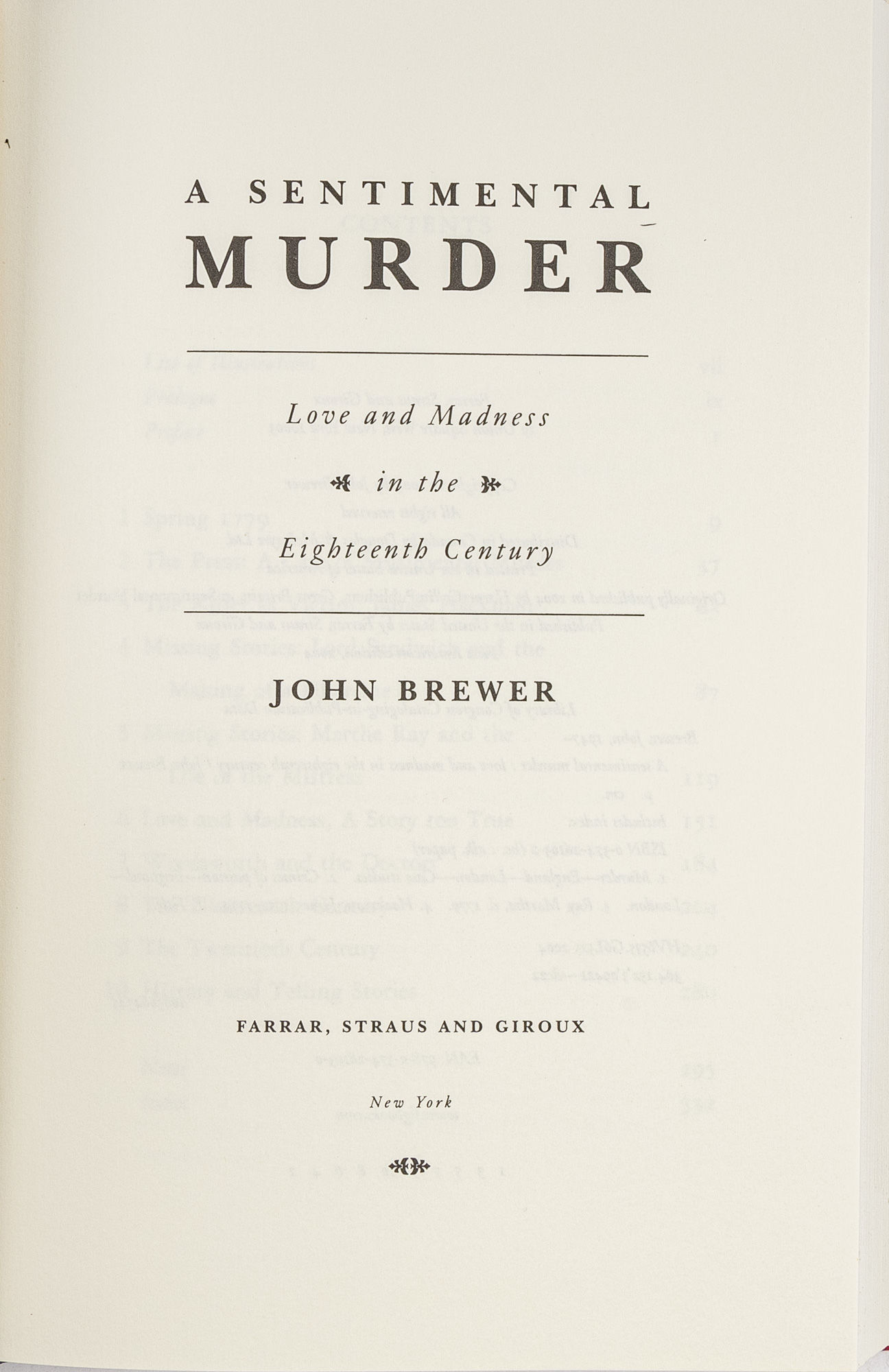 2004. Brewer, John. A Sentimental Murder: Love and Madness in the Eighteenth Century. New York: Farrar, Straus and Giroux, [2004]. x, 340 pp. Hardcover fine in near-fine dust jacket. Internally clean. $15. * Contents: Spring 1779; The Press: A Case of Sentimental Murder; The Killer as Victim: James Hackman; Missing Stories: Lord Sandwich and the Making of a Libertine; Missing Stories: Martha Ray and the Life of the Mistress; Love and Madness, a Story Too True; Wordsworth and the Doctors; The Nineteenth Century; The Twentieth Century; History and Telling Stories.