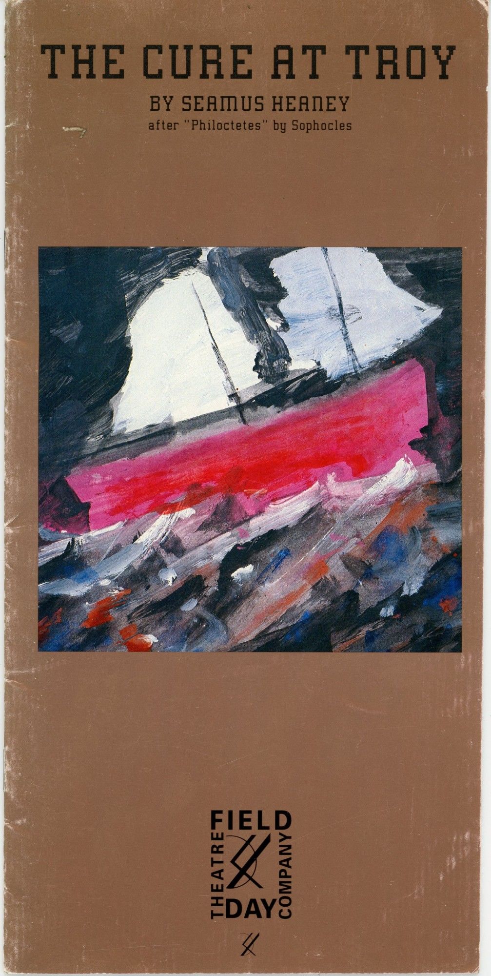 [Derry, Northern Ireland]: Field Day Theater Co, 1990. Stapled Pamphlet. Very Good binding. Quarto; copper colored stiff wrappers with a printed illustration in color; [14] unnumbered pages, with black and white illustrations, portraits and photographs;~publisher from logo at head of title; includes publishers' advertising matter at end..~~Theater program for The cure at Troy given by the Field Day Theatre Company which had its "World premiere [at] Guildhall Derry, 1st October 1990."/ Includes "Field Day's tenth birthday," by Mary Holland; with notes on the play by Mr. Heaney. Very Good binding.