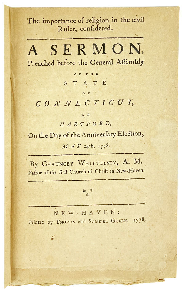 The Importance of Religion in the Civil Ruler, Considered. A Sermon, Preached before the General Assembly of the State of Connecticut, at Hartford, on the Day of the Anniversary Election, May 14th, 1778 [Half title: Mr. Whittelsey's Election Sermon, May 14th, 1778]