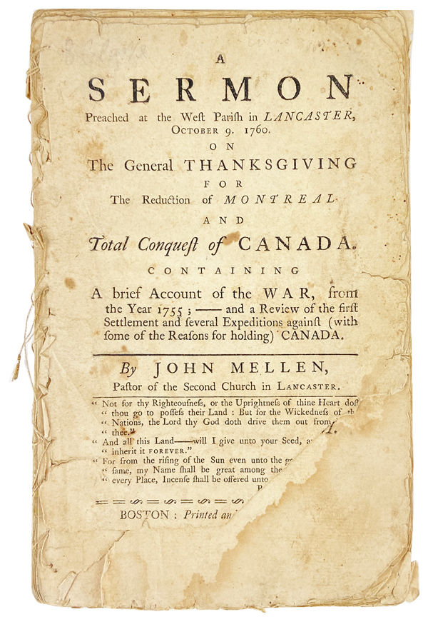 A Sermon Preached at the West Parish in Lancaster, October 9. 1760. On the General Thanksgiving for the Reduction of Montreal and the Total Conquest of Canada. Containing a brief account of the War, from the year 1755; -- and a Review of the first settlement and several expeditions against (with some of the reasons for holding) Canada