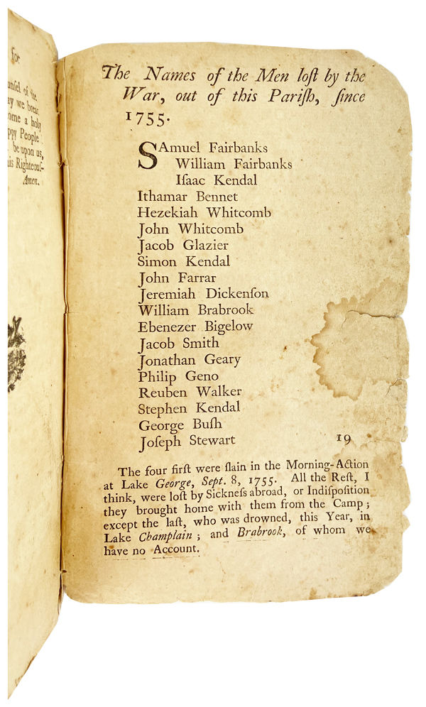 Preached in the midst of hostilities during the French and Indian War giving thanks to recent "decisive Victories and valuable Acquisitions [which] have not been purchased with a Song...They have been obtained at the Expence of much Blood and Treasure" (p. 17). Indeed, the final page of text lists the nineteen men of the parish "lost by the War" since 1755. "The four first were slain in the Morning-Action at Lake George, Sept. 8, 1755. All the Rest, I think, were lost by Sickness abroad, or Indisposition they brought home with them from the Camp; except the last, who was drowned, this Year, in Lake Champlain; and Brabrook, of whom we have no account."
