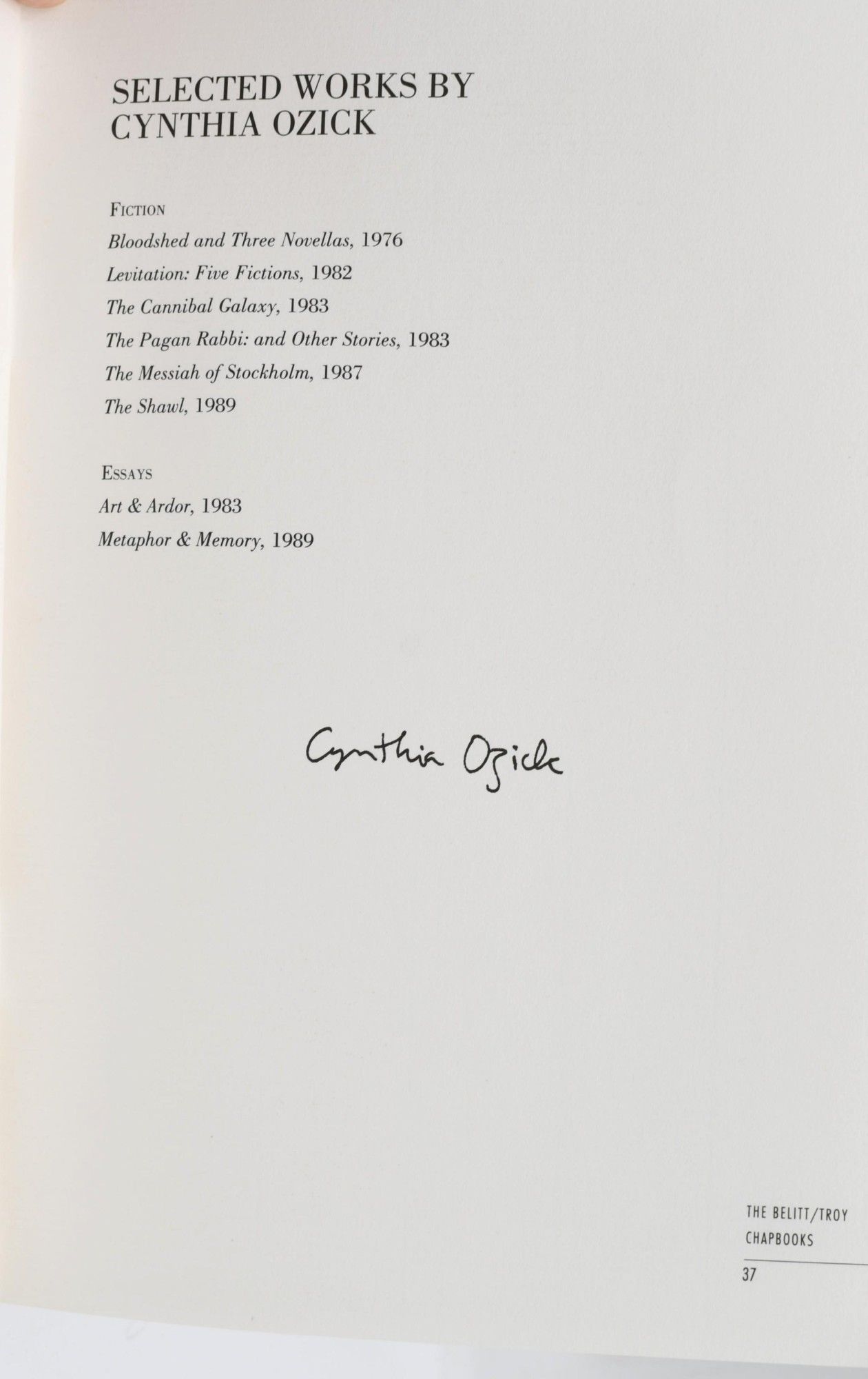 Bennington, Vermont: Bennington College, 1993. Limited Edition. Soft Cover. Very Good binding. Signed. 8vo; in stapled cardstock wrappers; a chapbook original limited to 1000 copies, of which this is number 531; signed by Cynthia Ozick on the Selected Works page at the end of the book; there a bit of soiling near the top of the leading edge of the front cover. Very Good binding.
