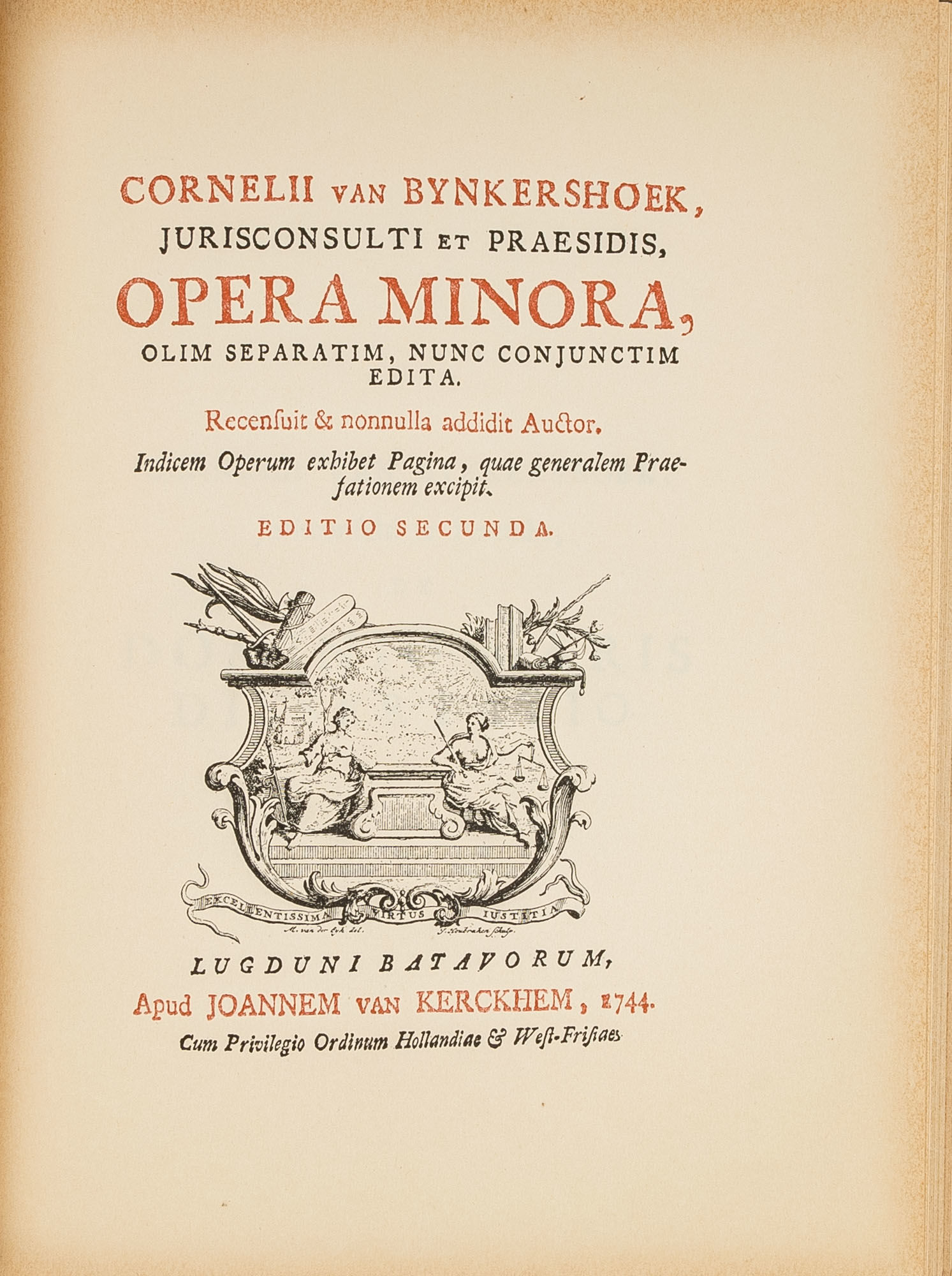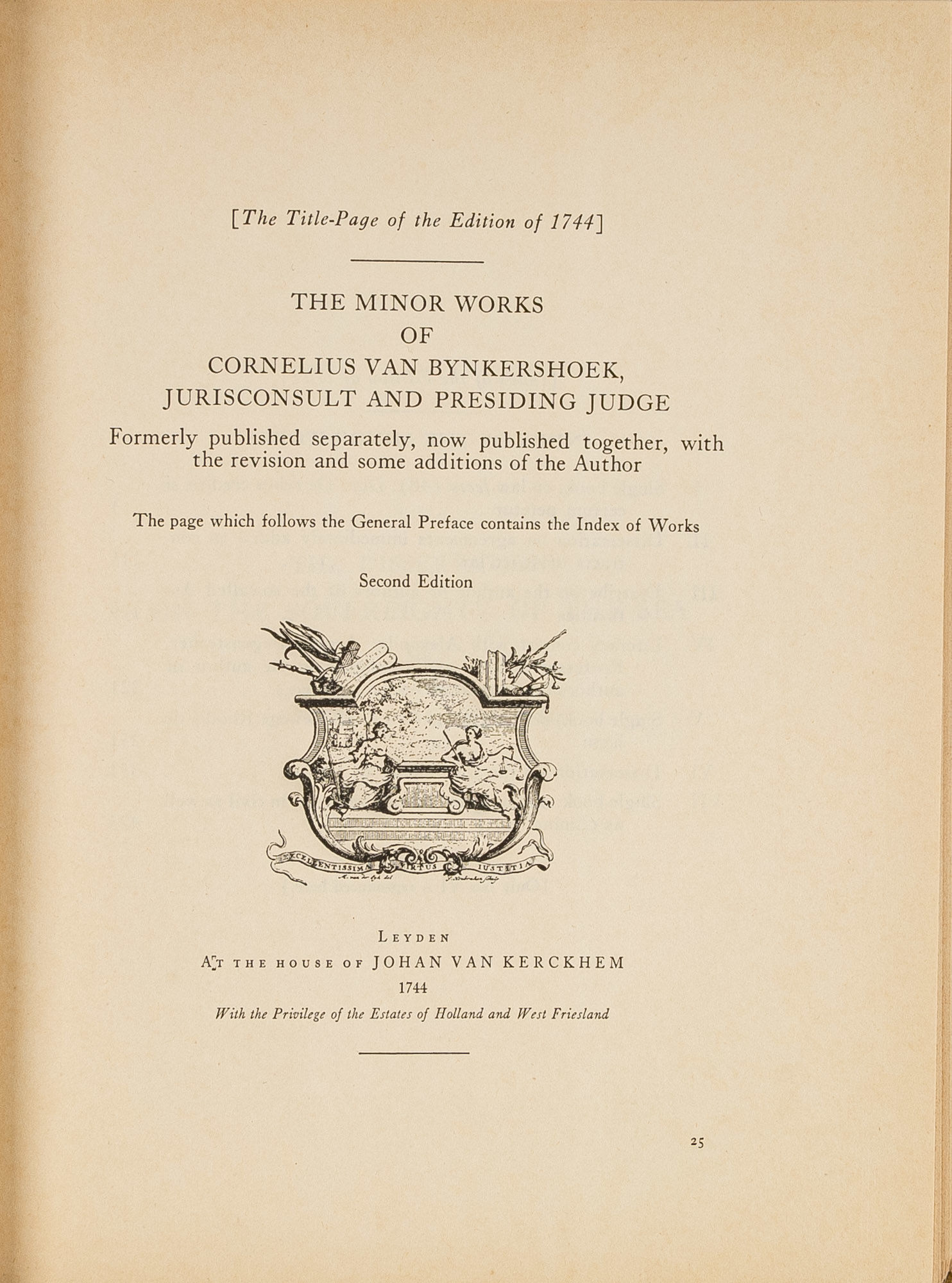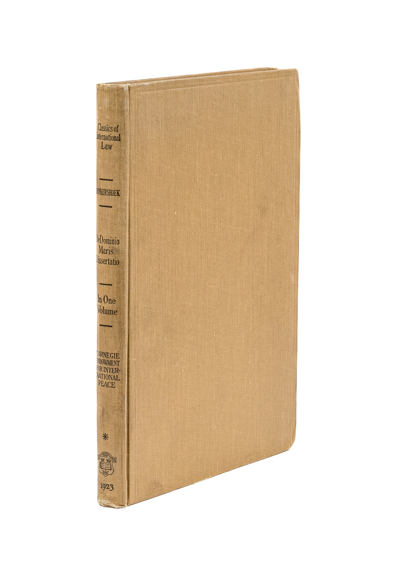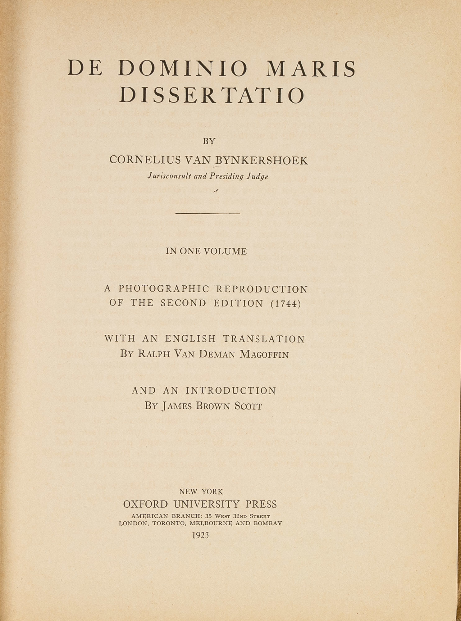 1923. Bynkershoek, Cornelius van [1673-1743]. De Domino Mares Dissertatio. The Minor Works of Cornelius van Bynkershoek, Jurisconsult and Presiding Judge. Introduction by James Brown Scott. Translated by Ralph Van Deman Magoffin. New York: Oxford University Press 1923. 429, [3] pp. Publisher's cloth, lightly rubbed and soiled, bookplate to front pastedown, some light pencil annotaions to front free endpaper, otherwise internally clean. $95. * Carnegie Classics of International Law series. Reproduction of the second edition of 1744 and the English translation. Latin and English translation in one book.