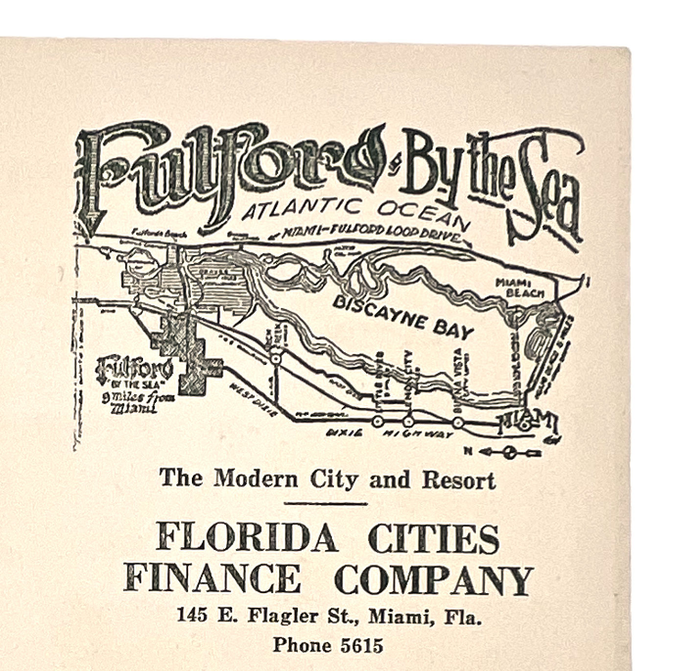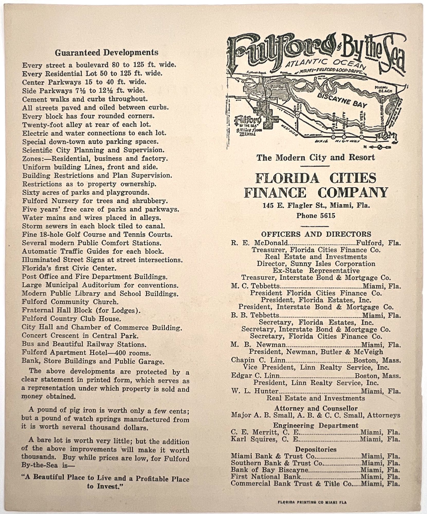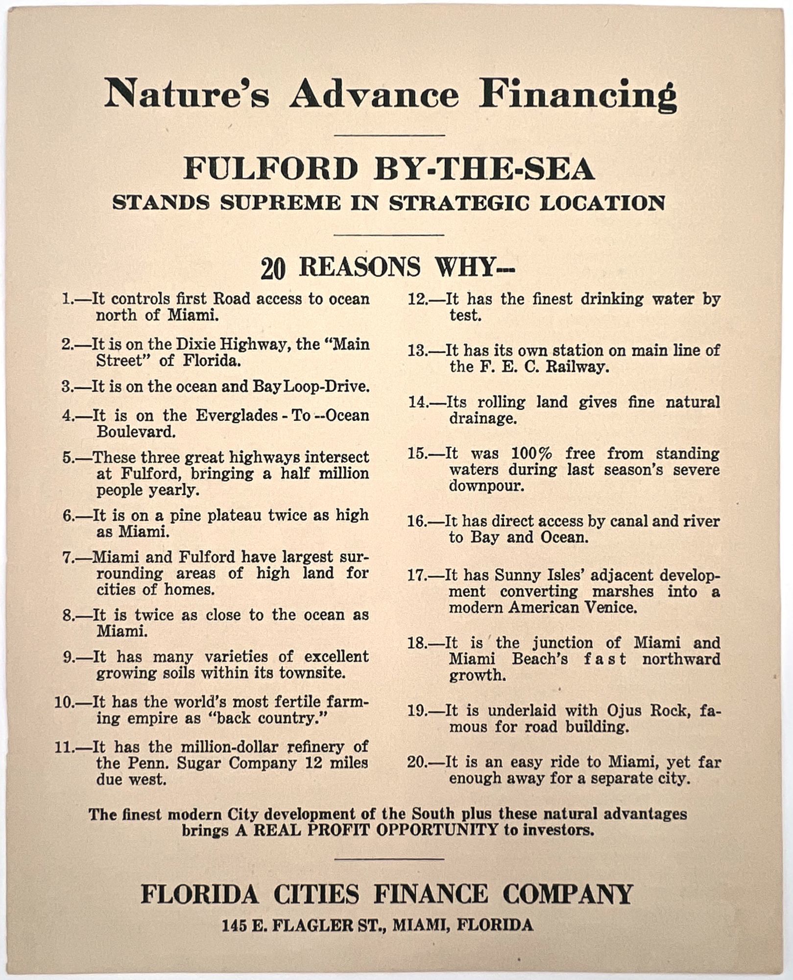 Miami, Florida: Florida Cities Finance Company, 1927. Near-fine.. Printed handbill marketing a new Miami housing development as "The finest modern City development of the South" and "a Real Profit Opportunity to investors". Includes "20 Reasons" to invest in the project, including: "It controls first Road access to ocean north of Miami"; "It has the finest drinking water by test"; and "It was 100% free from standing waters during last season's severe downpour". Includes a list of guaranteed building projects, including paved streets, municipal buildings, railway stations, public works, and strict zoning regulations. Lists officers and directors of the project, as well as a small map of the area near Biscayne Bay. Single leaf printed in green measuring 8.5" by 7