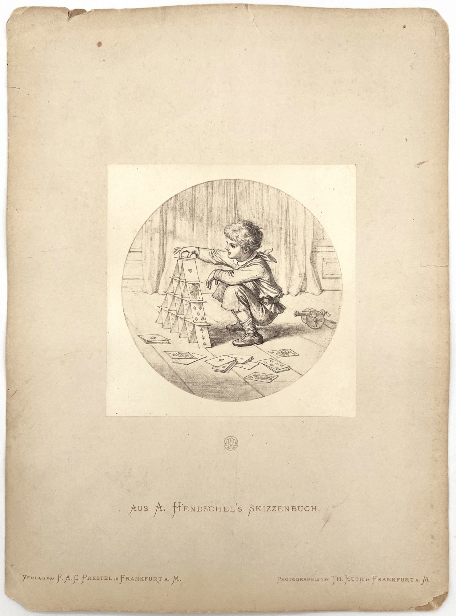 Frankfurt, Germany: F.A.C. Prestel, 1882. Very good. Toned with chipping and short tears to edges.. A single plate taken from the 1882 book of photographic reproductions of drawings by Albert Louis Ulrich Hendschel (1834-1883), titled "Lose Blätter von Albert Hendschel". This plate depicts his sketch of a little boy placing the final layer on his house of cards. The photographer responsible for the reproductions is listed as "Th. Huth". of Frankfurt. Plate measures approx. 12" by 9". Plates usually housed loosely in publisher's album, not present here.