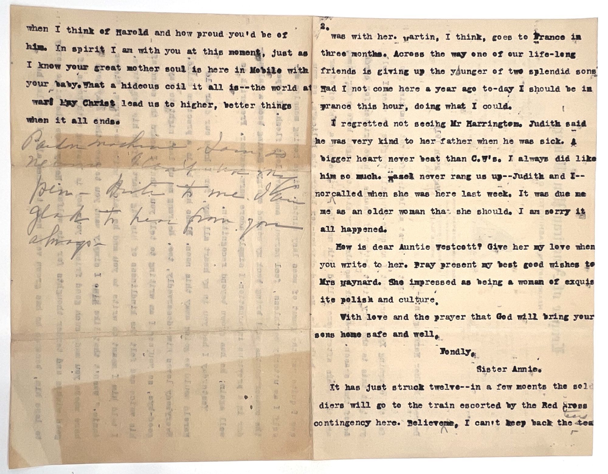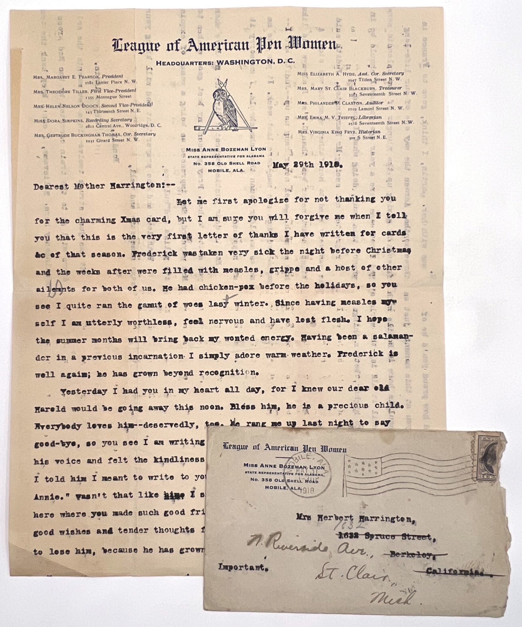 Mobile, Alabama, 1918. Very good. Toned, letter folds. Spotting and tear to envelope.. Typewritten letter on official letterhead for the League of American Pen Women, from "Sister Annie" (i.e. Anne Bozeman Lyon of Mobile, Alabama) to Mrs. Herbert Harrington, dated May 29th 1918. The writer relays personal news (Frederick has recovered from an illness, your son Harold has a big heart and will be missed when he leaves for war, etc.). Written before the end of the war in November of that year the postscript here reads, "It has just struck twelve—in a few moments the soldiers will go to the train escorted by the Red Cross contingency here. Believe me, I can't keep the tears when I think of Harold [the recipient's soldier son?] and how proud you'd be of him. In spirit I am with you at this moment, just as I know your great mother soul is here in Mobile with your baby. What a hideous coil it all is—the world at war! May Christ lead us to higher, better things when it all ends." Single leaf of letterhead (11" by 8.5"), envelope measures 3.5" by 5.75" with ink revision to typewritten address. Postmarked and stamped. Anne Bozeman Lyon (1860-1936) was a prominent Southern writer from Mobile, Alabama who penned novels, articles, columns and poetry, earning her a place in the 1893 biographical dictionary "A Woman of the Century". By 1918, she had joined the National League of American Pen Women, providing the letterhead here.