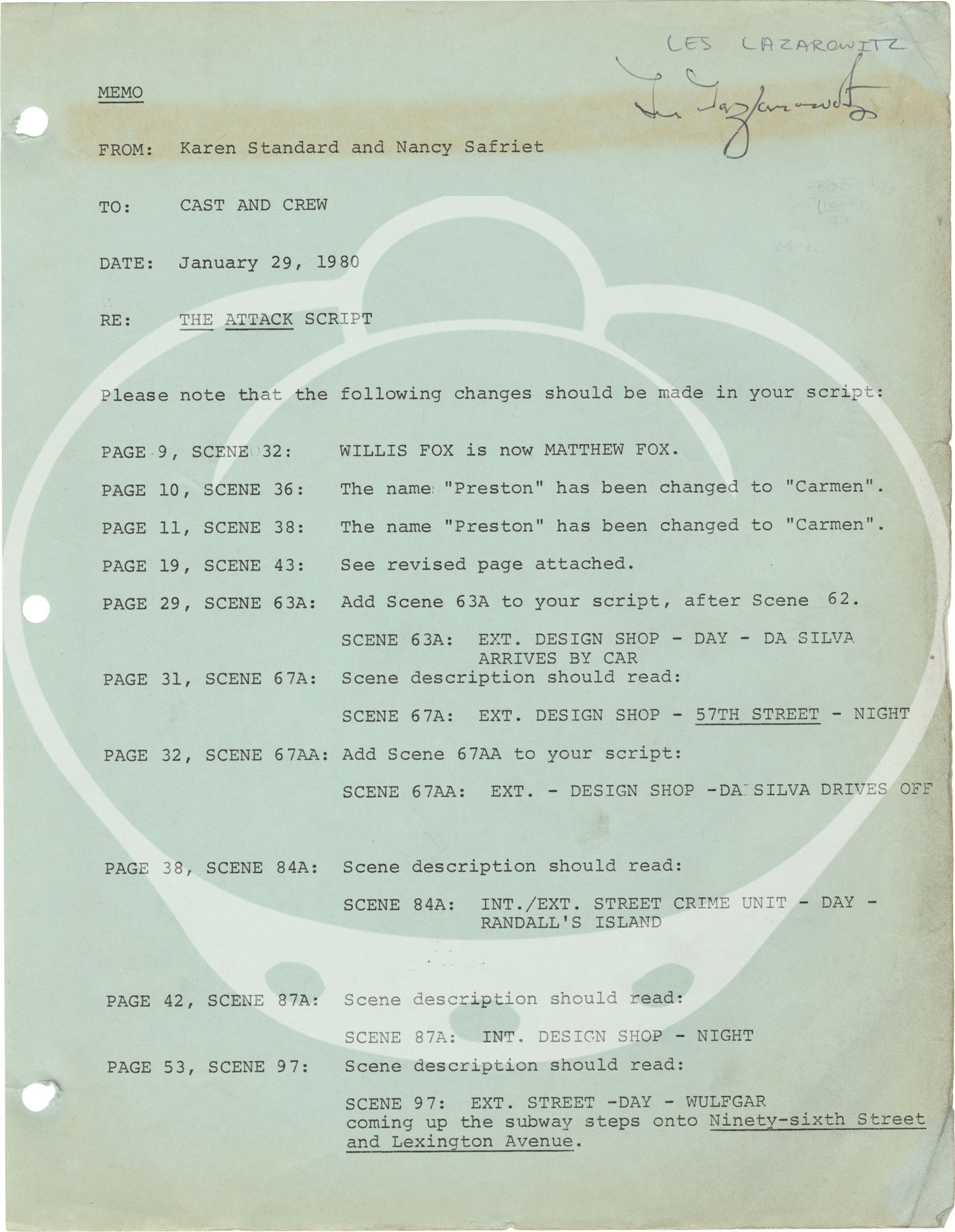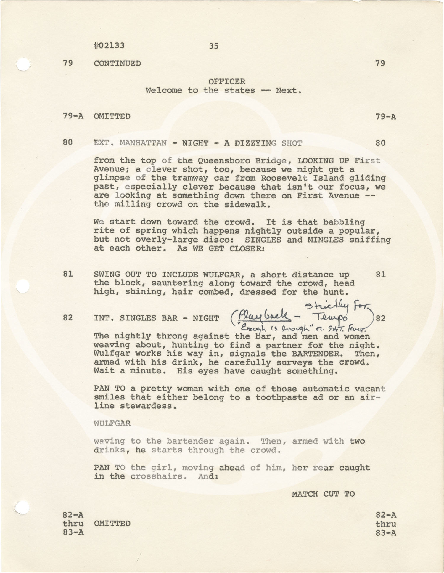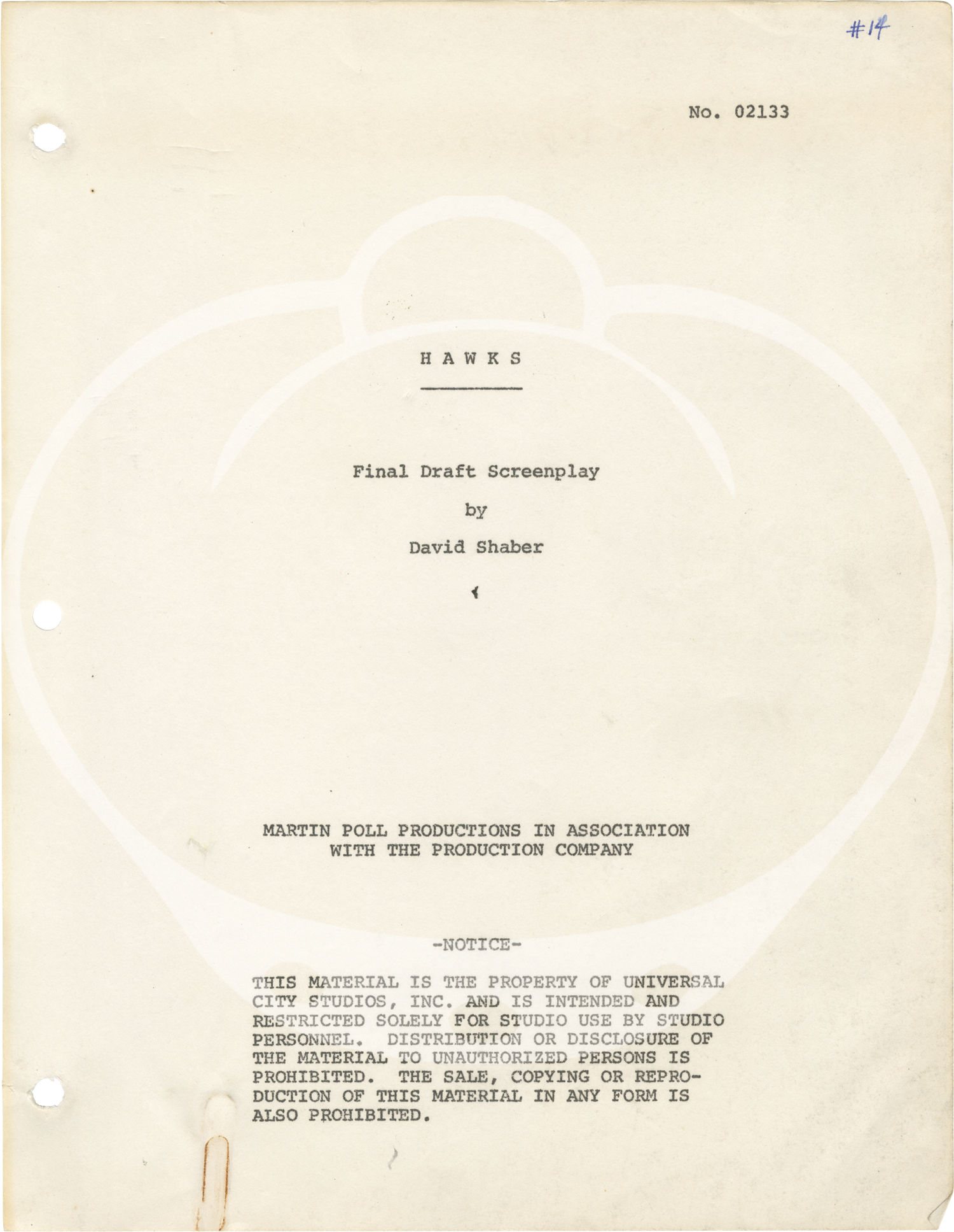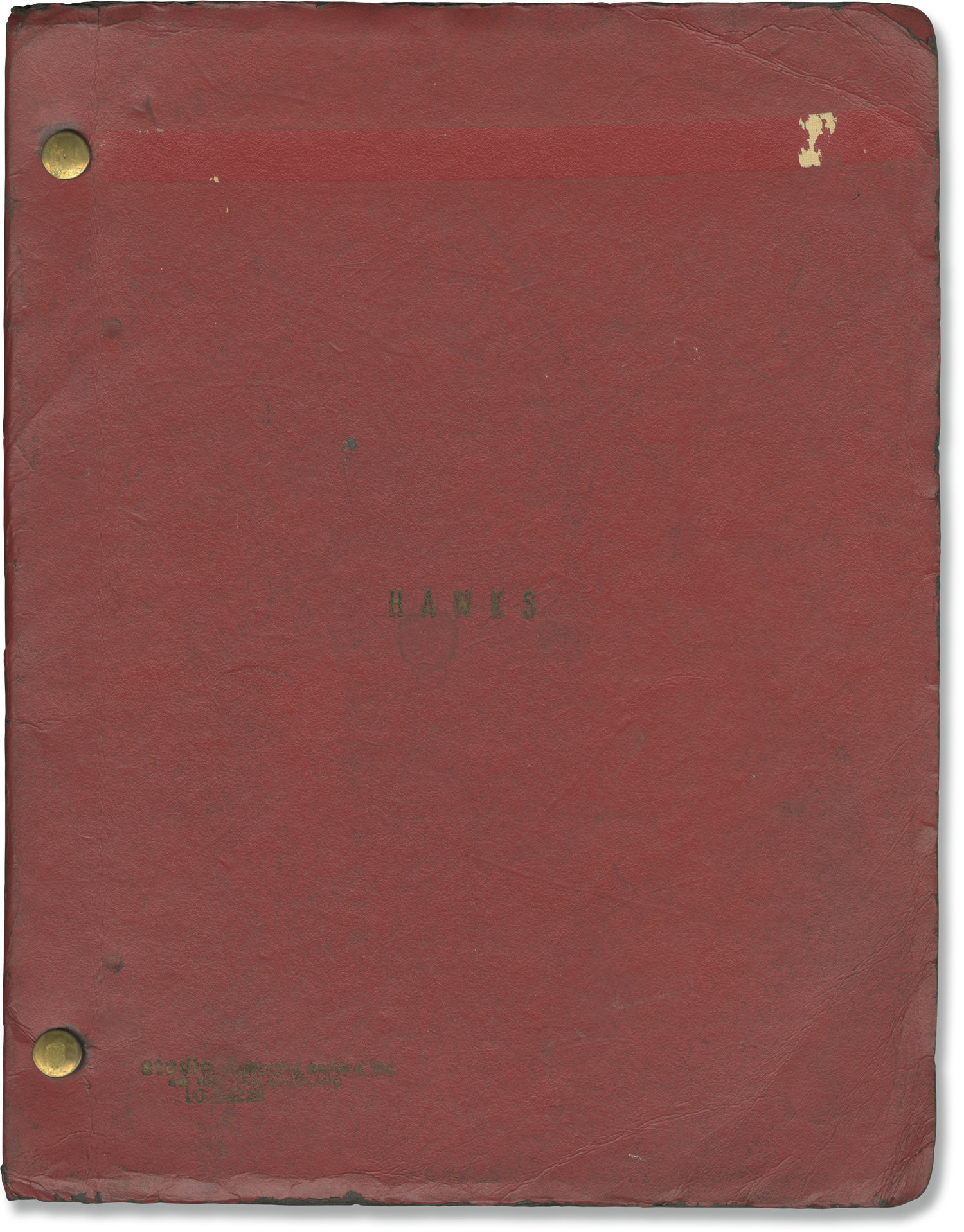 Universal City, CA: Universal Pictures, 1980. Final Draft script for the 1981 film, seen here under the working title "Hawks." Copy belonging to sound mixer Les Lazarowitz, with his name in manuscript ink on several pages, and his profuse annotations throughout.