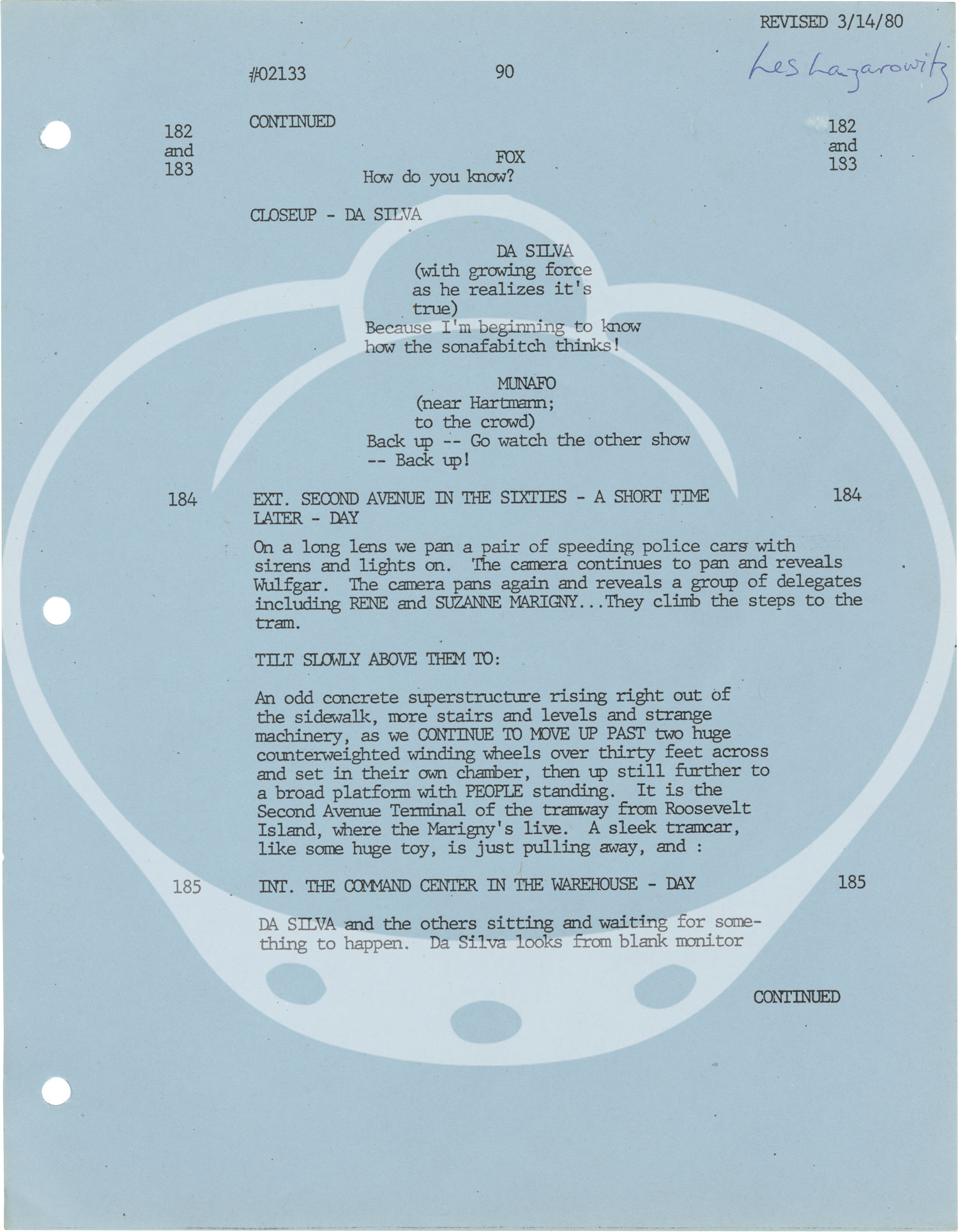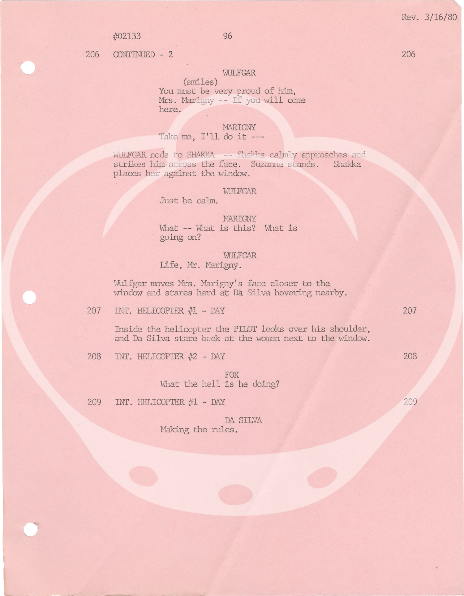 Red titled Studio Duplicating Service wrappers. Title page present, undated, noted as Final Draft Screenplay and production No. 02133, with credit for screenwriter David Shaber. Xerographic duplication, rectos only, with pink and blue revision pages throughout, dated variously between 3/14/80 and 3/16/80. 127 leaves, with last page of text numbered 121. Pages Very Good plus, wrapper Very Good plus, with a small chip on the top right corner of the final leaf, bound with two gold brads.