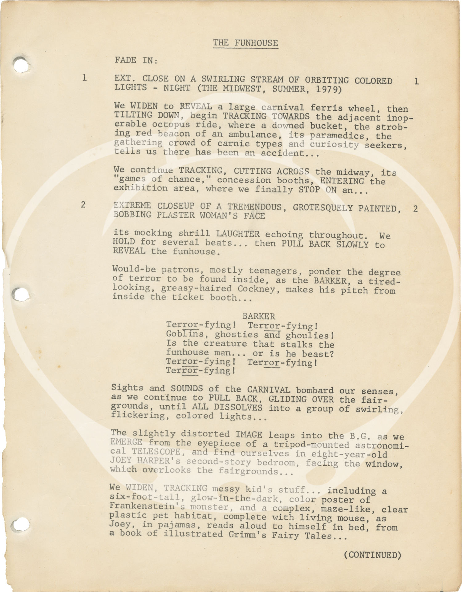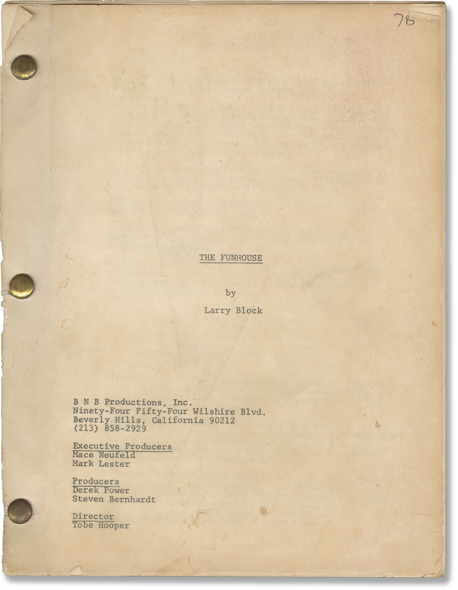 Self wrappers. Title page present, undated, with credits for screenwriter Lawrence (Larry) Block and director Tobe Hooper. 113 leaves, with last page of text numbered 112. Xerographic duplication, rectos only. Pages Very Good plus, with first and last leaves moderately worn, bound with three gold brads.