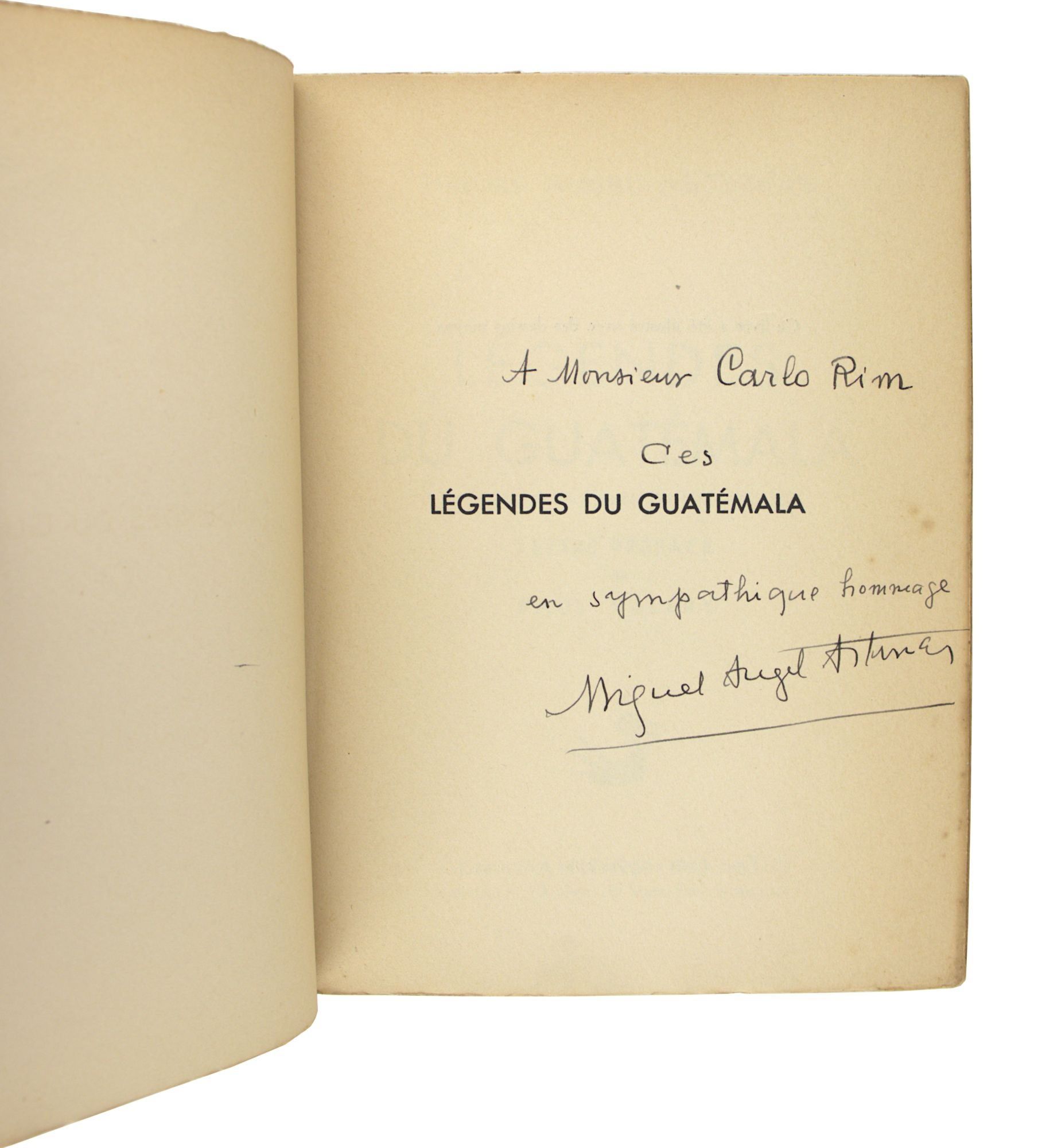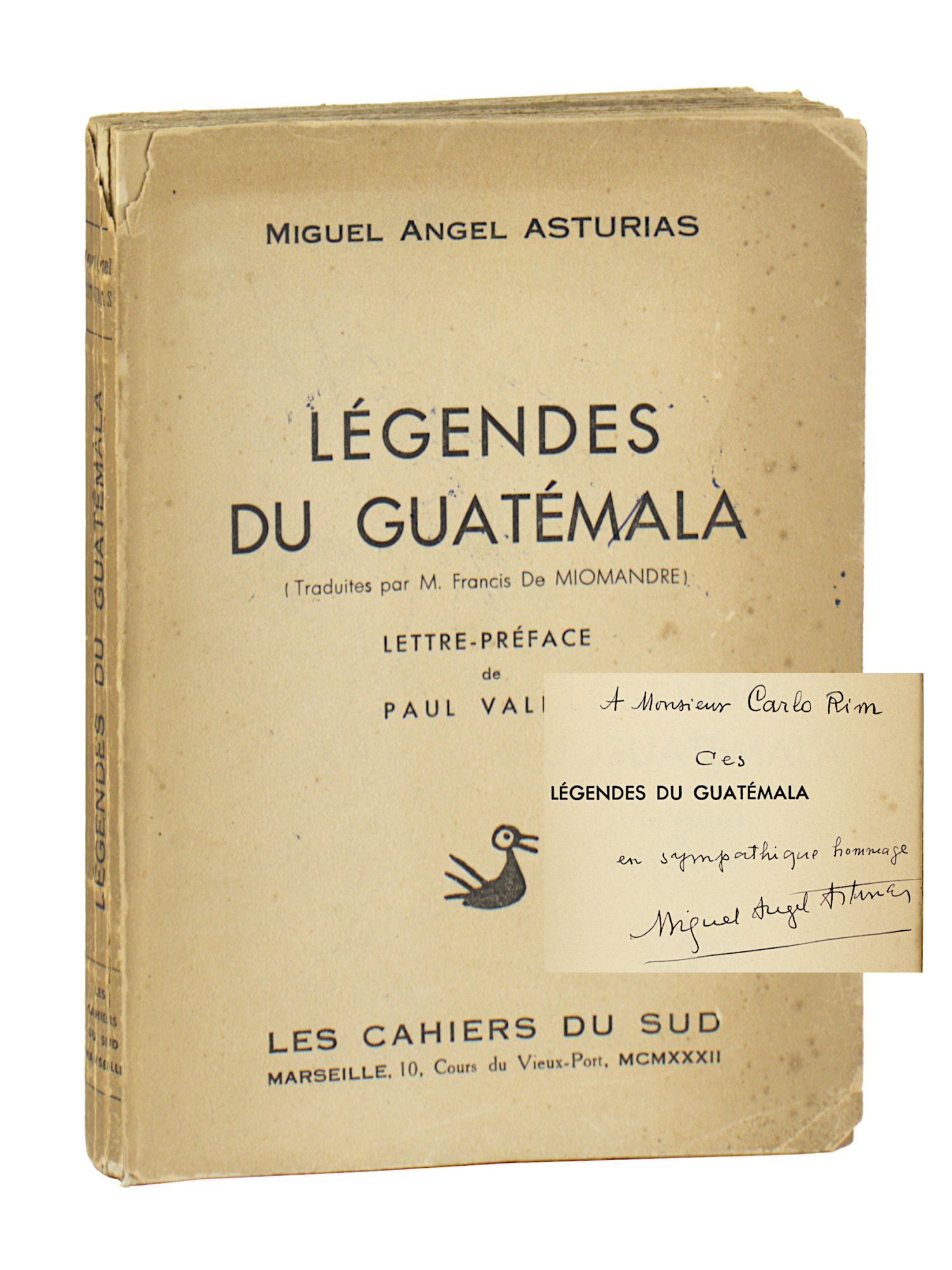 Marseille: Les Cahiers Du Sud, 1932. Very Good. Marseille: Les Cahiers Du Sud. 1932. First French Edition, from a total print run of 1000 copies, this copy one of 100 copies printed on alfa and stamped "SP." Signed at front free endpaper by Asturias to French screenwriter and director Carlo Rim with brief inscription. Octavo. 135 pp. Black and white illustrations. Illustrated wraps. Toning and spotting to wraps with chipping and creasing to edges; small patch of loss at crown; creasing and split along spine. Brief separation at front hinge but binding holding. Occasional spotting and smudging to interior, most heavily at "Legende du Sombreron" though text legible throughout. Still a Very Good copy of the second edition of Asturias' first published book, an exploration of pre-Columbian Mayan myths and how they shaped Guatemalan identity.