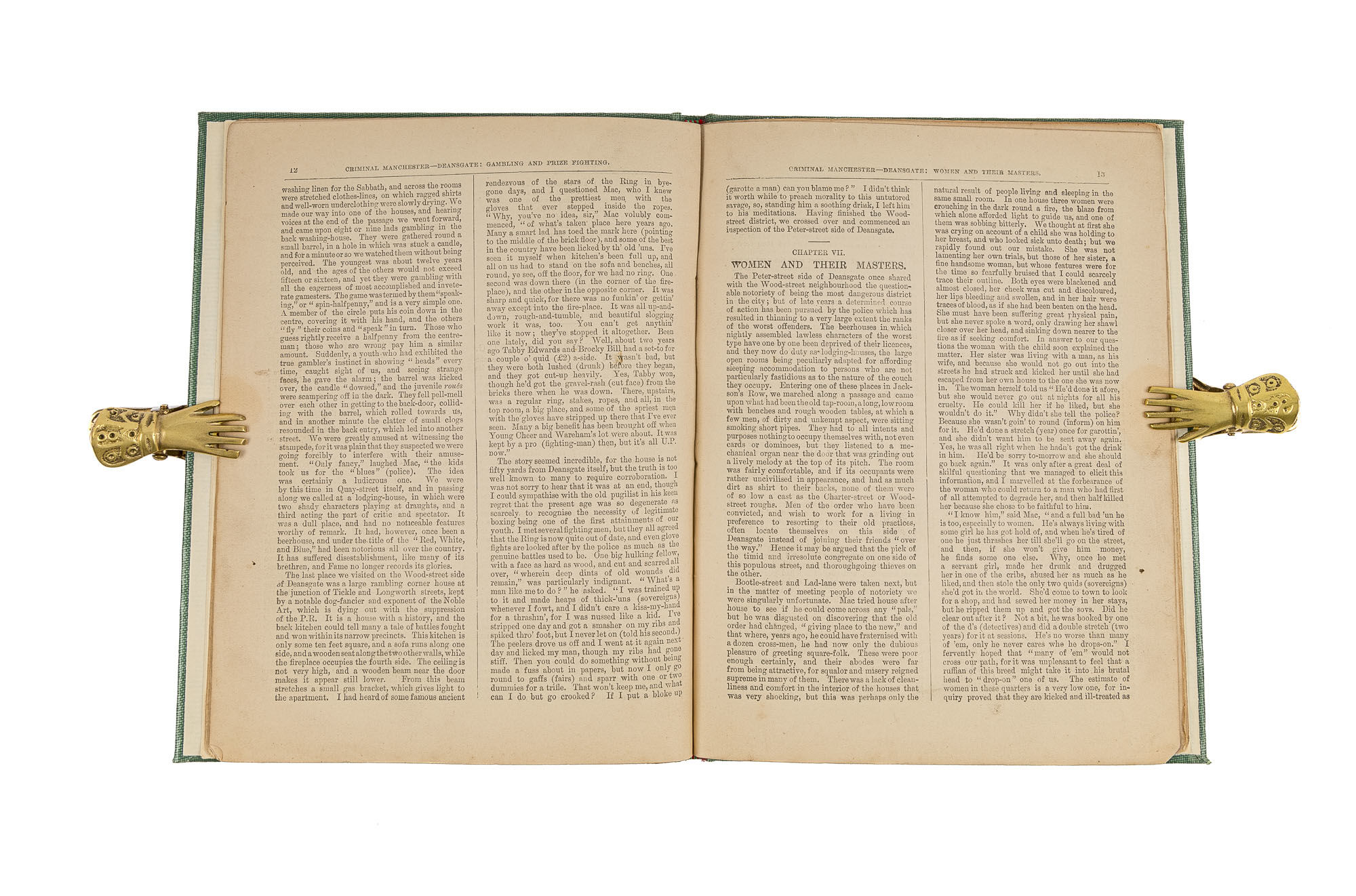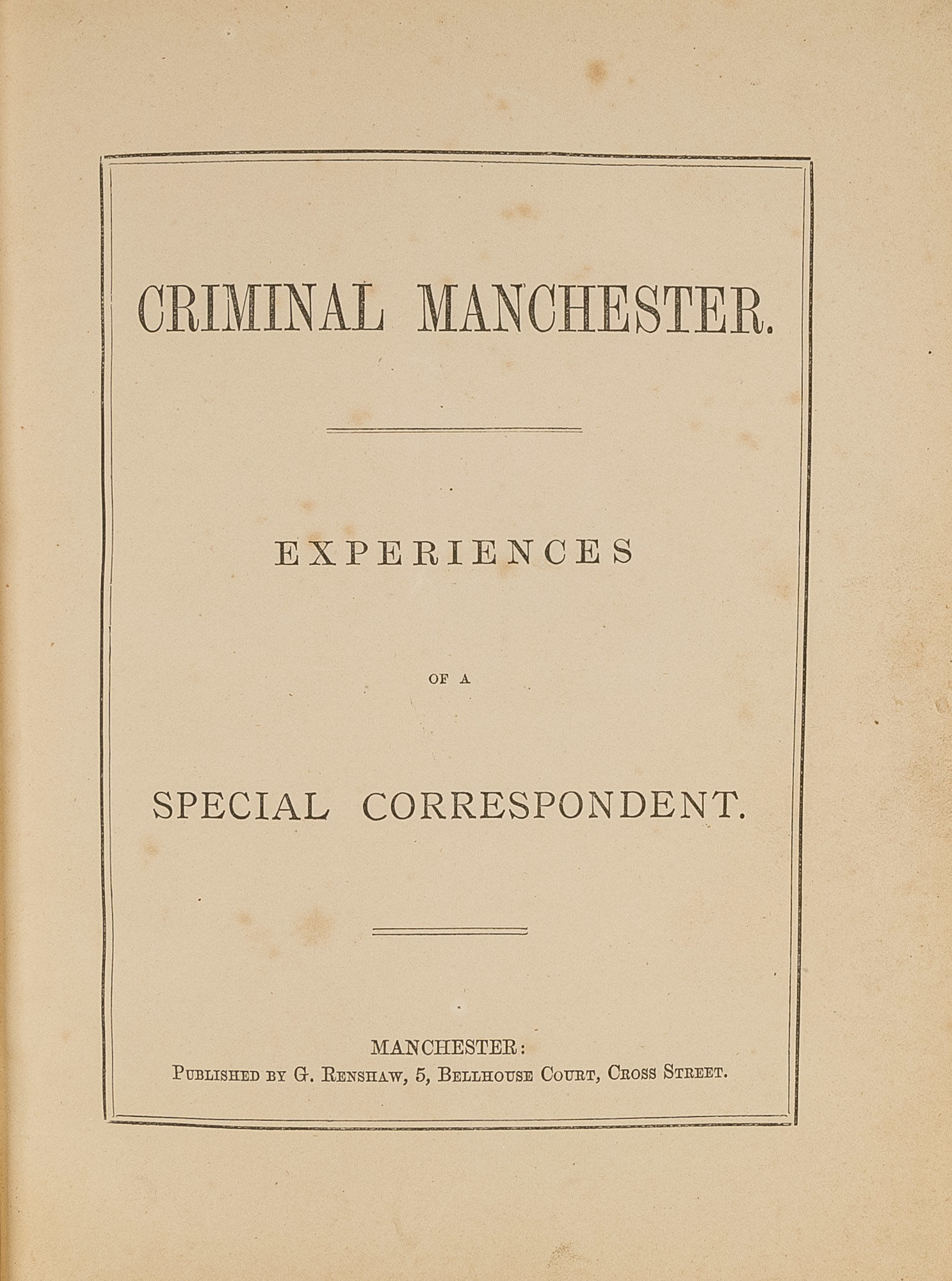 1874. A Rare Victorian Account of "Criminal Manchester" [Criminals]. [Great Britain]. Criminal Manchester. Experiences of a Special Correspondent. Manchester: Published by G. Renshaw, [c. 1874]. [ii], 21, [1] pp. text in double columns. Quarto (8-3/4" x 6-3/4"). Later buckram, textured cloth with gilt title, from original front board, affixed to front board, endpapers renewed. Moderate toning, light wear to corners of text block, negligible light stains, smudges and corner folds to a few leaves, light foxing to title page. $450. * Only edition. This book collects a series of articles by an anonymous undercover journalist and a reformed criminal that were originally published in the Manchester Evening News in, according to Chetham's Library, Manchester, 1874. Sensational, and possibly embellished, they offer a lurid contemporary account of gambling, prostitution, dog fights and other examples of Manchester's low and criminal life during the 1870s. This is a rare title. No copies listed on OCLC. One copy listed on Library Hub (Chetham's Library).