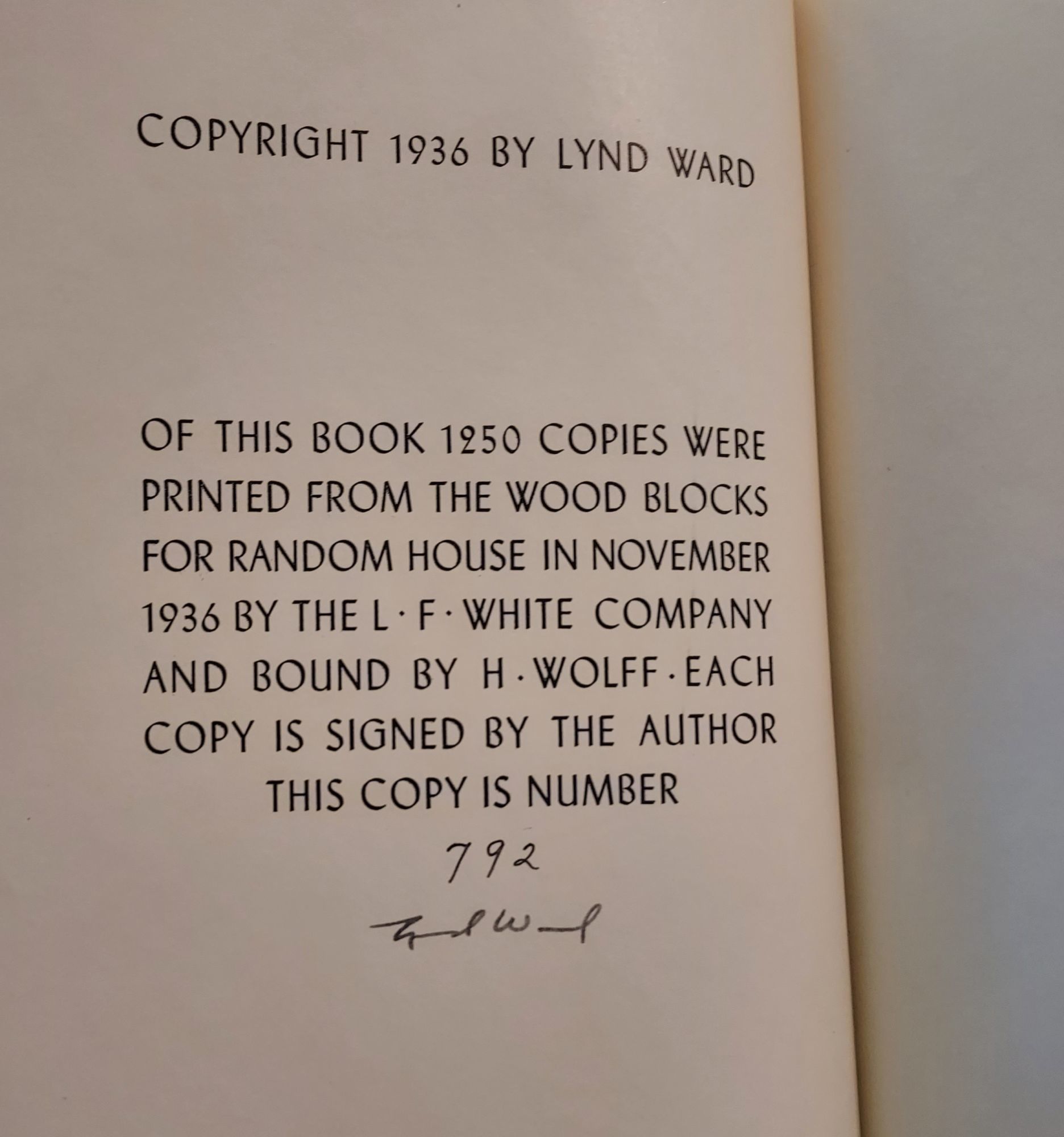 New York: Random House, 1936. First edition. Hardcover. Very Good. SIGNED. Twenty-two woodcuts. Octavo [25 cm] 1/4 cream paper over gold foil boards with paper label on the backstrip. Title page printed in red and black. Deckled fore edges. The boards are scuffed, and the spine is darkened. The endpapers are a little darkened along the hinges. In a good plus slipcase, with a couple of 2" splits at the head, and a piece of tape to the foot. Dance 009. Printed in an edition of 1250 signed and numbered copies. This is a copy of 792. Signed by the author on the limitation page. A story told entirely through wood engravings. A masterpiece from one of the giants of twentieth century illustration.