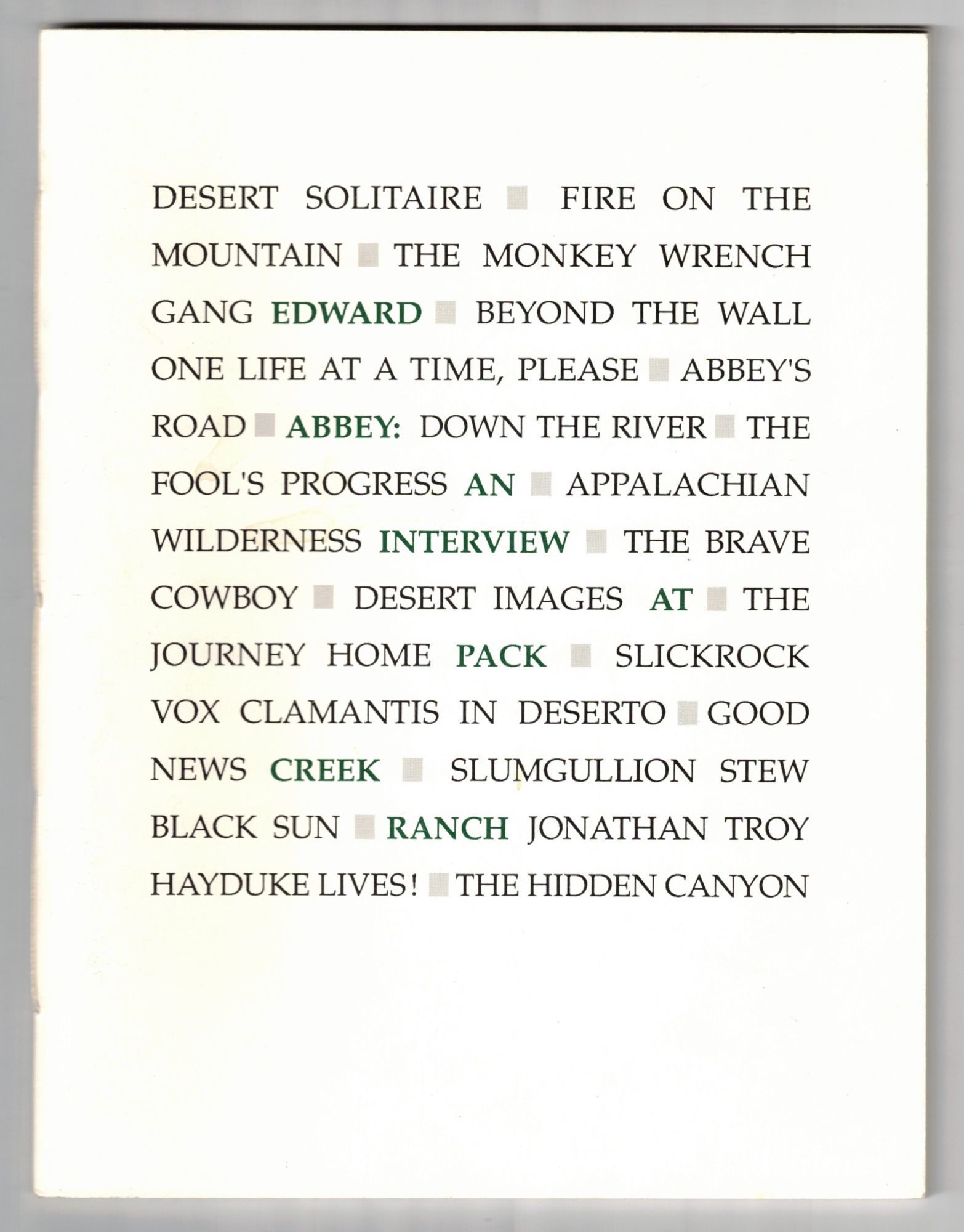 Santa Fe, New Mexico: Vinegar Tom Press, 1991. Limited Edition. Paperback. Very Good +. 37pp. Octavo [21.5 cm] White, black and green printed wraps, with a sewn binding. Edition of 125 numbered copies in hand-sewn wrappers and 26 hand-bound, lettered copies. This is copy 70 of 125. With rear wrap shows very light shelfwear. "I'll not attempt to interpret, categorize, define or in any way unravel Edward Abbey. I won't call him an iconoclast, guru, anarchist, essayist, humorist, novelist, naturalist or desert rat. Why? Because Edward Abbey is Edward Abbey. Like Wendell Berry said, "No sooner has a label been stuck to his back by a somewhat hesitant well-wisher than he runs beneath a low limb and scrapes it off." - Author's preface.