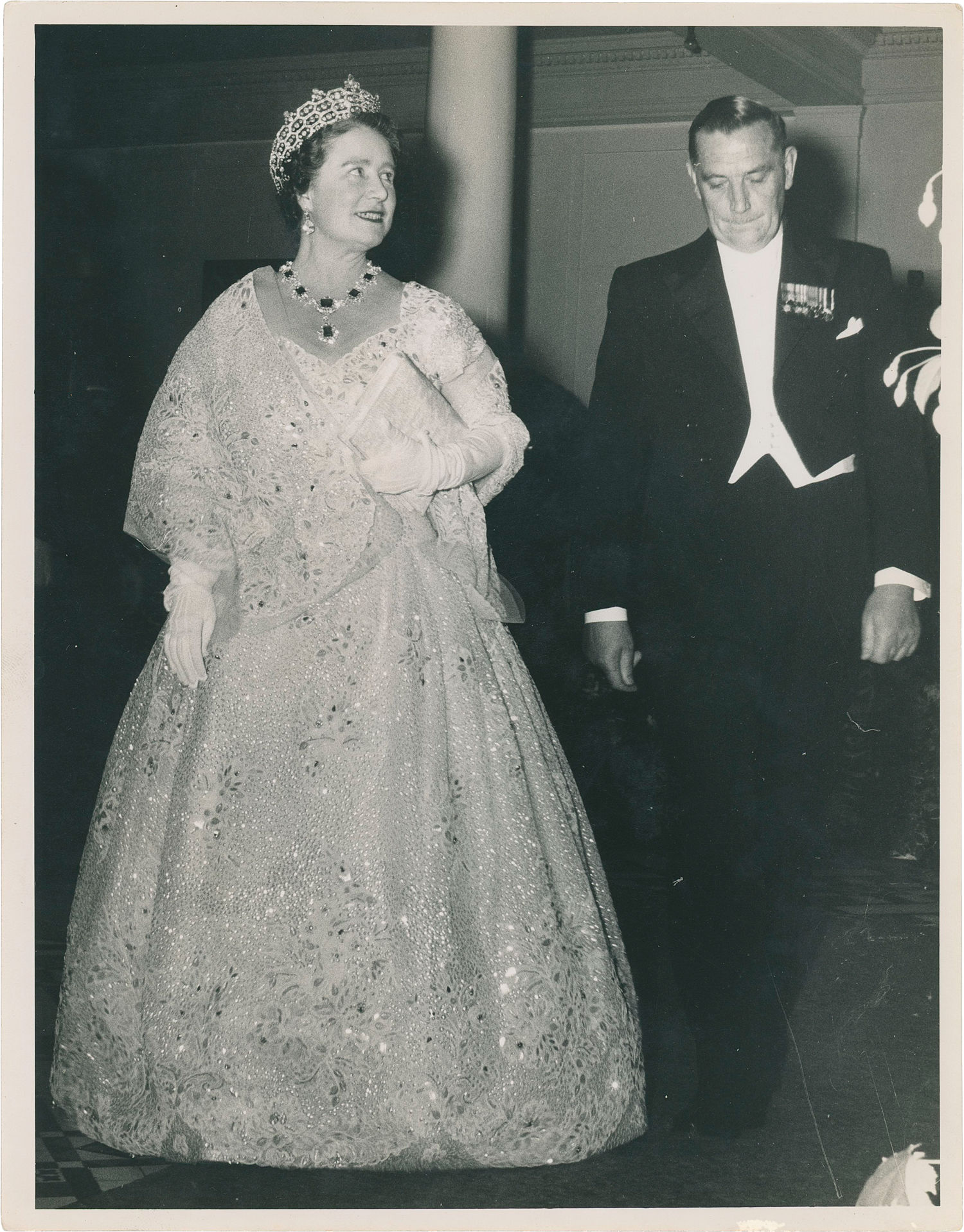 Wellington, New Zealand: Evening Post, 1958. Vintage photograph of Queen Elizabeth the Queen Mother during her 1958 tour of New Zealand. With a stamp on the verso from the Evening Post, dated February 1958.