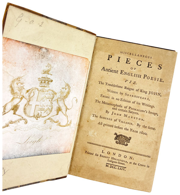 Miscellaneous Pieces of Antient English Poesie. Viz. The Troublesome Raigne of King John, Written by Shakespeare, Extant in no Edition of his Writings. The Metamorphosis of Pigmalion's Image, and certain Satyres. By John Marston. The Scourge of Villanie. By the same. All printed before the Year 1600