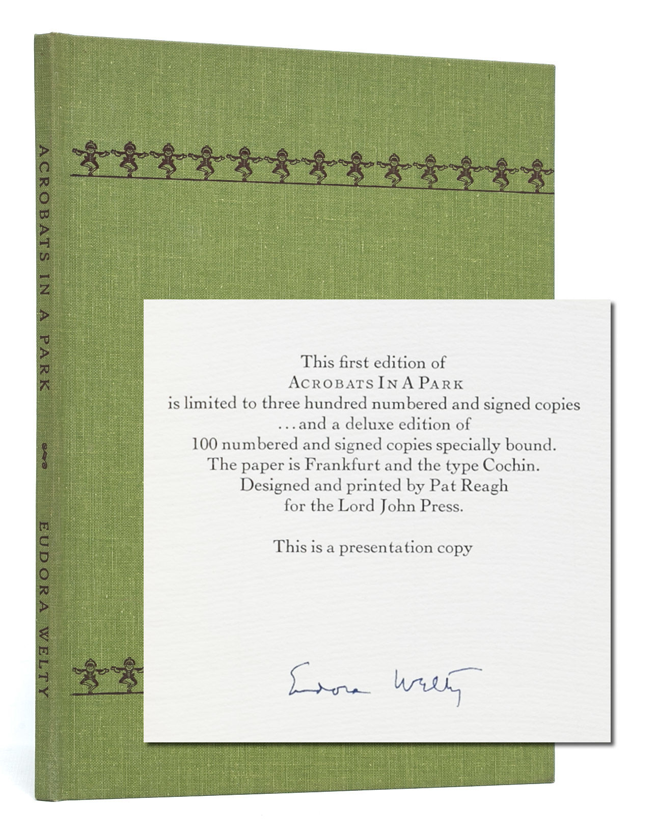 Northridge: Lord John Press, 1980. First thus. Fine. Presentation copy, outside of the three hundred numbered and signed copies and the hundred deluxe editions, signed by the author on the limitation page. A Fine copy bound in green cloth boards, with embossed design of acrobats on front board and right marbled endpapers. Interior as new.